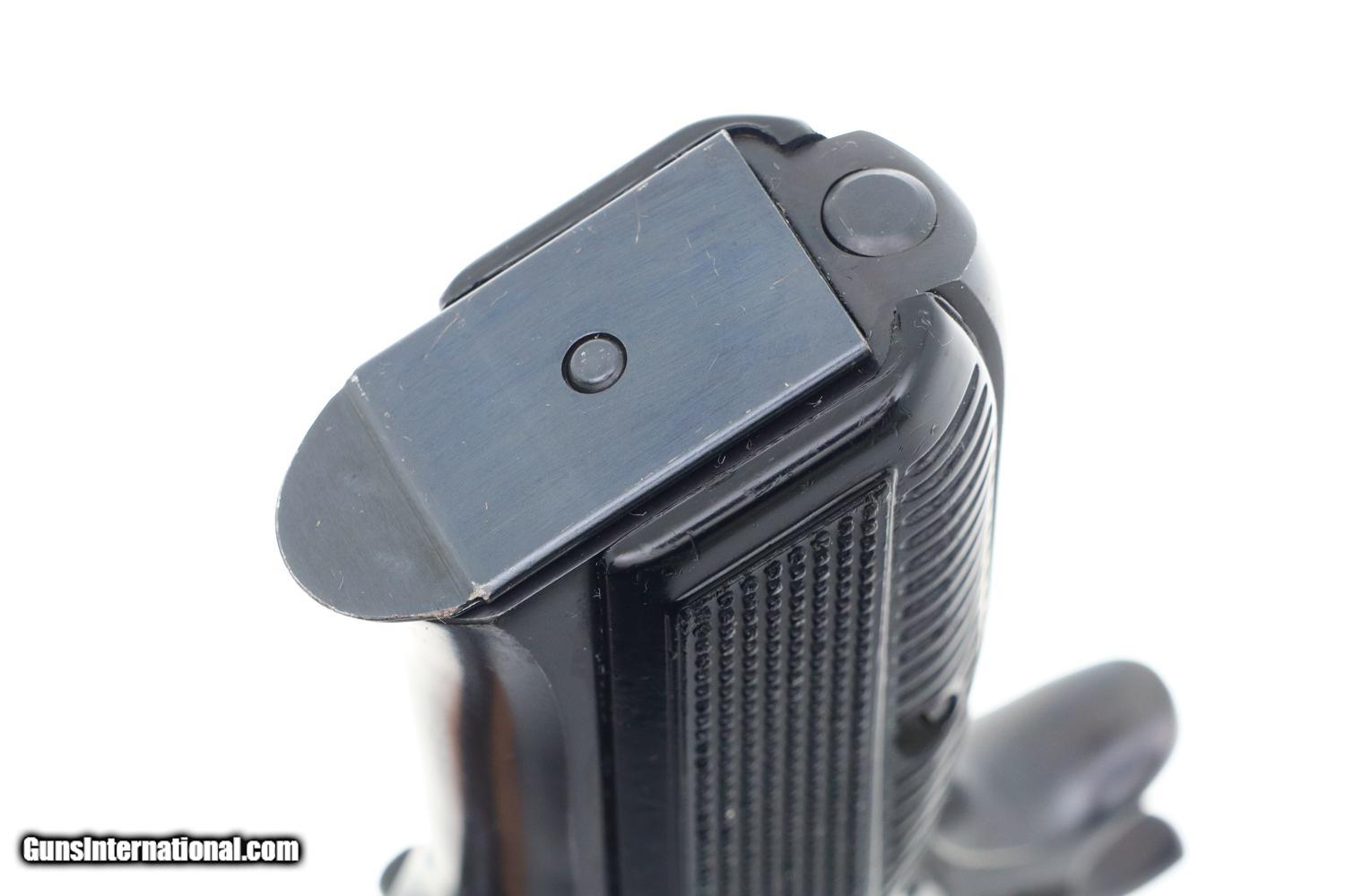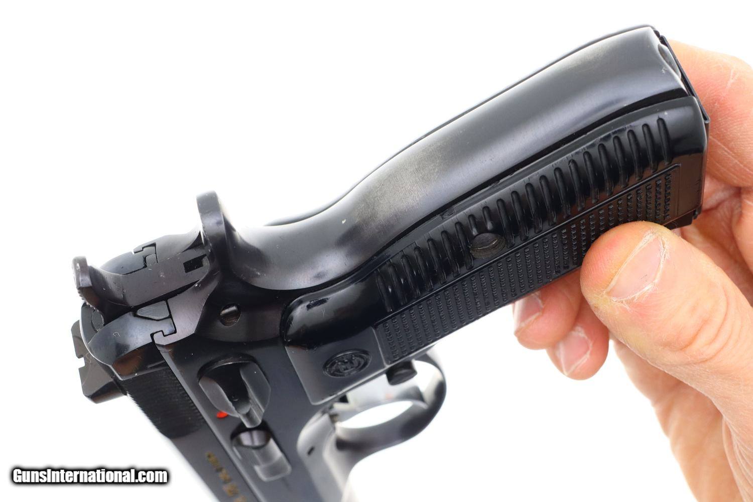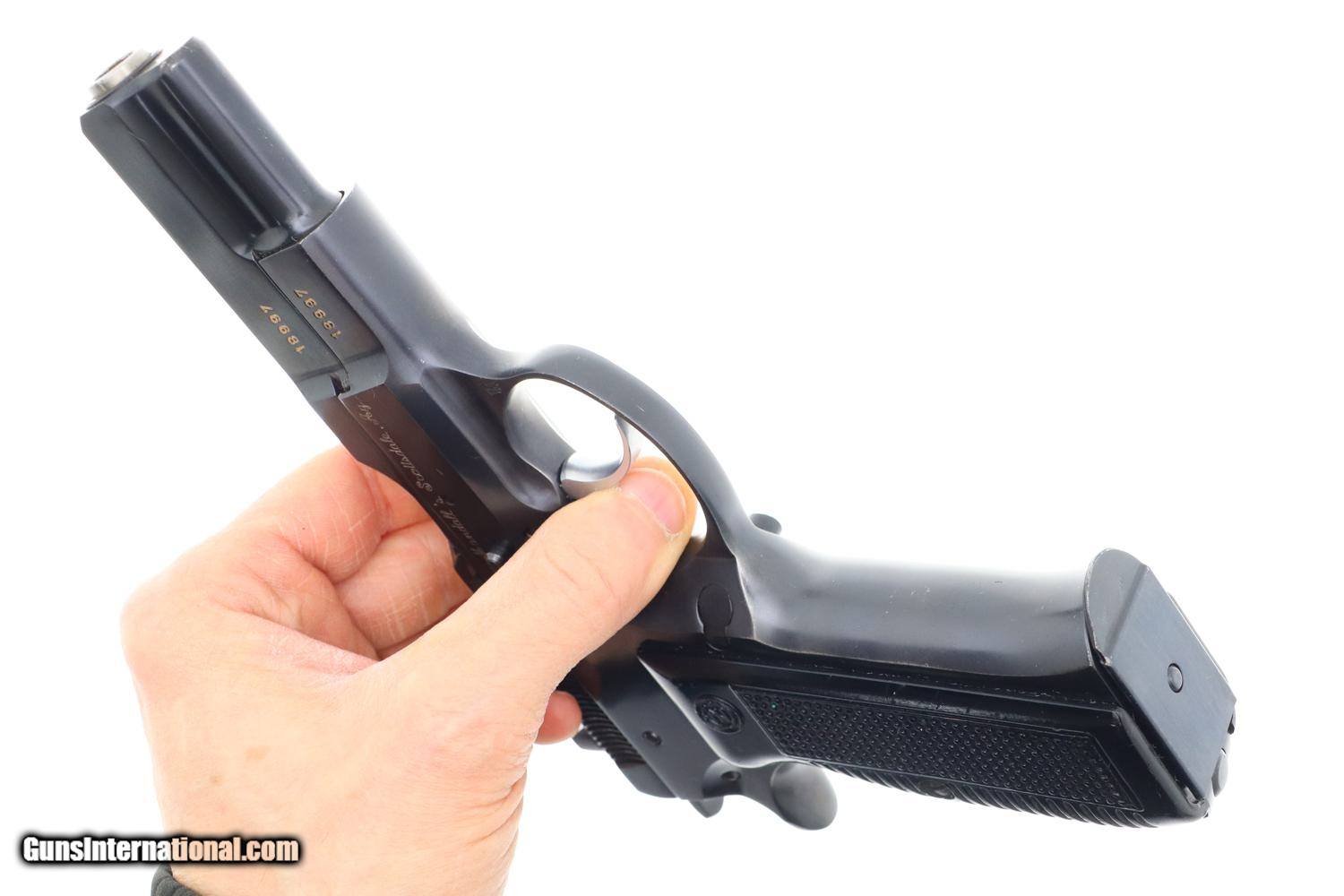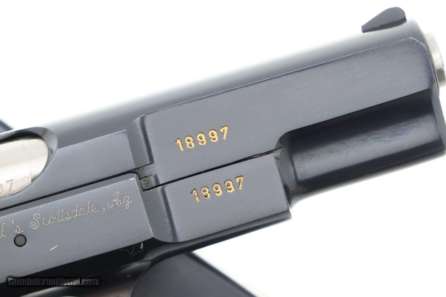 Description: Synopsis: Beautiful, Early CZ 75 Pistol, Short Rail, High Polish Description: This is the early, classic CZ 75 pistol, 9mmP, SA/DA, that set the stage for so many subsequent variations and copies. Fixed serrated ramp front sight and drift adjustable rear sight. Left side of slide marked with model and caliber. Location in Czechoslovakia on left side of frame. Matching serial number on slide, barrel, and frame, the slide dated 79. This example having been imported by Mandall's, Scottsdale, AZ. Factory plastic grips, each panel with the CZ logo over a molded checkered and serrated field. High capacity staggered magazine, the left side drilled with two unmarked indicator holes, the right side marked with a matching “997”, button-retained floorplate like the FN HP. No box or literature. Condition: Near EXC with negligible wear on slide and either side of frame, thinning of front and back strap as imaged. Comparable condition grips and magazine. Near mirror bore. Perfect manual mechanics. The classic CZ 75 pistol that was only made for a few years, the forerunner of numerous progeny. ~~Insured shipping fee of $65; most packages shipped using FedEx 2nd Day.~~ SOLD Manufacturer: CZ Serial Number: 18997 Caliber Info: 9mmP |