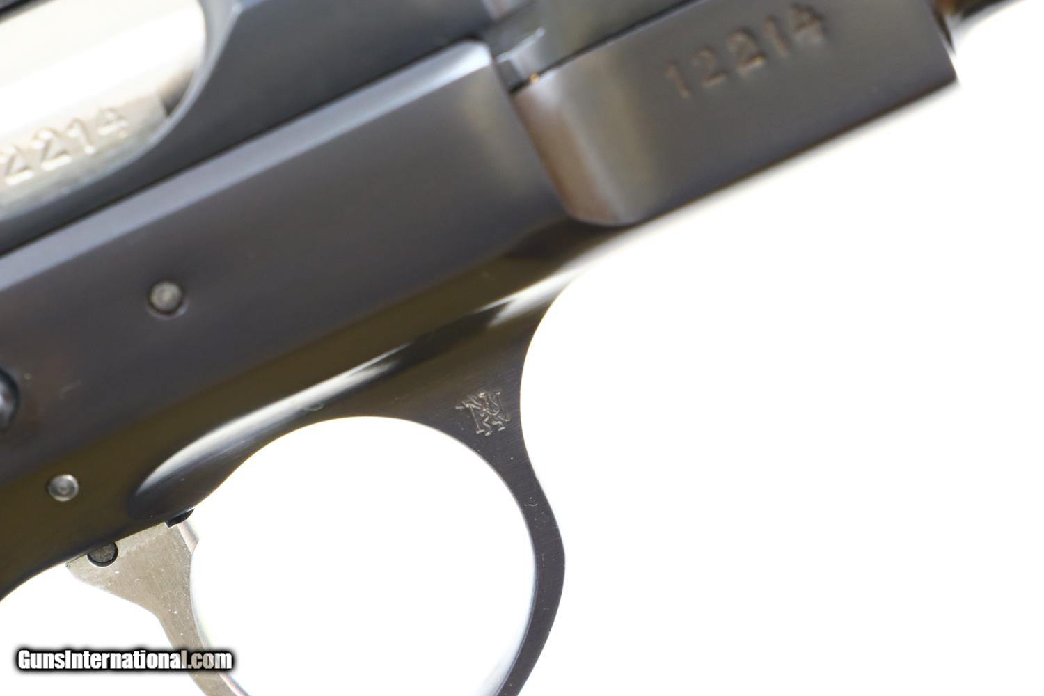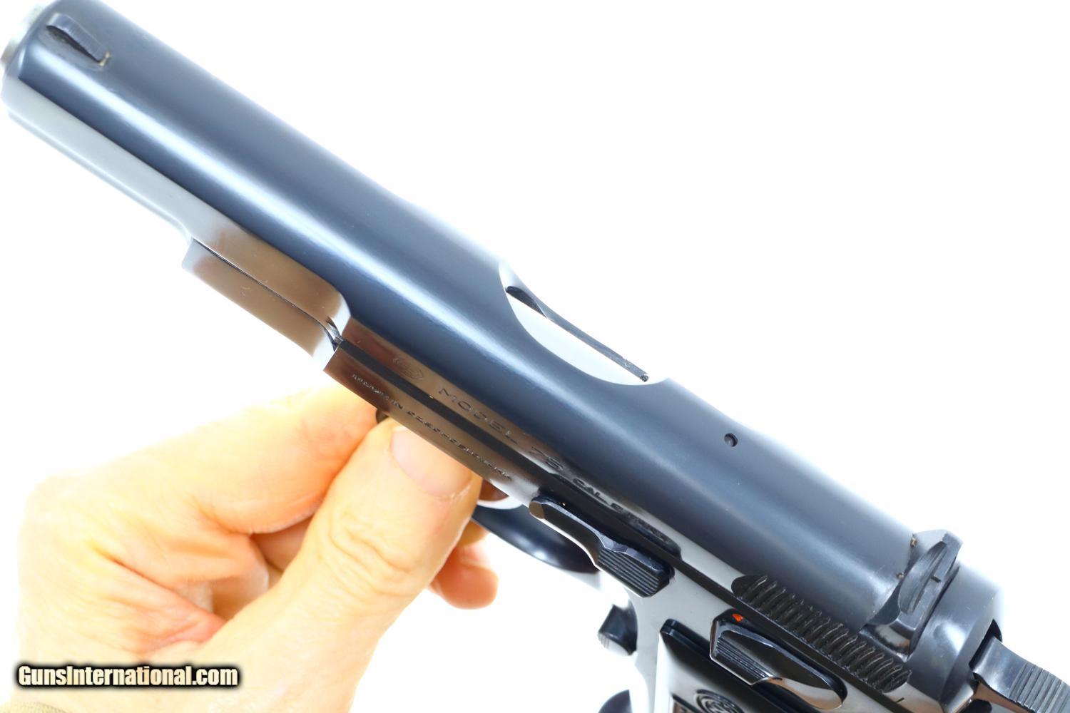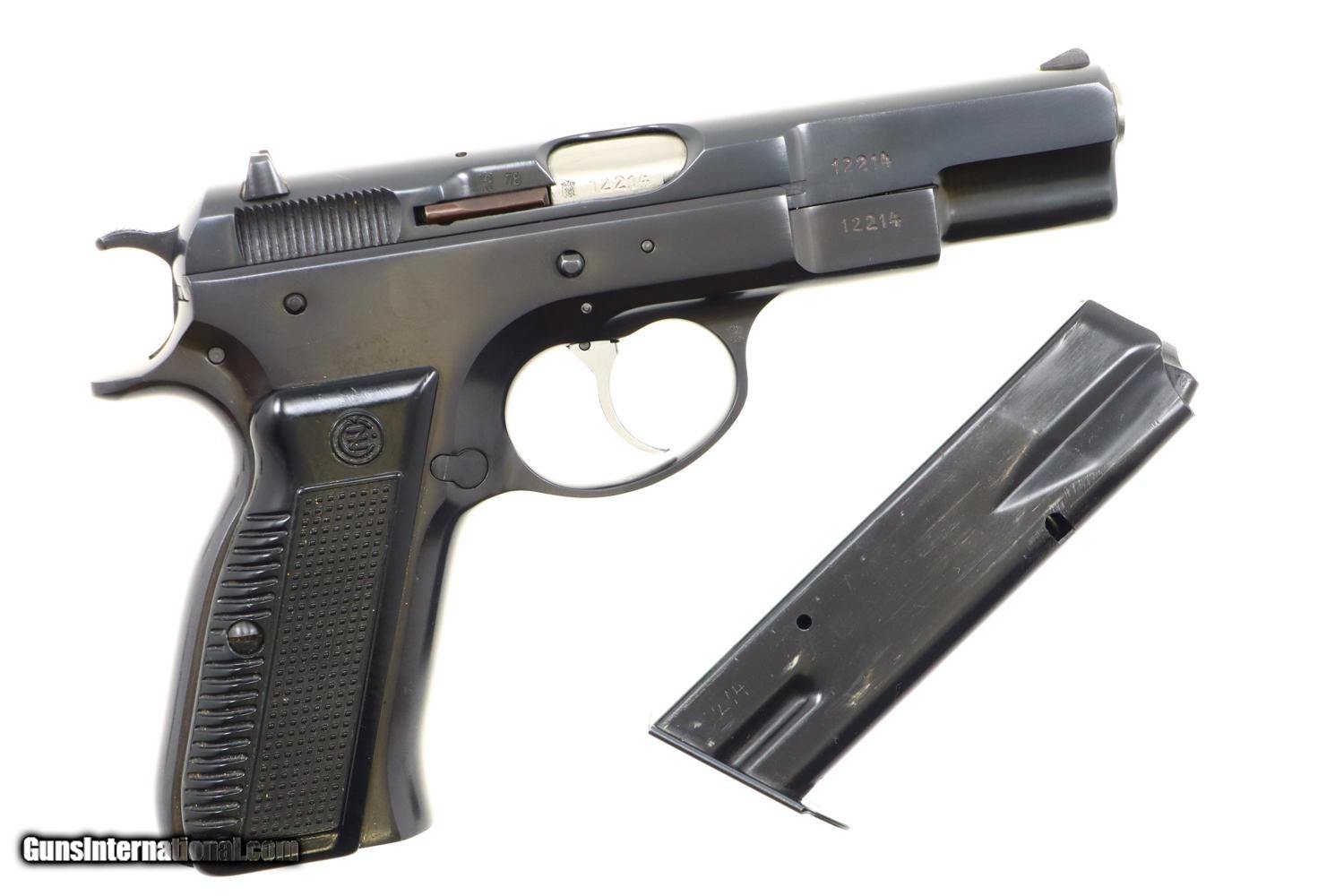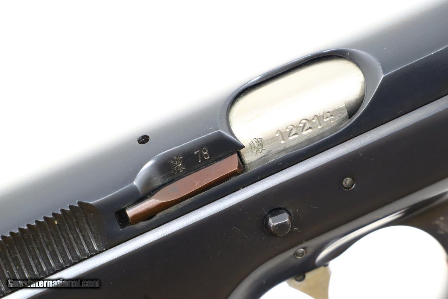Description: This is the early, classic CZ 75 pistol, 9mmP, SA/DA, that set the stage for so many subsequent variations and copies. Fixed serrated ramp, front sight and drift adjustable rear sight. Left side of slide marked with model and caliber. Location in Czechoslovakia on left side of frame. Matching serial number on slide, barrel, and frame, the slide dated 78. Factory plastic grips each panel with the CZ logo over a molded checkered and serrated field. High capacity staggered magazine, the left side drilled with two unmakred indicator holes, button retained floorplate like the FN HP. No box or literature. Synopsis: Fantastic, near new, early CZ 75 pistol, short rail, high polish. Condition: Virtually as new, the wear imperceptible except for insertional wear on the magazine. Mirror bore. Perfect manual mechanics. The only way to upgrade would be to find an example that was NIB. ~~Insured shipping fee of $65; most packages shipped using FedEx 2nd Day.~~ SOLD Manufacturer: CZ Serial Number: 12214 Caliber Info: 9mmP |