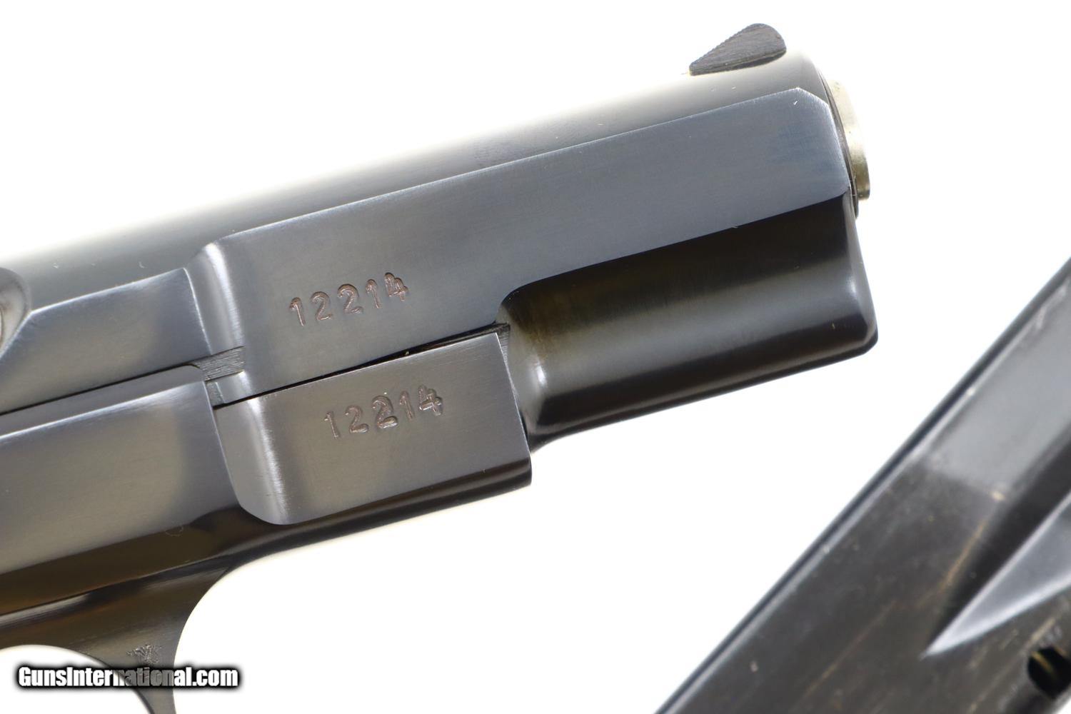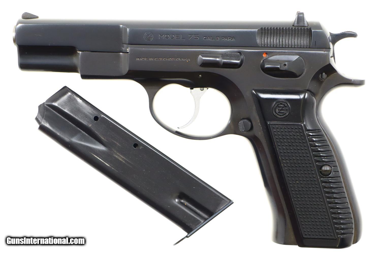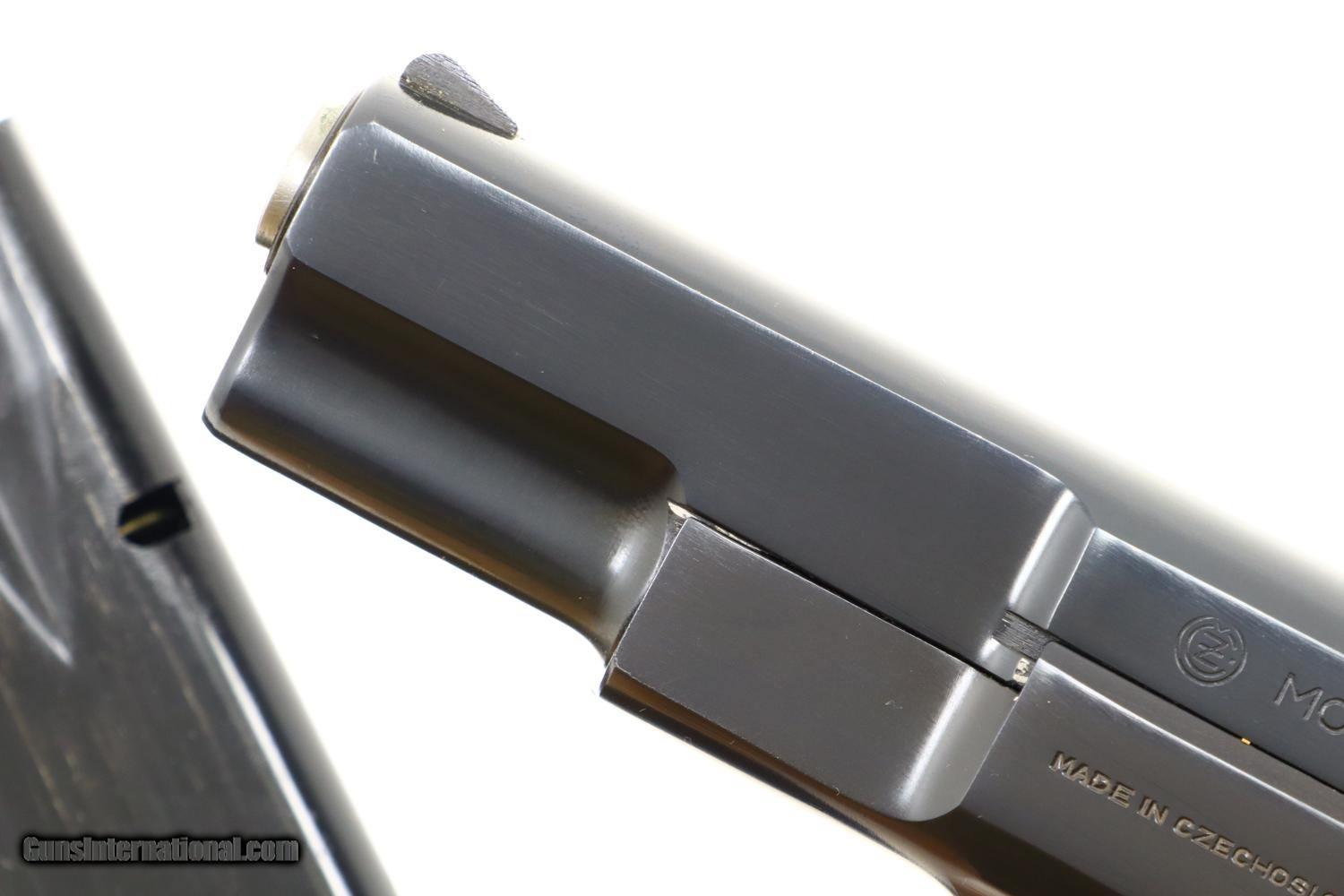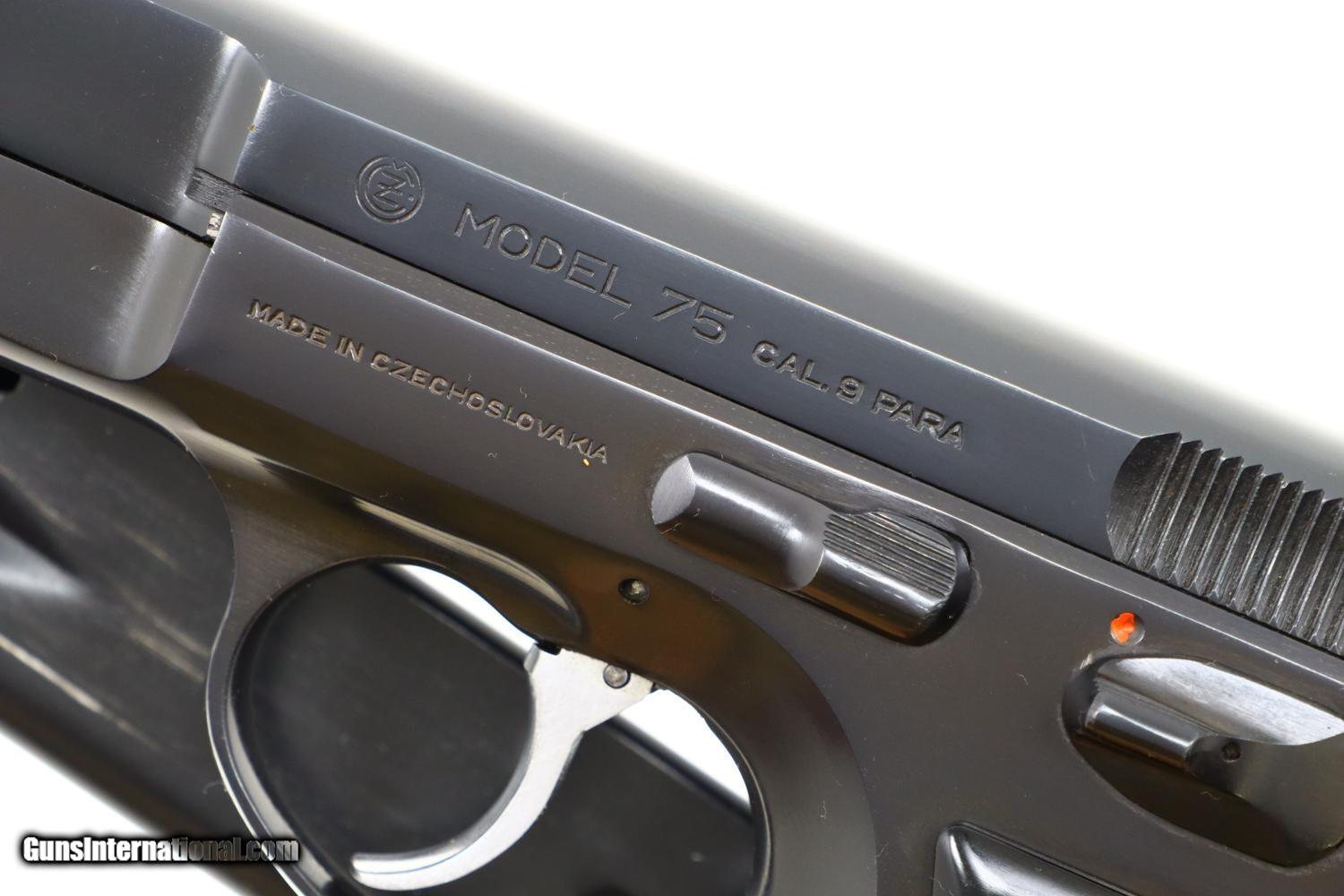 Description: This is the early, classic CZ 75 pistol, 9mmP, SA/DA, that set the stage for so many subsequent variations and copies. Fixed serrated ramp, front sight and drift adjustable rear sight. Left side of slide marked with model and caliber. Location in Czechoslovakia on left side of frame. Matching serial number on slide, barrel, and frame, the slide dated 78. Factory plastic grips each panel with the CZ logo over a molded checkered and serrated field. High capacity staggered magazine, the left side drilled with two unmakred indicator holes, button retained floorplate like the FN HP. No box or literature. Synopsis: Fantastic, near new, early CZ 75 pistol, short rail, high polish. Condition: Virtually as new, the wear imperceptible except for insertional wear on the magazine. Mirror bore. Perfect manual mechanics. The only way to upgrade would be to find an example that was NIB. ~~Insured shipping fee of $65; most packages shipped using FedEx 2nd Day.~~ SOLD Manufacturer: CZ Serial Number: 12214 Caliber Info: 9mmP |