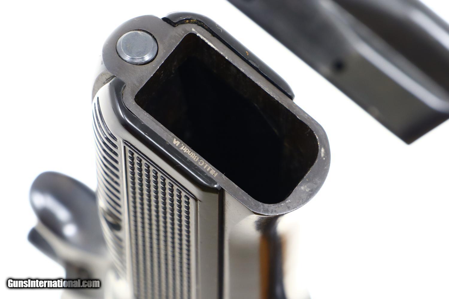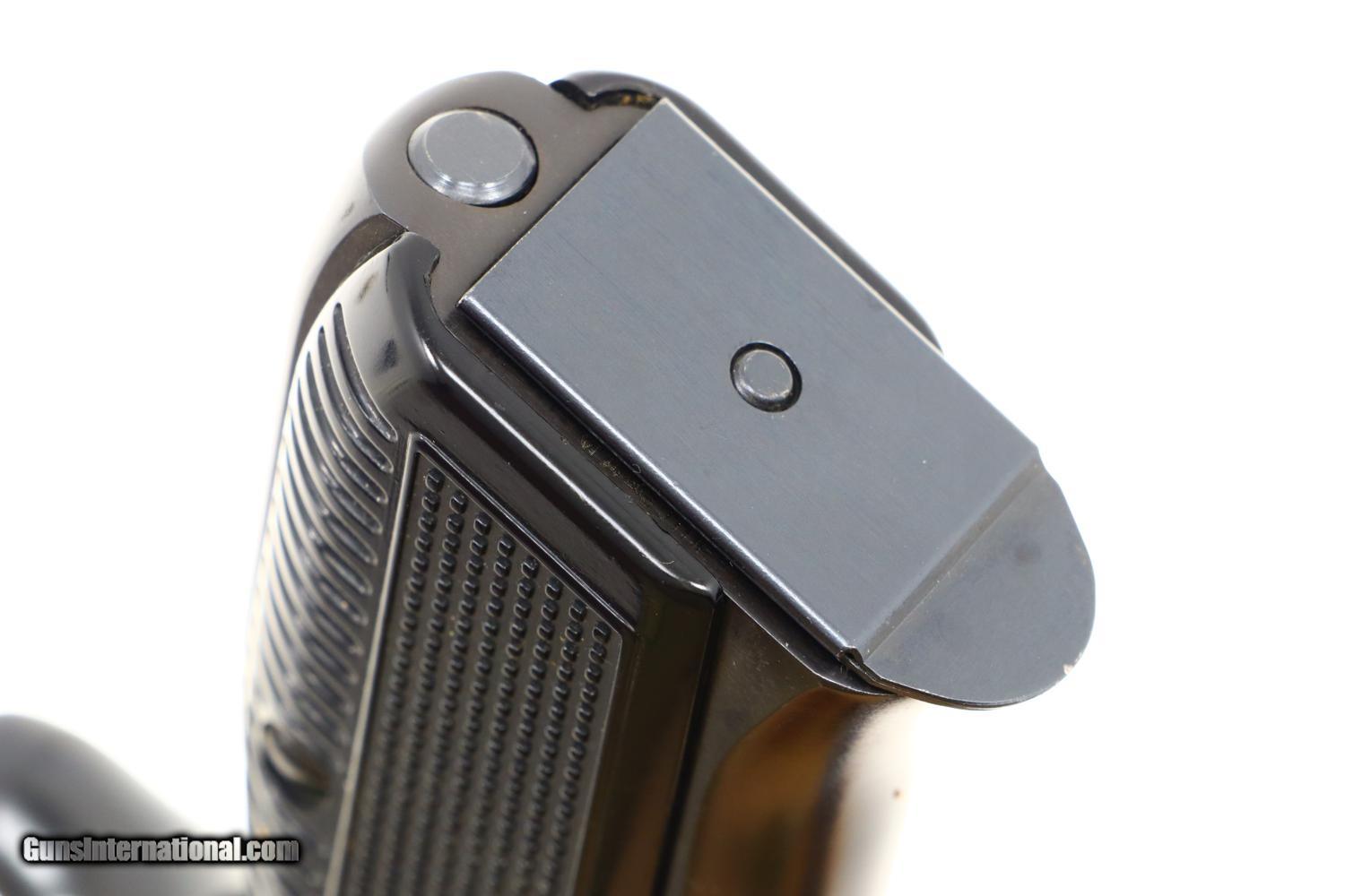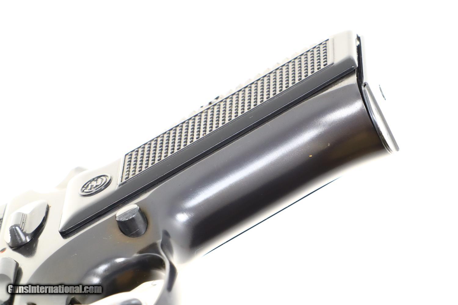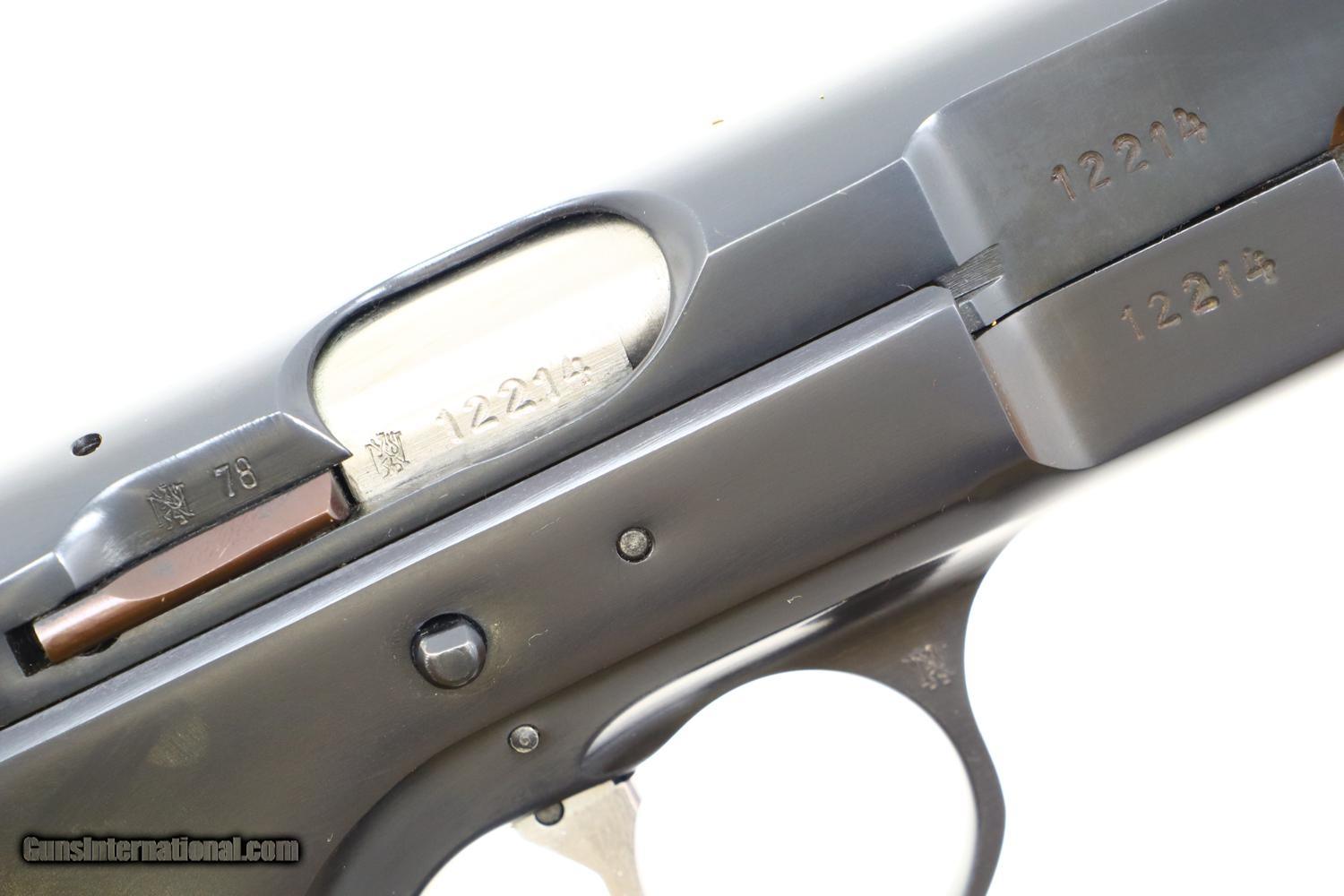 Description: This is the early, classic CZ 75 pistol, 9mmP, SA/DA, that set the stage for so many subsequent variations and copies. Fixed serrated ramp, front sight and drift adjustable rear sight. Left side of slide marked with model and caliber. Location in Czechoslovakia on left side of frame. Matching serial number on slide, barrel, and frame, the slide dated 78. Factory plastic grips each panel with the CZ logo over a molded checkered and serrated field. High capacity staggered magazine, the left side drilled with two unmakred indicator holes, button retained floorplate like the FN HP. No box or literature. Synopsis: Fantastic, near new, early CZ 75 pistol, short rail, high polish. Condition: Virtually as new, the wear imperceptible except for insertional wear on the magazine. Mirror bore. Perfect manual mechanics. The only way to upgrade would be to find an example that was NIB. ~~Insured shipping fee of $65; most packages shipped using FedEx 2nd Day.~~ SOLD Manufacturer: CZ Serial Number: 12214 Caliber Info: 9mmP |