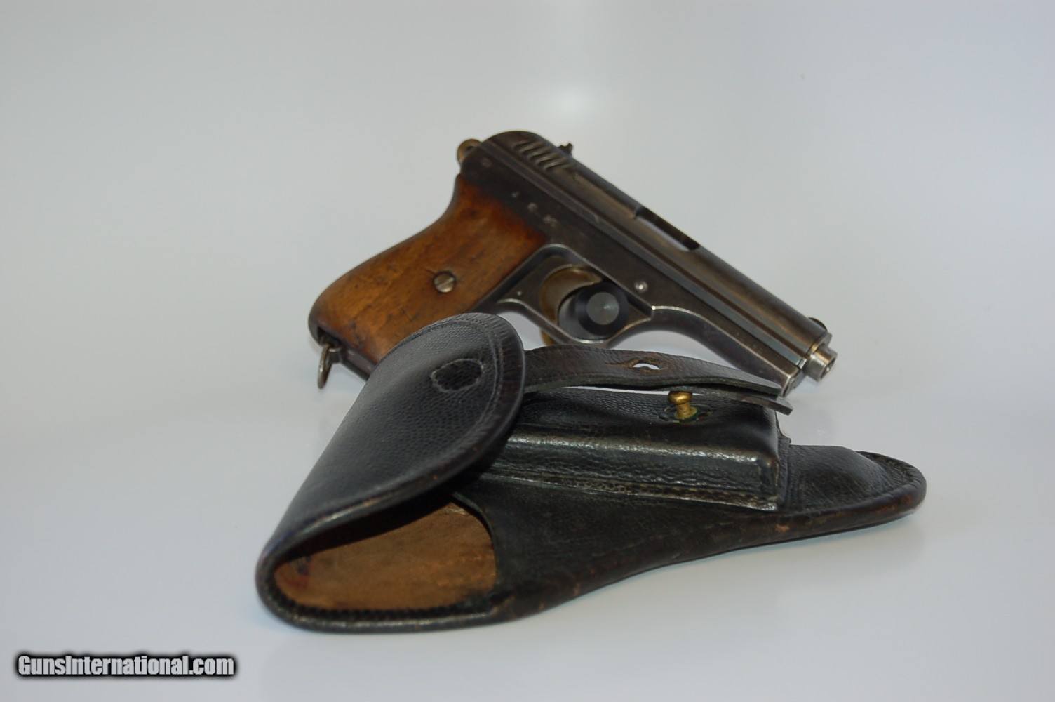 Description: we believe this is the 42nd CZ 24 pistol ever made! CZ Model 1924 (vz. 24), in .380 ACP, was the standard Czechoslovak Army pistol of the inter-war period manufactured by ?eska Zbrojovka (CZ) in Prague (as displayed on a rib on the top of the slide “?eska Zbrojovka A.S. v Praze”). It was an improved version of the CZ 22, which had been licensed from Mauser. Production of the CZ 24 started in August 1925. The original order for 20,000 pistols was completed in June 1926. More orders followed, and by the end of 1929, 100,000 pistols had been accepted by the Military and Gendarmerie, called in Czechoslovakia the “?etnictvo”. Overall, approximately 200,000 CZ 24 pistols were made. An inventory on January 1, 1939, showed the Czechoslovak Army and Air Force had on hand 171,756 CZ 24 pistols. The regular serial number range for the CZ 24 pistol is: 12,000-190,000 (there were some pistols produced as part of small international orders/contracts in a separate serial number range, for example, all 9-shot CZ 24 pistols range from serial number 1 to about 3,100, and are dated from 1929 to 1931). The serial number of this pistol is 12,042, making it the 42nd CZ 24 pistol ever manufactured. It was a part of the original order for 20,000 CZ 24 pistols completed in June 1926. The pistol is factory dated 25 (1925) and it stayed in the factory warehouse until purchased by the Military in 1926. It displays the 1926 acceptance “J, rampant lion, 26” mark of Czechoslovak Military. The pistol is unit marked to the Czechoslovak Army’s 39th infantry regiment (39P 842 534). CZ 24 is a meticulously crafted, well-built, robust, and reliable pistol that was very highly thought of at the time. During the German occupation (March 1939 – May 1945), the Czechoslovak Armed Forces were disarmed, and all the weapons were utilized by Germany and its allies. The CZ 24 pistols were not marked by the Germans, in any way, except for those used by the German Navy. CZ 24 pistols were also issued to the German Air Force, and Waffen-SS. The pistol is fitted with one-piece, smooth wood grips. Magazine capacity is eight rounds, and a Mauser Model 1910-style safety switch is mounted to the left of the pistol. The pistol is housed in an original leather flap holster. For more info visit the Hoosier SOLD Curio/Relic: Yes Manufacturer: CZ Model: 24 Serial Number: 12042 Caliber Info: unknown Condition: used Action: single |