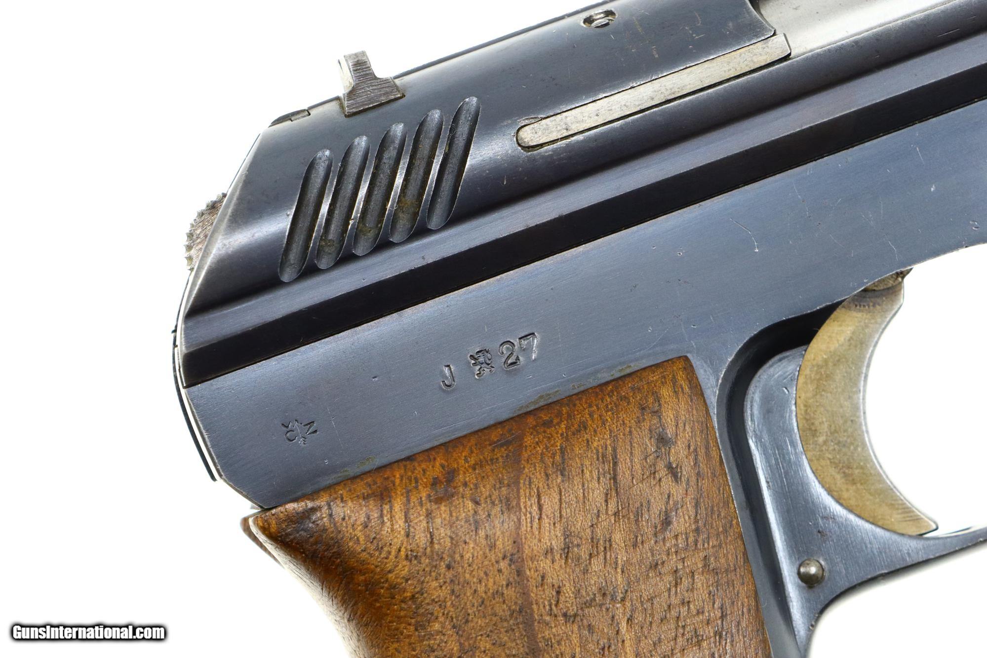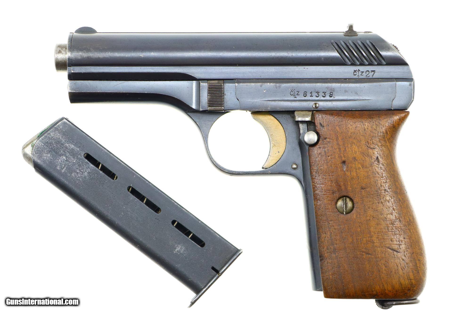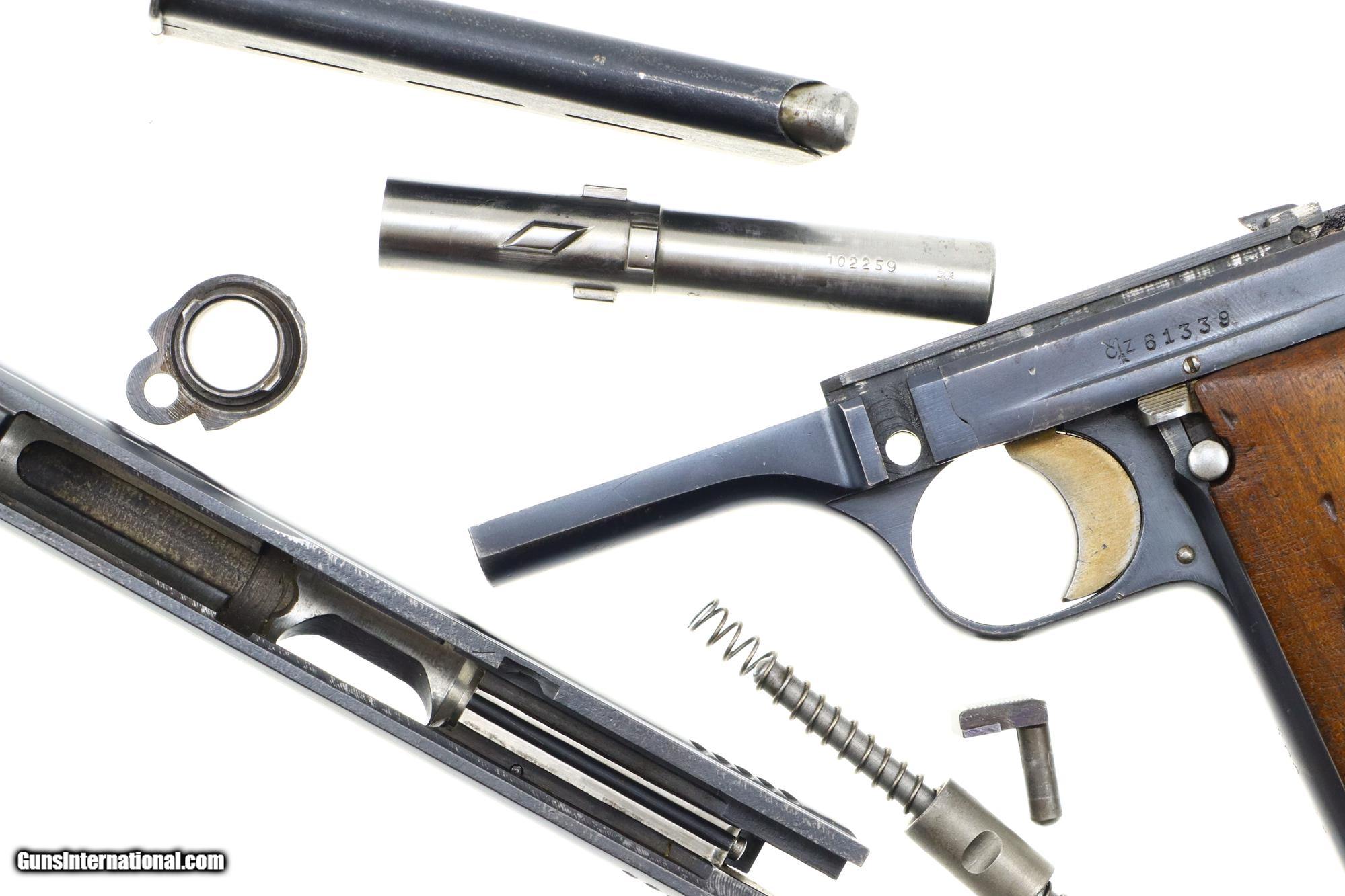 Description: Standard configuration CZ 24 with fixed front sight and drift adjustable rear sight. Slide with manufacturer details and serial number on top, production year “27” on left side. Matching frame was proofed “27” on right side and military marked "4D 381" on frontstrap, reflecting issue to the 4th artillery division. Disassembly shows barrel number 102259. Smooth wood grip. Lanyard ring. Original magazine with three indicator slots on left side and detachable floorplate marked P Mod 24. Synopsis: CZ, 1924, proofed in 1927, Military Marked to Artillery Division, .380 ACP Condition: VG-EX original rust blue finish with sharp edge wear and thinning consistent with light-moderate service use. Comparable condition grips, with scattered dings, a chip missing from under the tang, and another small chip at the front, forward lower edge, right side. Mirror bright bore with sharp rifling. Perfect manual mechanics. A classic gun with an interesting history! ~~Insured shipping fee of $45; most packages shipped using FedEx 2nd Day.~~ SOLD Curio/Relic: Yes Manufacturer: CZ Serial Number: 61339 Caliber Info: 0.38 |