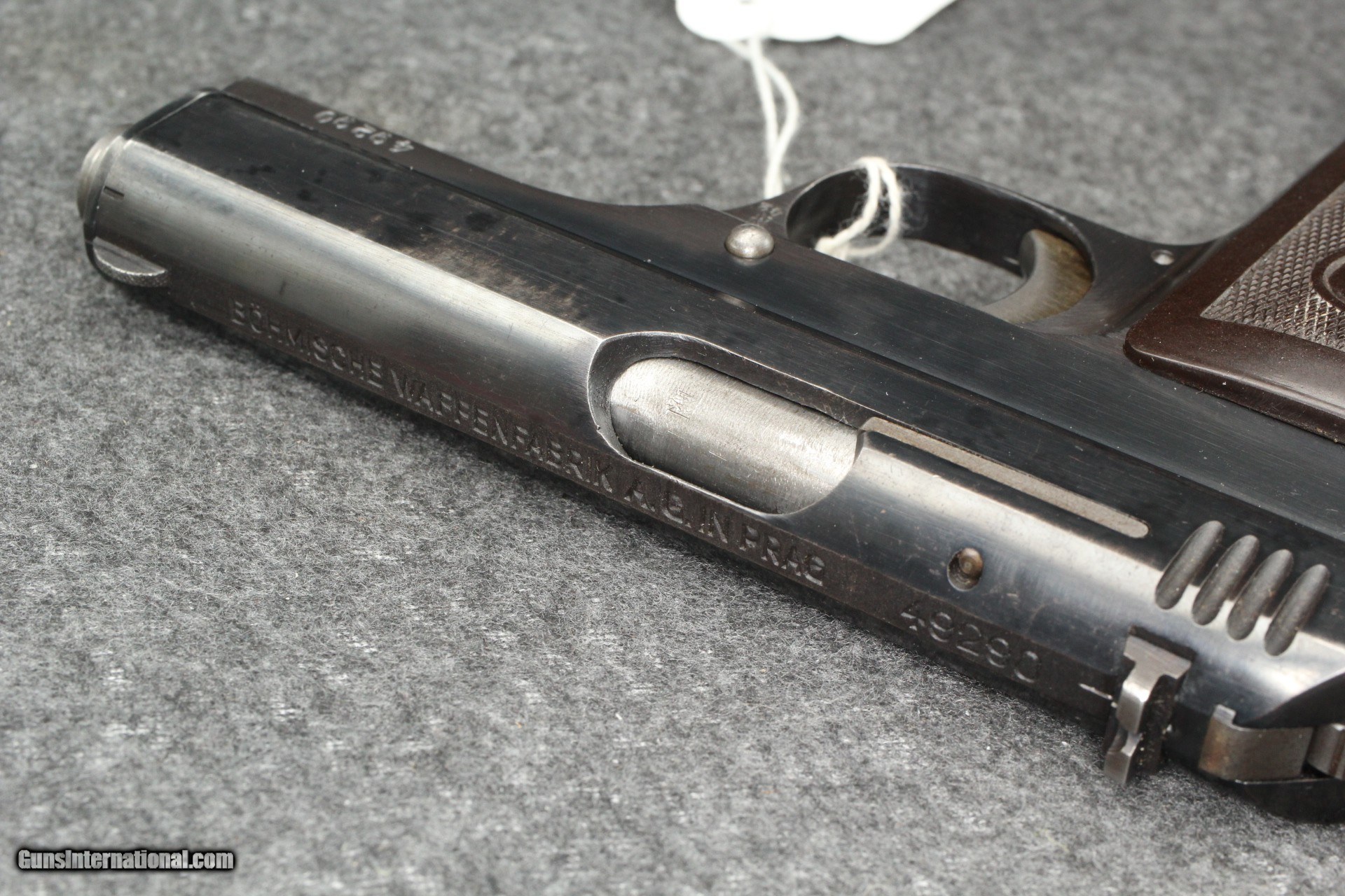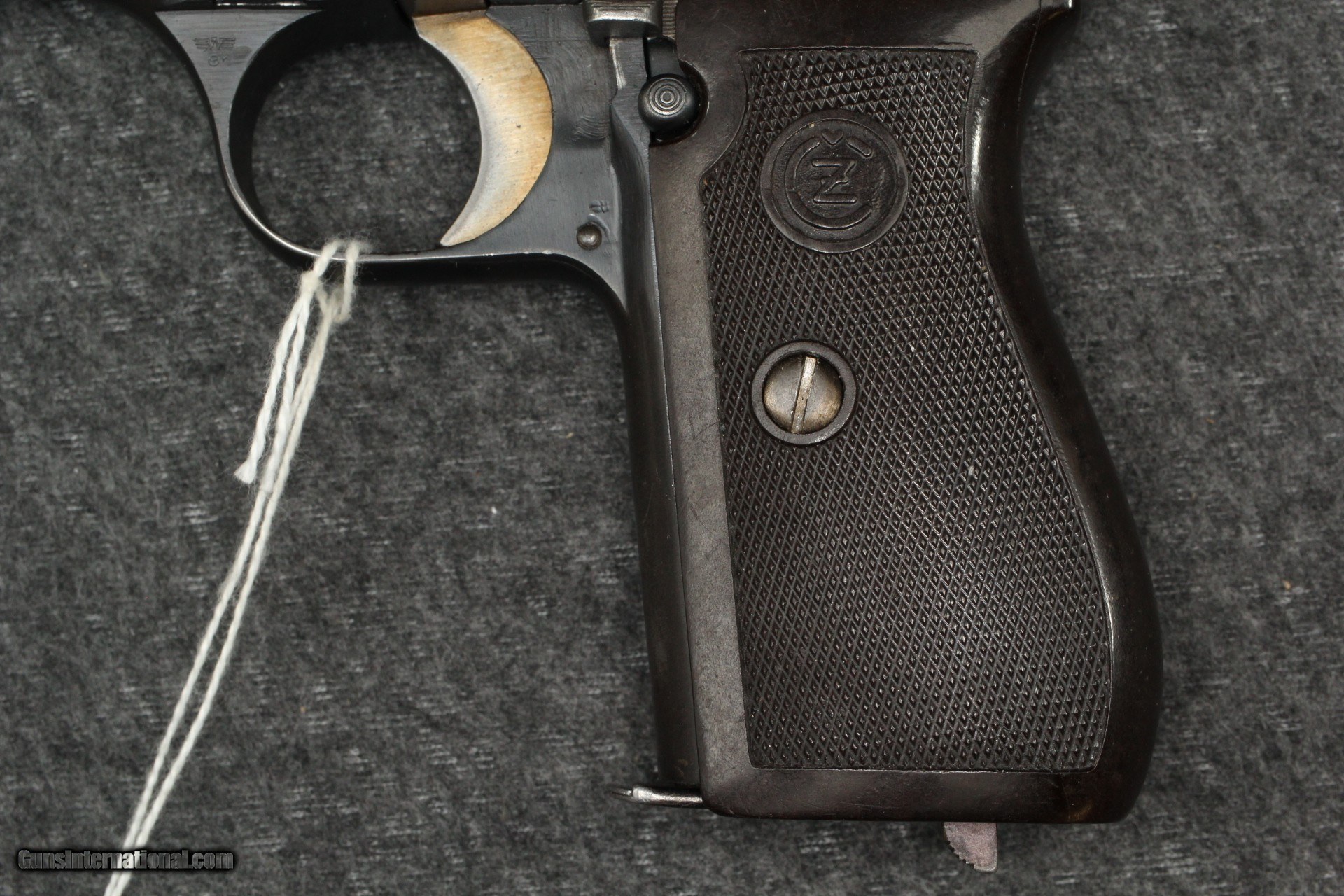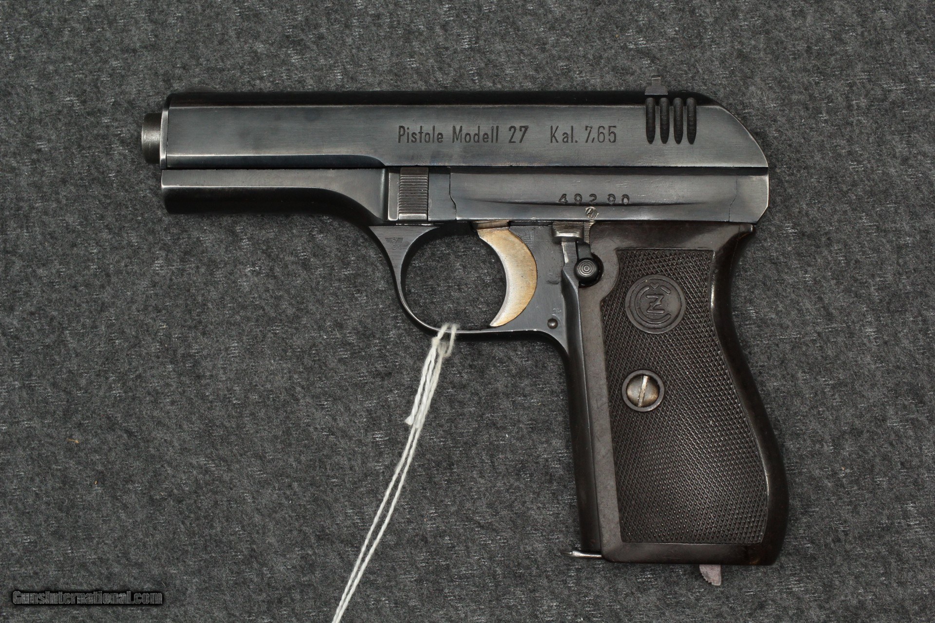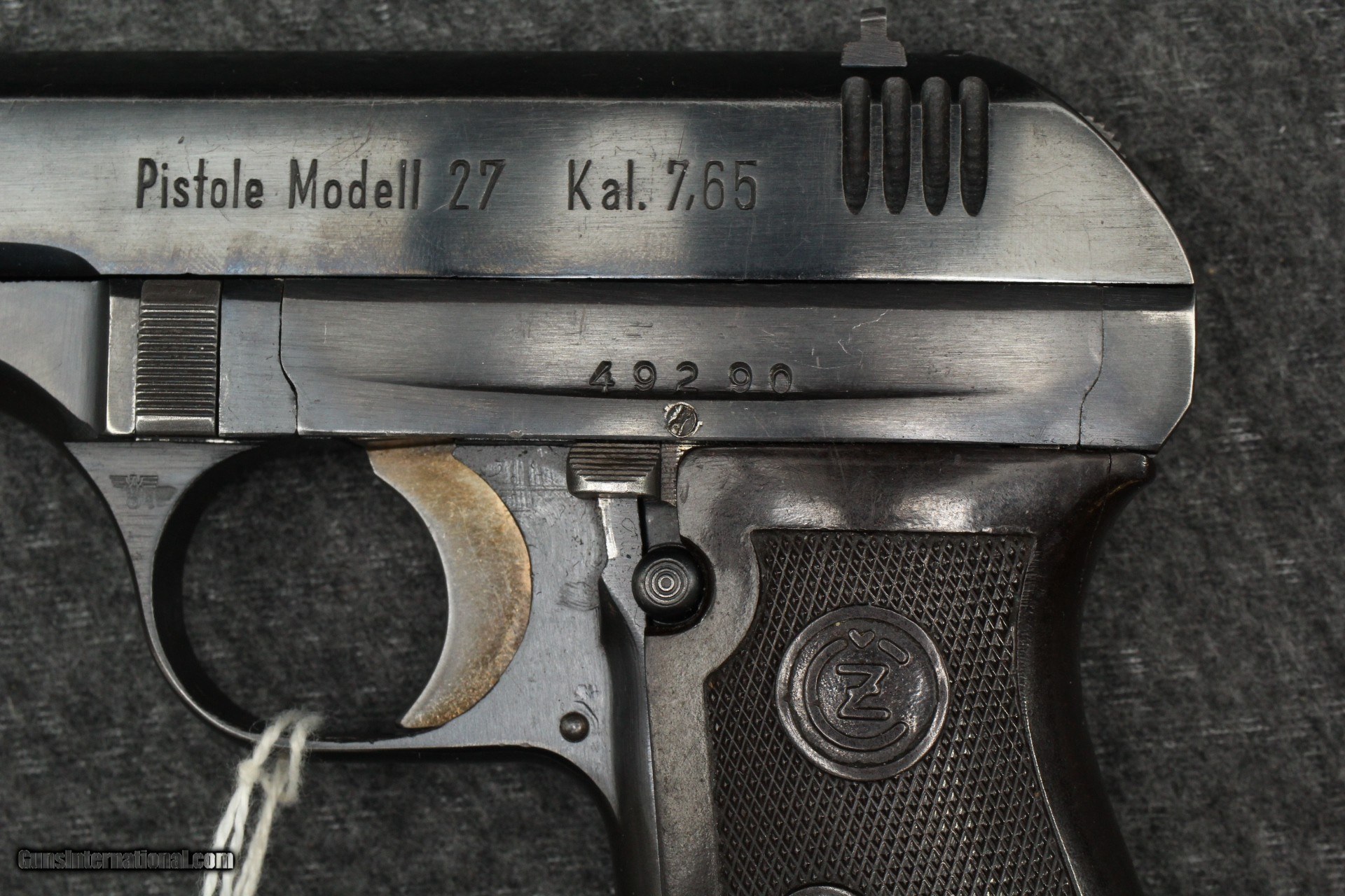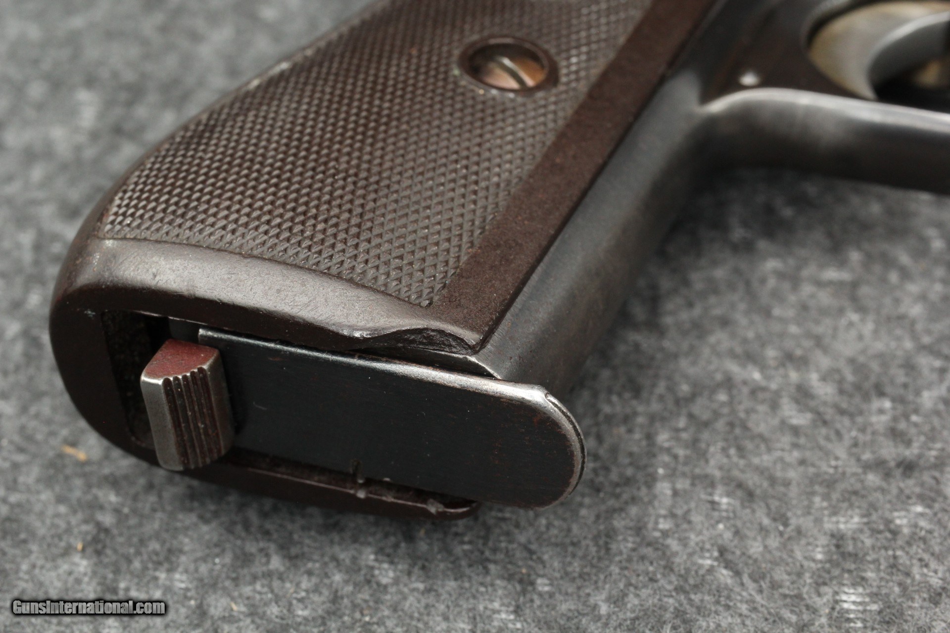 Description: 32acp, serial number 492XX. Mid WWII production. Marked on left side of slide "Pistole Modell 27 Kal 7.65". Top of slide marked "Bohmische Waffenfabrik A.G. In Prag" and serial number. Slide retains 90% bright blue with early war quality polishing. Frame retains 90% blue with eagle waffenampt on left side of trigger guard. Czech 42 date proof on left side of trigger guard. Bore is excellent. Grips show minor wear, no chips or cracks. Correct style magazine, unmarked, probably correct to gun. More photos on request. Please add $30.00 for shipping and insurance. No function guarantee. No returns or exchanges. SOLD Curio/Relic: Yes Handgun Caliber: .32 ACP (7.65x17mm Browning SR) |