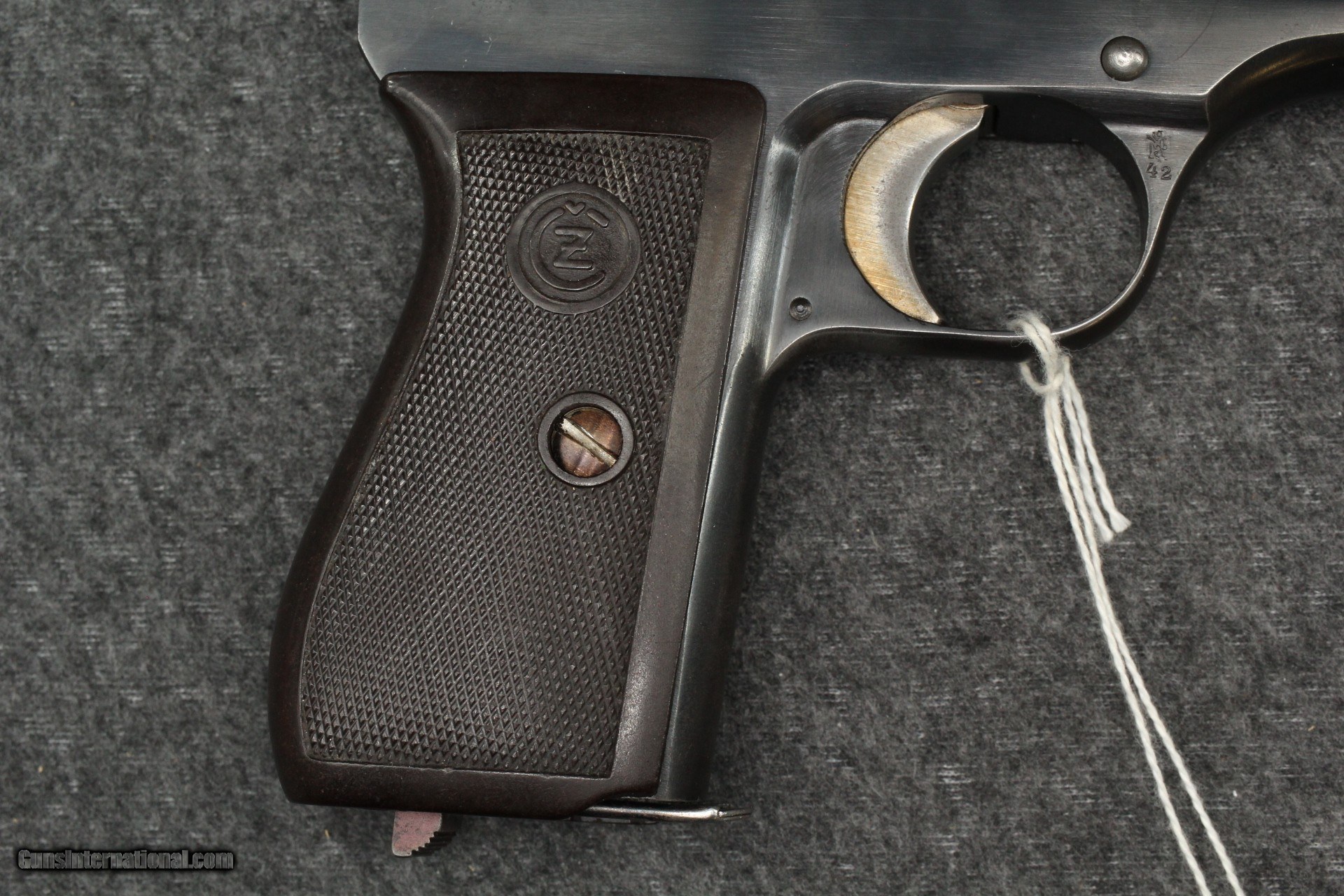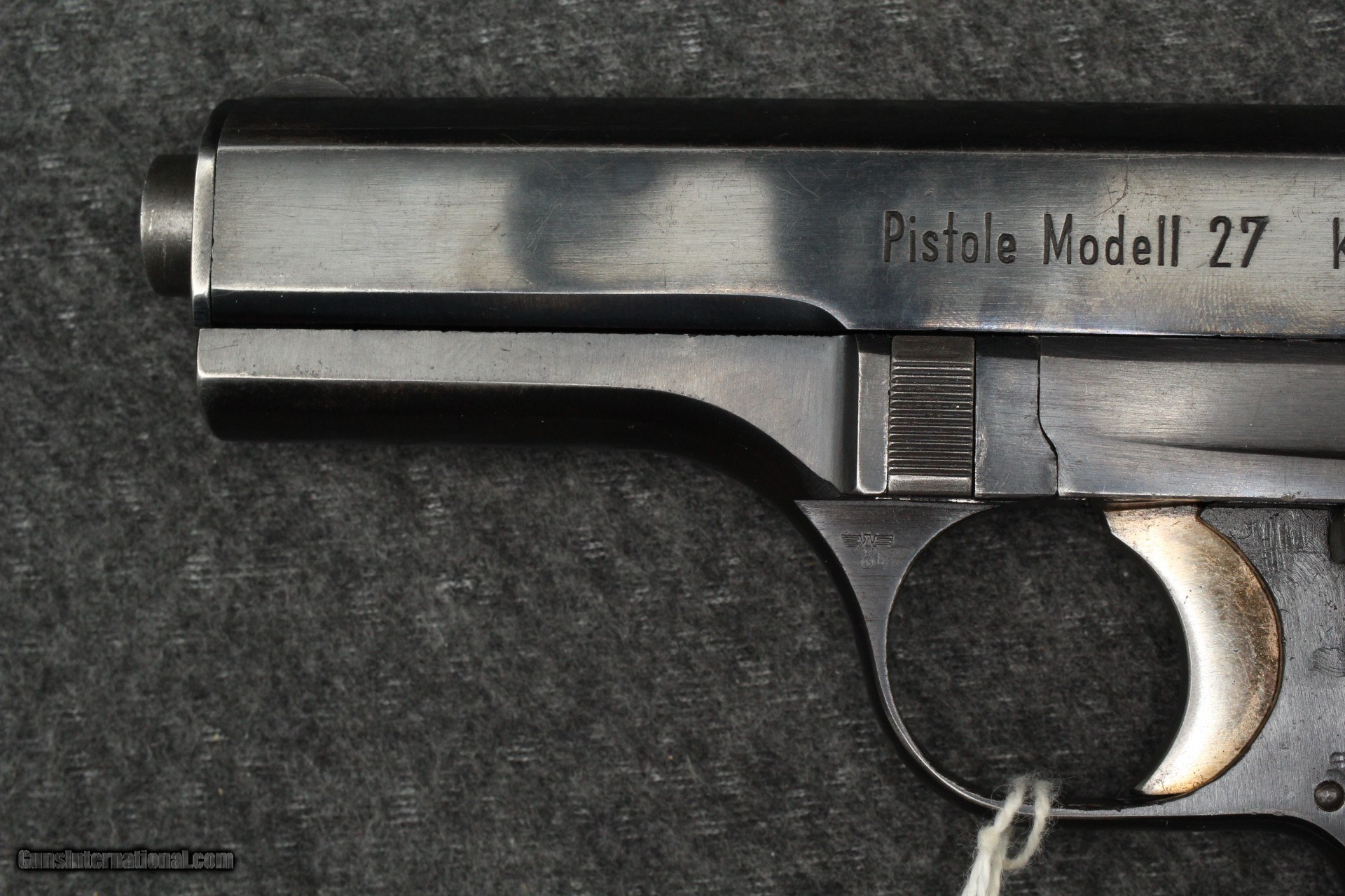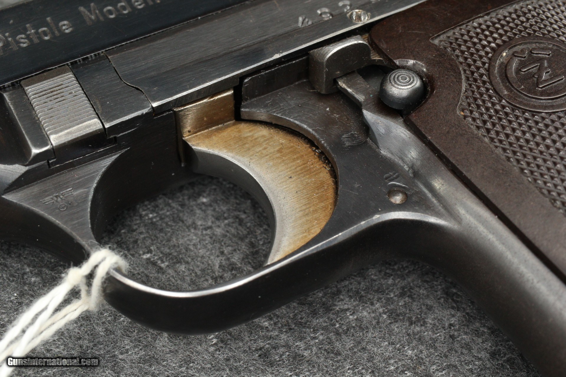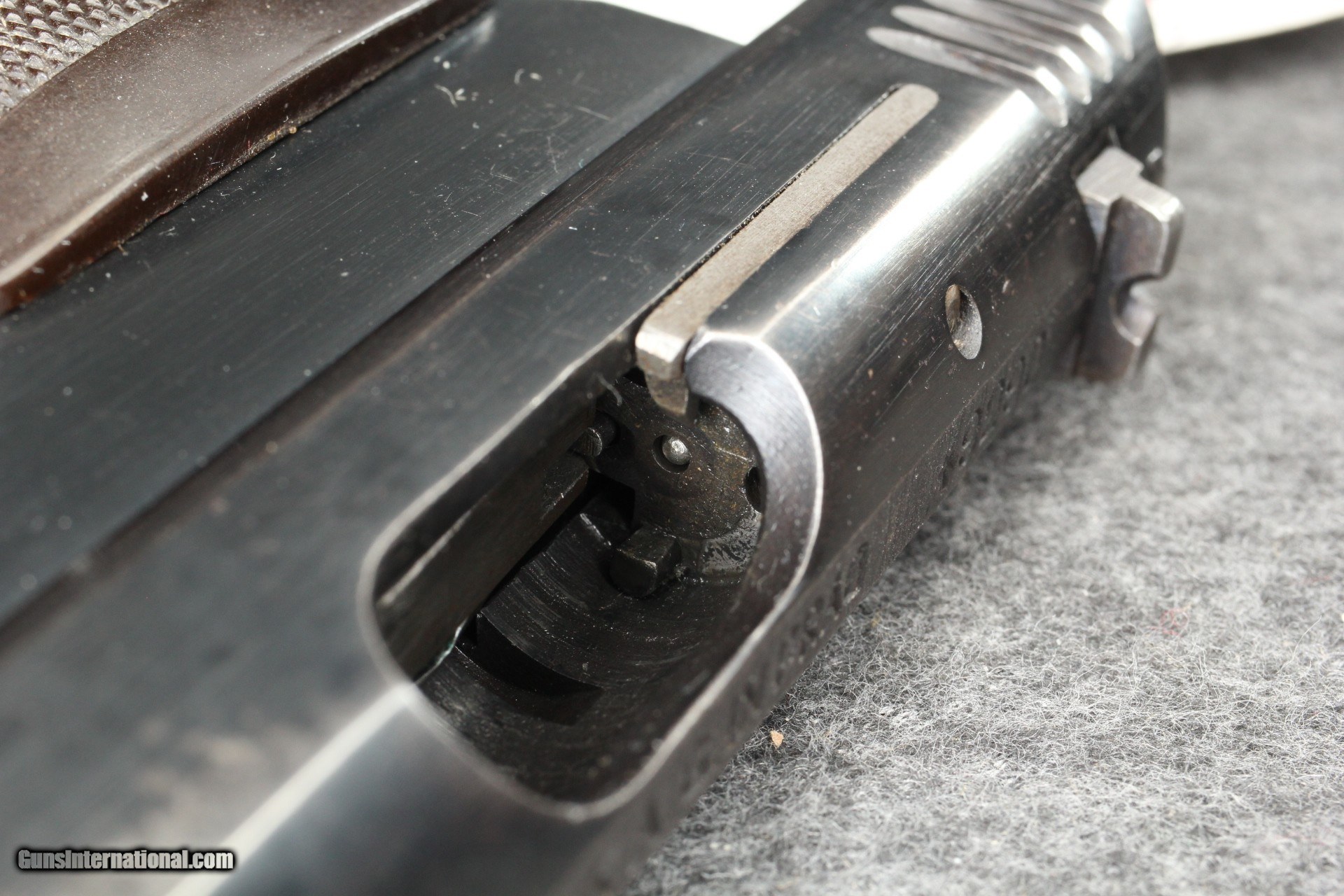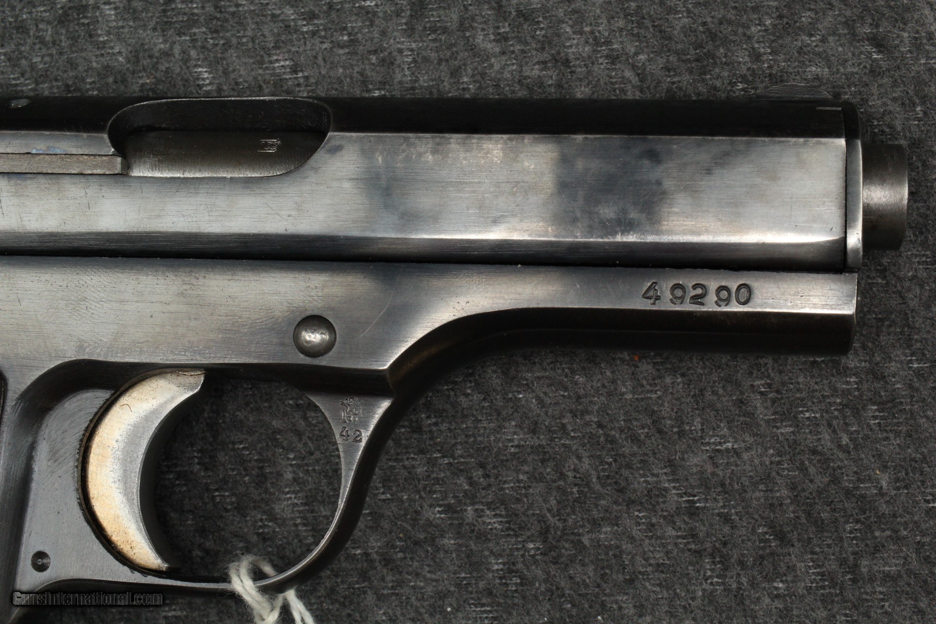 Description: 32acp, serial number 492XX. Mid WWII production. Marked on left side of slide "Pistole Modell 27 Kal 7.65". Top of slide marked "Bohmische Waffenfabrik A.G. In Prag" and serial number. Slide retains 90% bright blue with early war quality polishing. Frame retains 90% blue with eagle waffenampt on left side of trigger guard. Czech 42 date proof on left side of trigger guard. Bore is excellent. Grips show minor wear, no chips or cracks. Correct style magazine, unmarked, probably correct to gun. More photos on request. Please add $30.00 for shipping and insurance. No function guarantee. No returns or exchanges. SOLD Curio/Relic: Yes Handgun Caliber: .32 ACP (7.65x17mm Browning SR) |