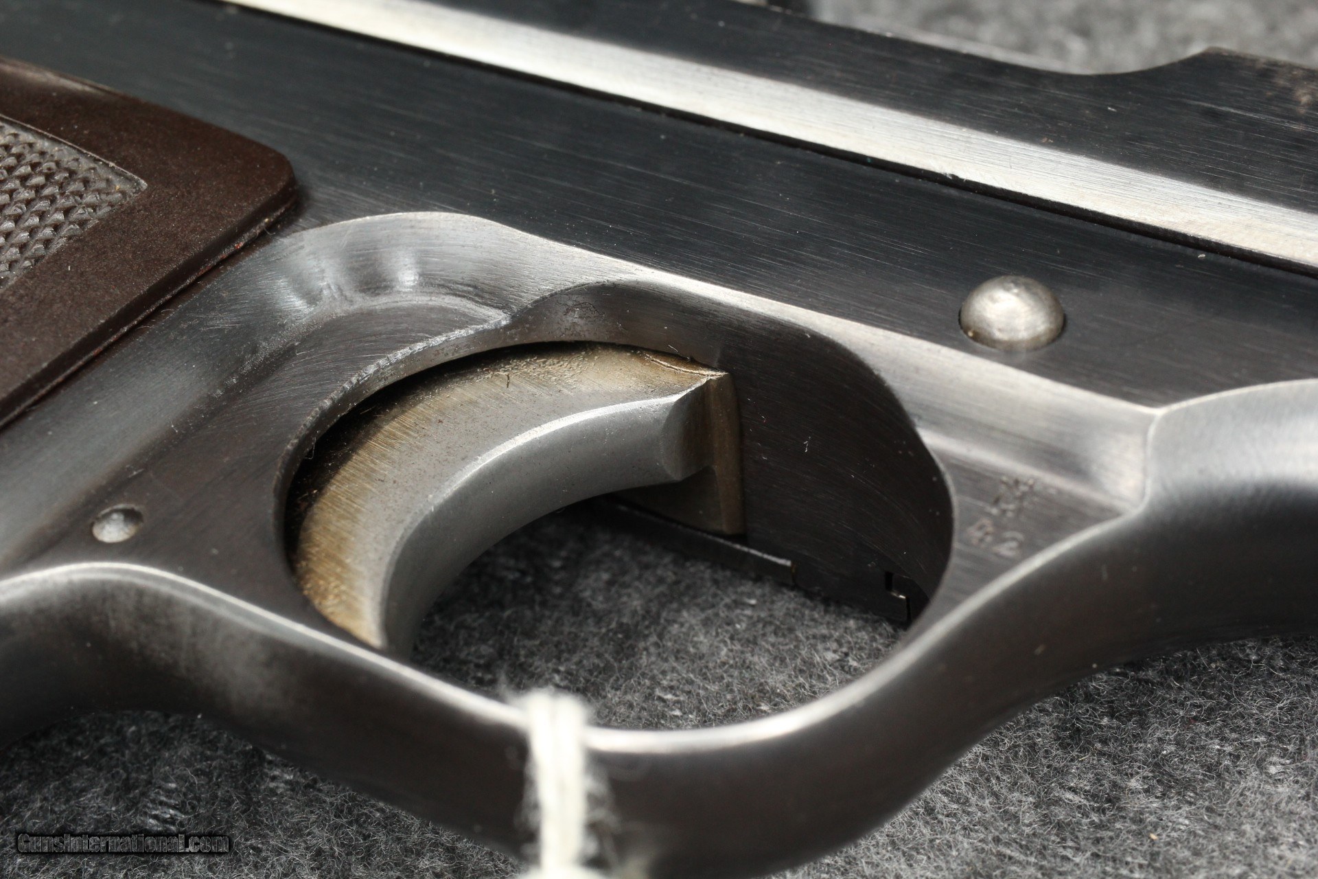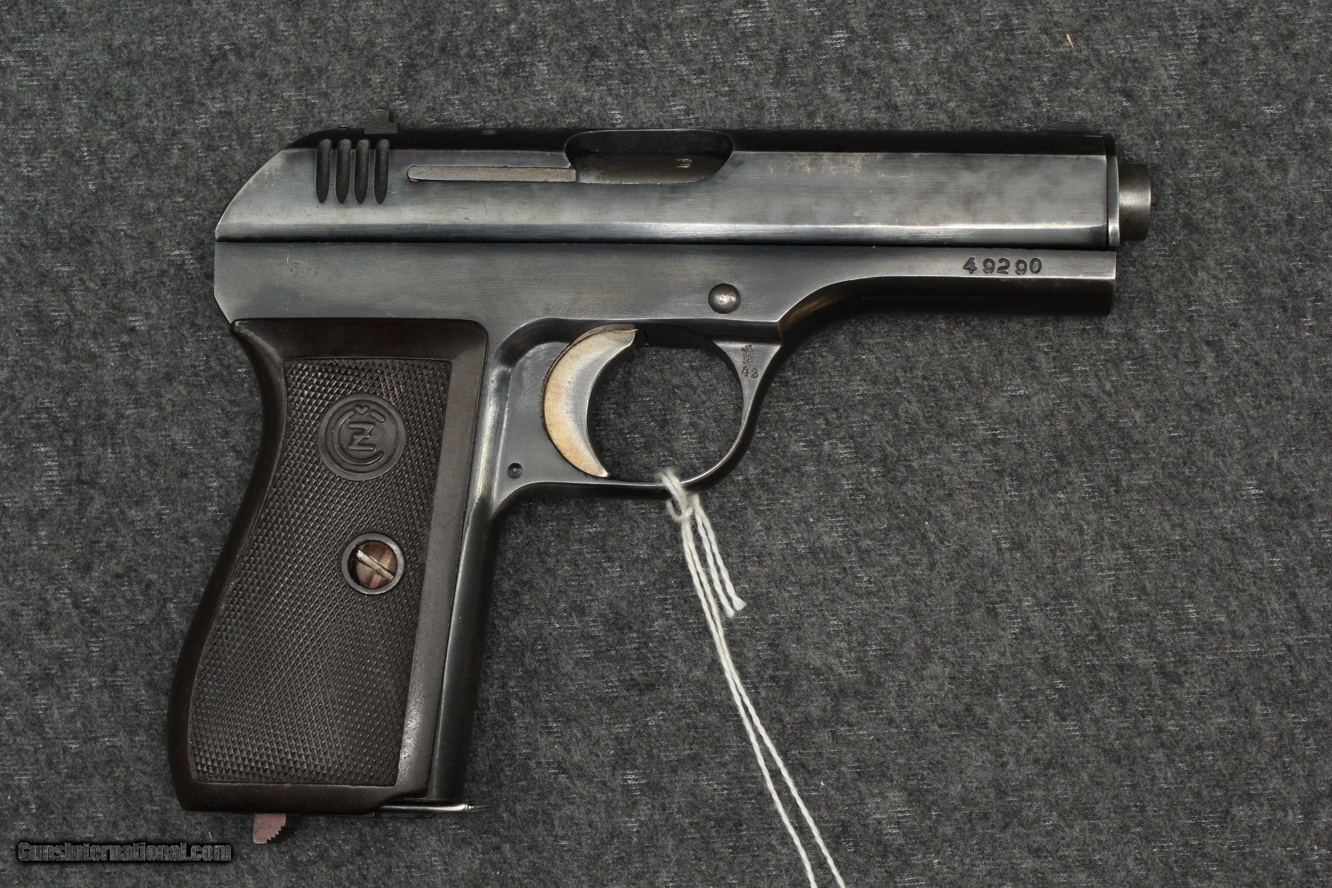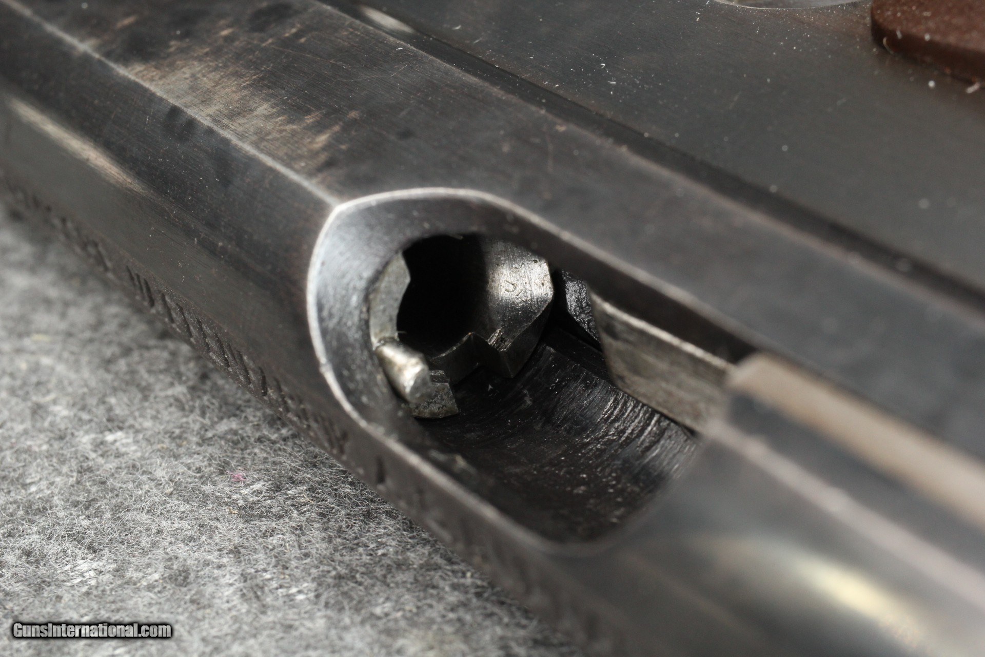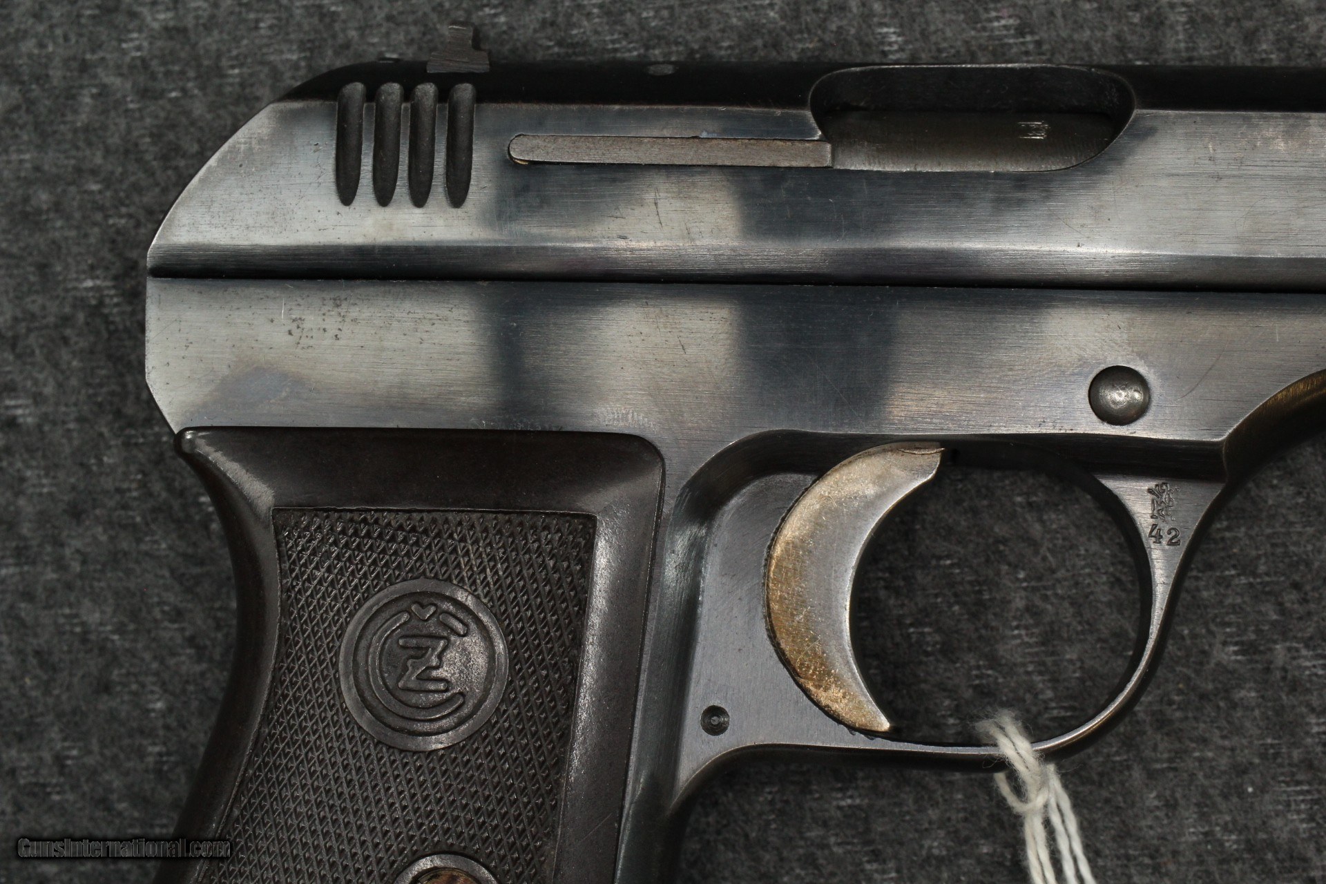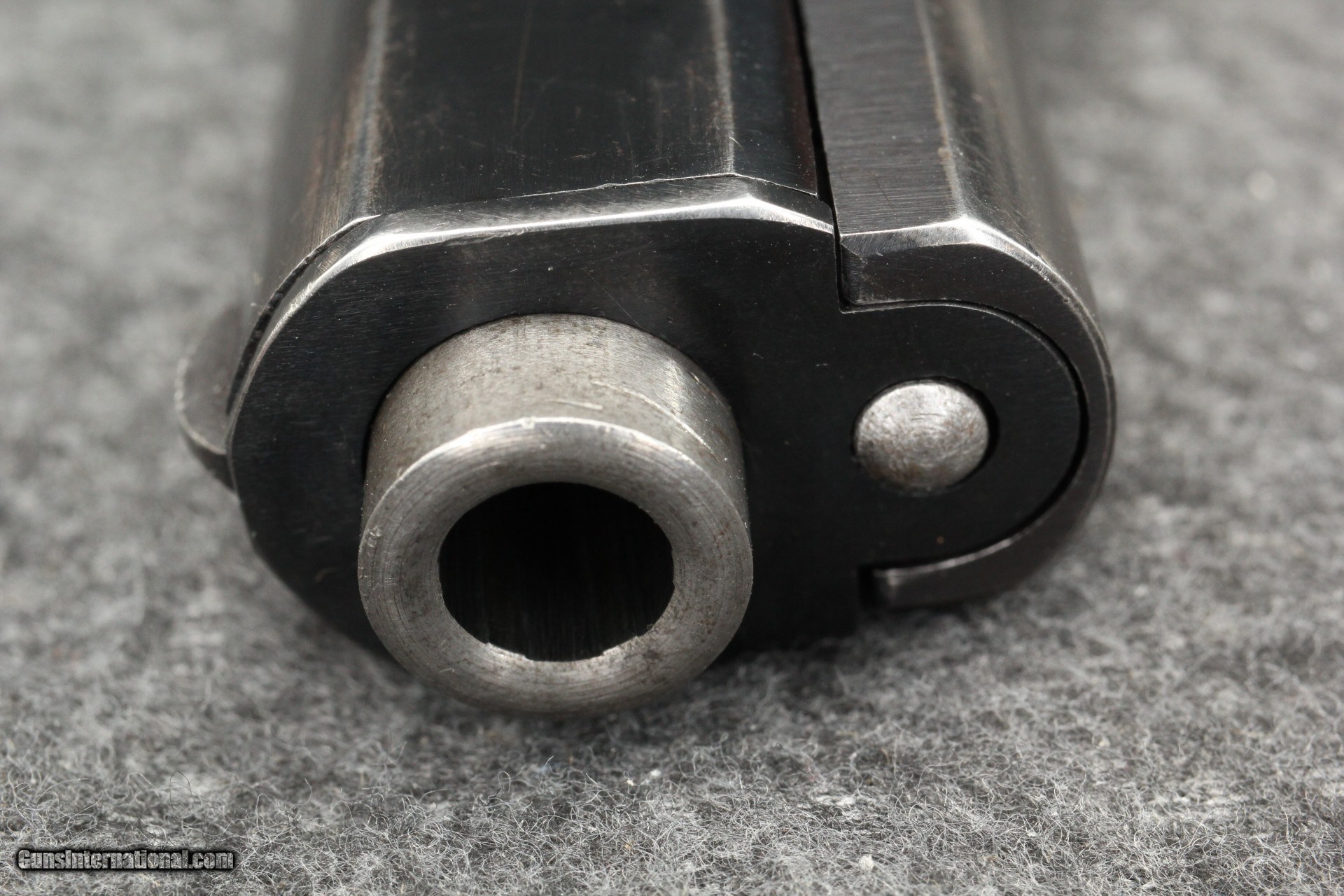 Description: 32acp, serial number 492XX. Mid WWII production. Marked on left side of slide "Pistole Modell 27 Kal 7.65". Top of slide marked "Bohmische Waffenfabrik A.G. In Prag" and serial number. Slide retains 90% bright blue with early war quality polishing. Frame retains 90% blue with eagle waffenampt on left side of trigger guard. Czech 42 date proof on left side of trigger guard. Bore is excellent. Grips show minor wear, no chips or cracks. Correct style magazine, unmarked, probably correct to gun. More photos on request. Please add $30.00 for shipping and insurance. No function guarantee. No returns or exchanges. SOLD Curio/Relic: Yes Handgun Caliber: .32 ACP (7.65x17mm Browning SR) |