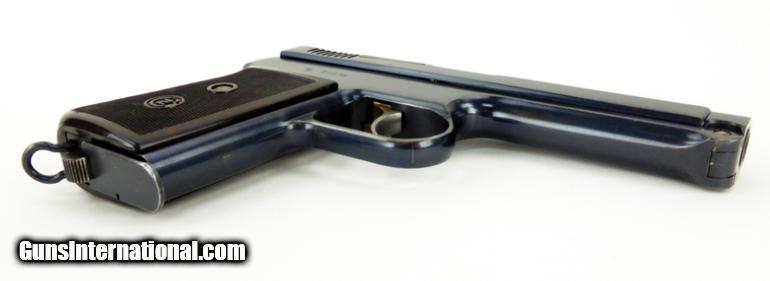 Description: CZ 38 .380 ACP caliber pistol. Produced in 1939 for the Czech military. It was never used by the Czech military and was taken by the Germans and issued to the Luftwaffe. Excellent bore. Correct grips and magazine. About 96% finish with some etching. Very large double action only .380 caliber pistol. About excellent condition. SOLD |