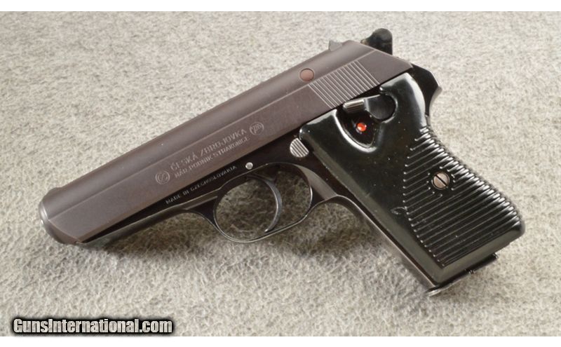 Description: The VZ 50 (commercially sold as CZ-50) is an all steel semi-automatic pistol made in Czechoslovakia. It is chambered in the plentiful 7.65 mm (.32 A.C.P.) caliber. It operates a simple blow back action with a fixed barrel. The trigger is traditional double-action, with an exposed hammer and a frame-mounted decocking safety lever. The sights are fixed and the magazine is single stacked with a capacity of 8 rounds. The magazine release button is located relatively high on the left side of the frame, behind the trigger. The grooved grips are in very good condition and are free from cracks. The finish on the frame is thinning with two spots where the bluing is missing on the front of the pistol grip area. 7.65MM (.32 ACP) SOLD Chambers: "Semi auto, 8+1 removable magazine. Metal Condition: Scattered edge and finish wear on the frame. Bore Condition: Bright and strong. Barrels: 3.8" Barrel. Triggers: Single (DA /SA). Stock Dimensions: "Very good, Grooved grip panels. Weight: 1.5 lbs Sights: Front blade and rear notch. Item Location: Owatonna, MN |
