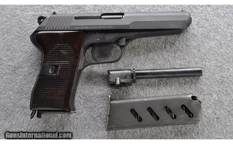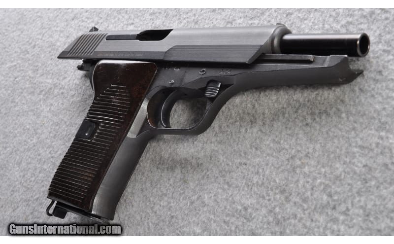 Description: The CZ 52 pistol is a roller-locked short recoil–operated, detachable box magazine–fed, single-action, semi-automatic pistol chambered for the 7.62×25 mm Tokarev cartridge (the gun was originally designed for 9×19 mm Parabellum caliber but due to political pressures had to be redesigned for the then-standard Soviet pistol cartridge). Both caliber barrels are included. 7.62x25mm Tokarev SOLD Chambers: 7.62x25 Tokarev and 9 mm Parabellum in eight round detachable magazines Metal Condition: "Very good, appears in unissued condition Wood Condition: Bakelite grips are very good Bore Condition: Bright and sharp both barrels Barrels: 4.7" Roller Lock Triggers: Single Action with safety decocker Weight: 34 oz. Sights: "Fixed front, drift adjustable rear Item Location: Grand Junction, CO |