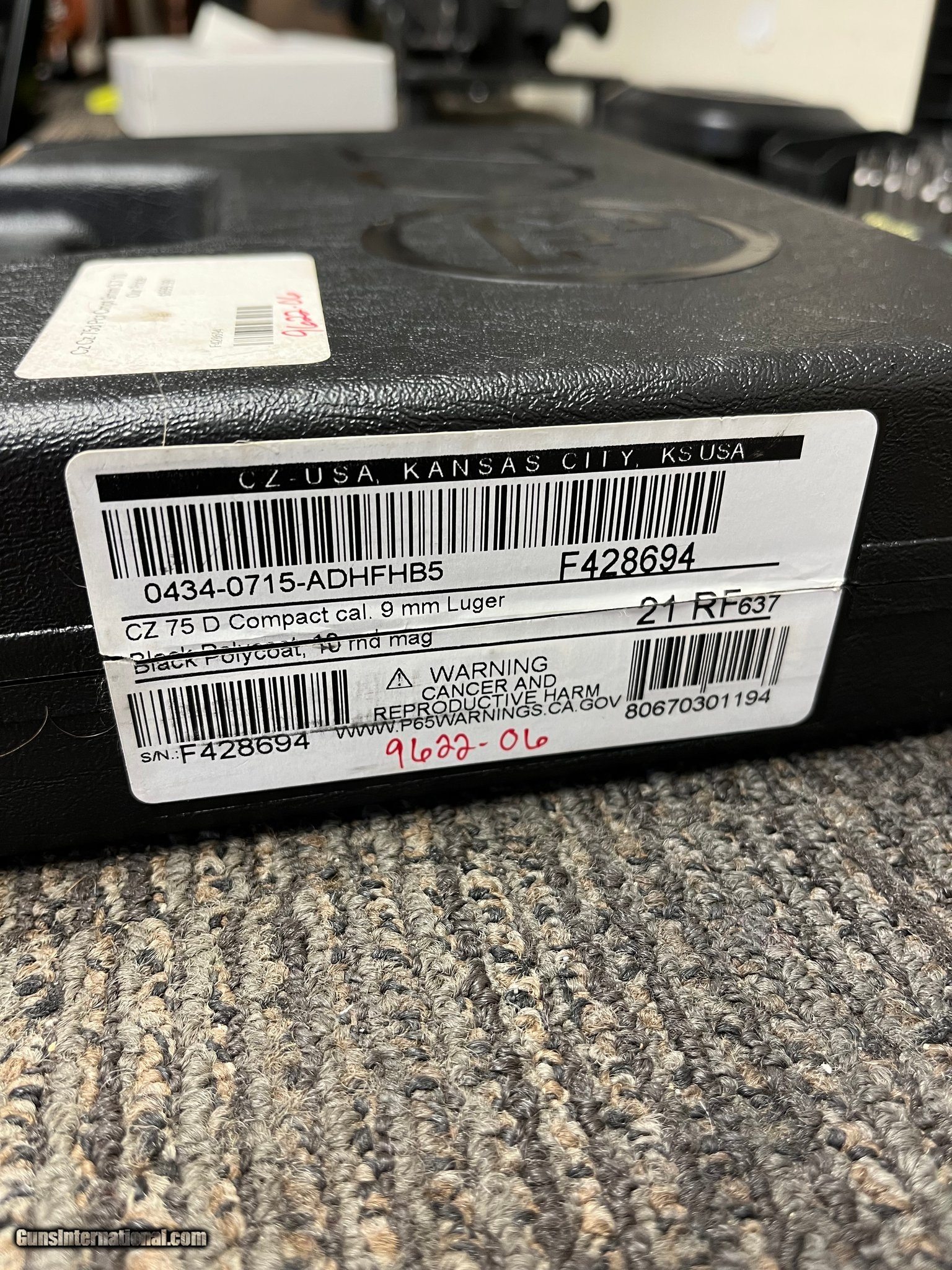 Description: Guns Listing ID: 502866 CZ 75 D Compact. 9MM semi auto pistol. Comes in factory box with 2 factory 10 round magazines. All in super nice condition. SOLD Manufacturer: CZ Model: 75 D Compact Caliber Info: 9MM LUGER (9x19 PARA) Condition: Used - Non-Certified Barrels: 3.9 Action: SEMI AUTOMATIC Finish: black |