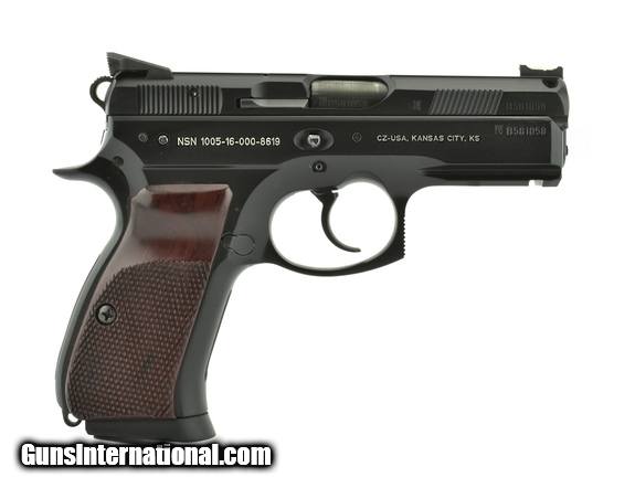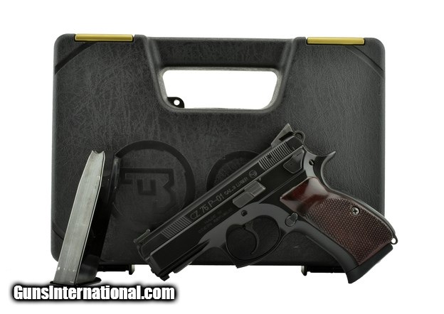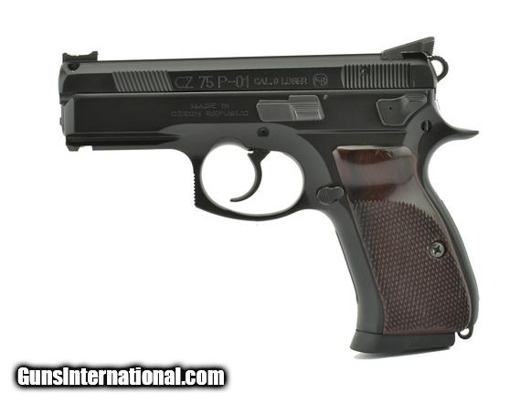 CZ 75 P-01 9mm caliber pistol. Compact carry gun with de-cocker, fiber optic sight and custom wood grips. Excellent condition with box and extra magazine.