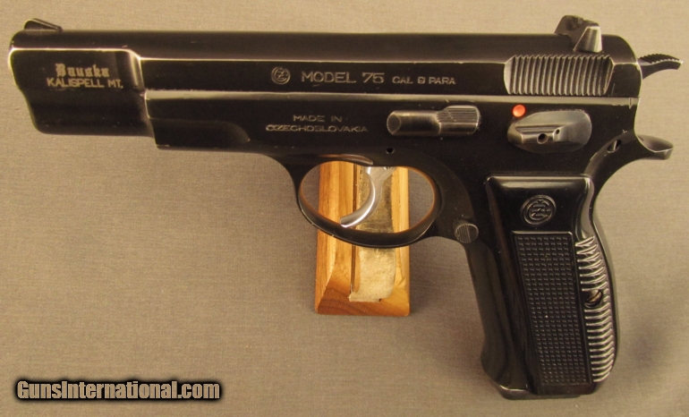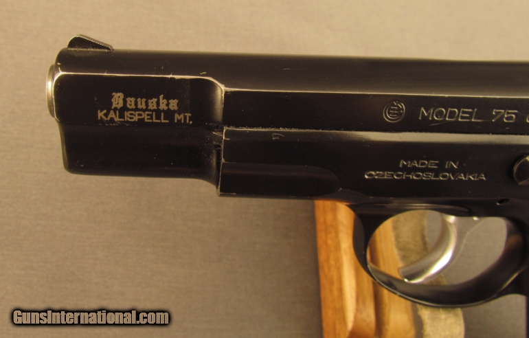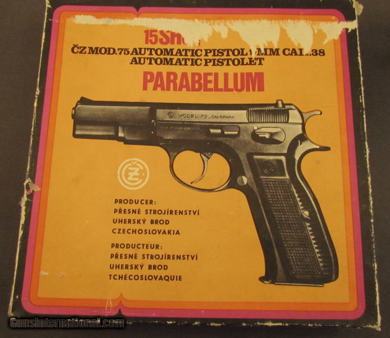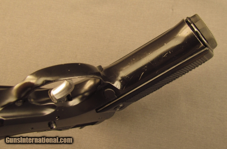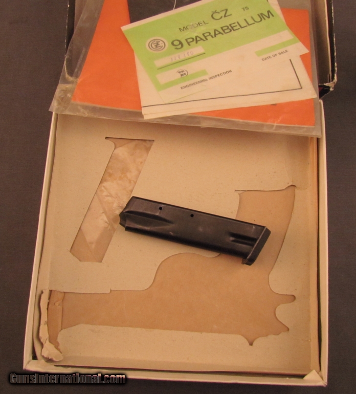 Description: Serial #118180, 9mm Para., 4 1/2” barrel with an excellent, bright bore. This is a 1985 dated pistol with matching numbers on the frame, slide, and barrel and retains 97-98% of the original applied black finish (similar to Suncorite). There are some spots of flaking and edge wear along the edges and projections and a few diagonal scratches through the finish on the frontstrap. The checkered black CZ plastic grips are in fine-near excellent shape with only some very minor handling marks and some very mild flattening of the points, mainly on the left panel. The pistol has a large import mark on the left side of the slide, and is housed in its original two-piece cardboard box with papers, test target, and two rubber bumper-equipped high capacity magazines. This is a fine-near excellent example of one of the best of the “Wonder-Nines”. FFL SOLD Manufacturer: CZ Model: 75 Serial Number: 118180 Caliber Info: 9mm Gauge Info: 9mm |