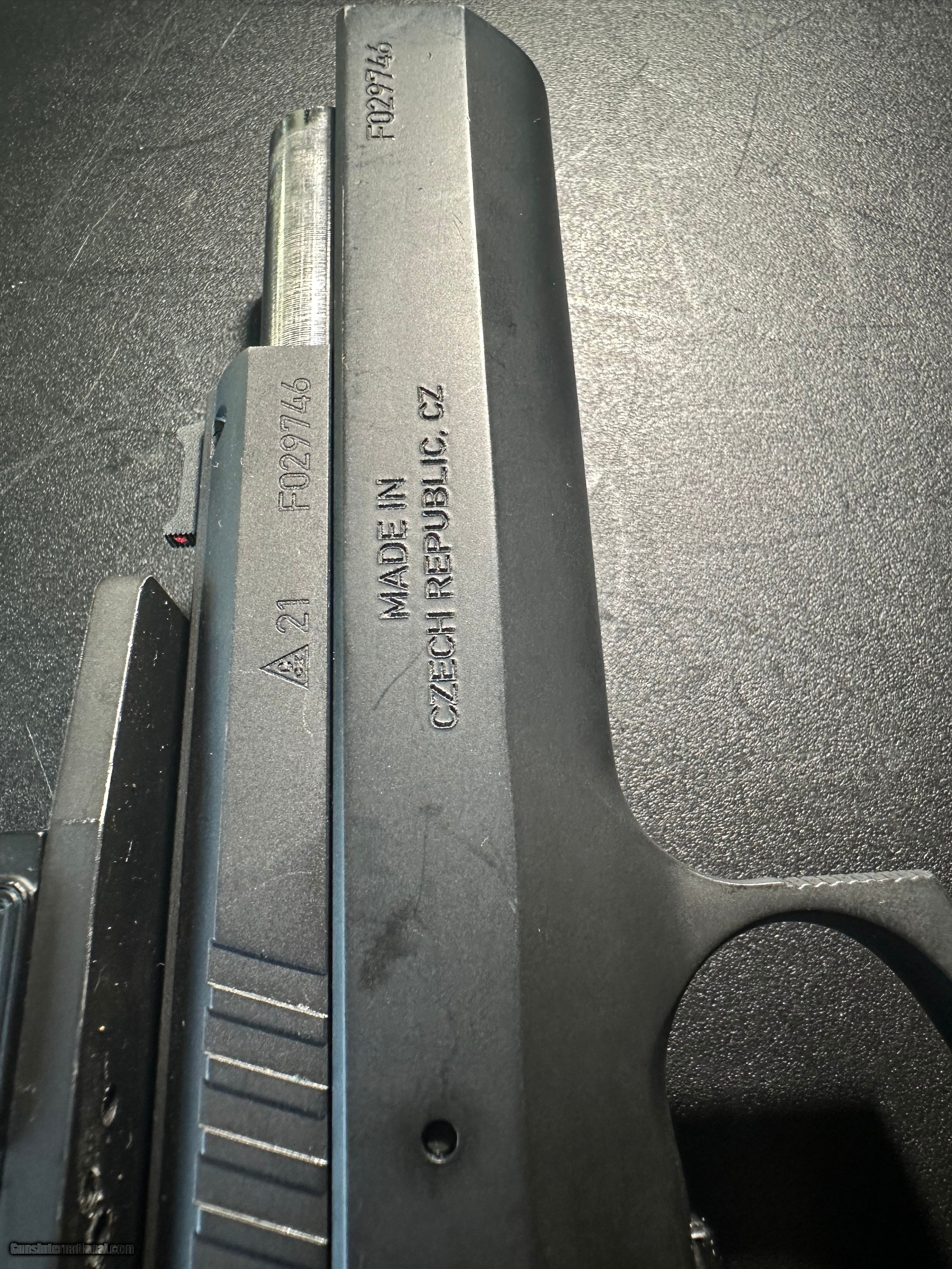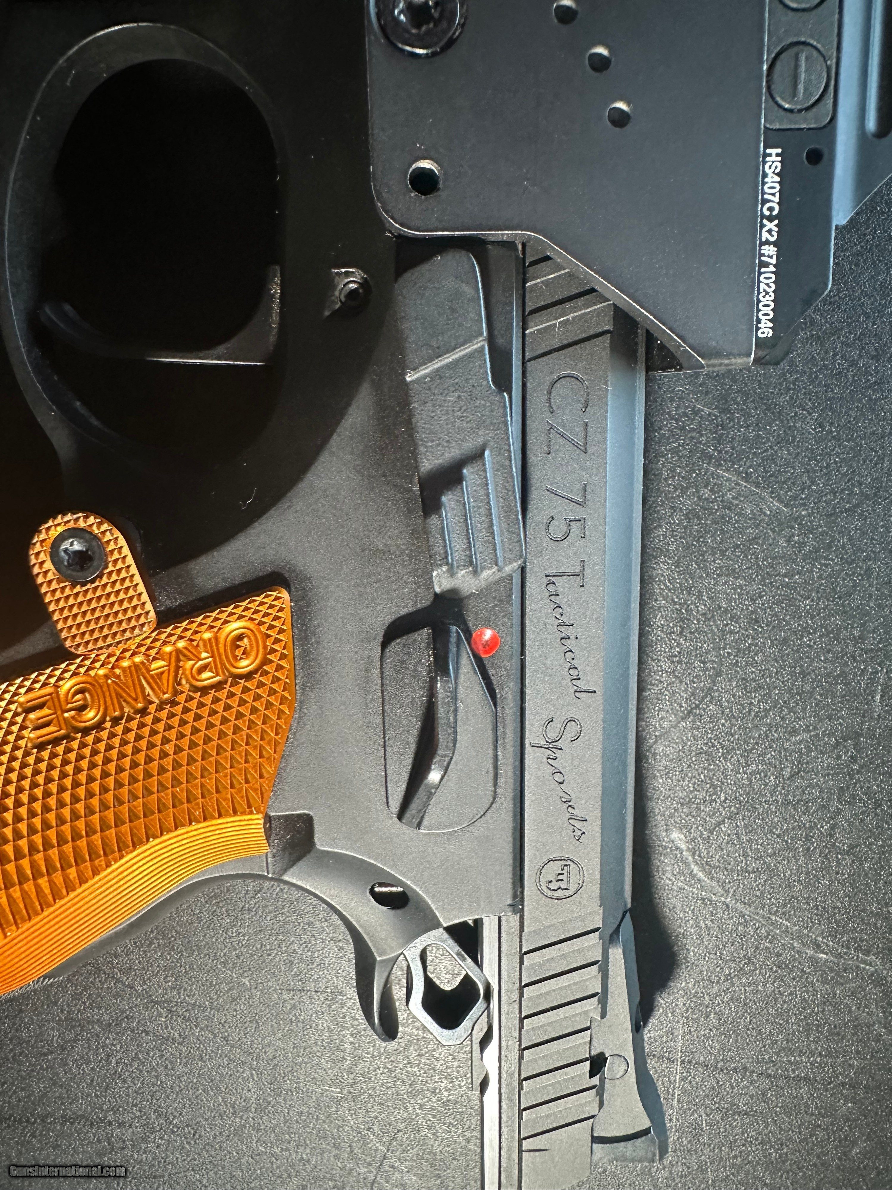 Description: Top quality CZ 75 TS Orange, comes with Holosun Red Dot, 5 magazines extra guide rod springs in the original carry case. Pistol has under 1000 rounds down range SOLD Handgun Caliber: 9x19mm Parabellum (9mm Luger, 9x19mm NATO) Manufacturer: CZ Model: Model 75 Orange Serial Number: F029746 Barrel Length: 5 inch Condition: excellent Metal Condition: excellent Bore Condition: excellent Sights: adjustable |