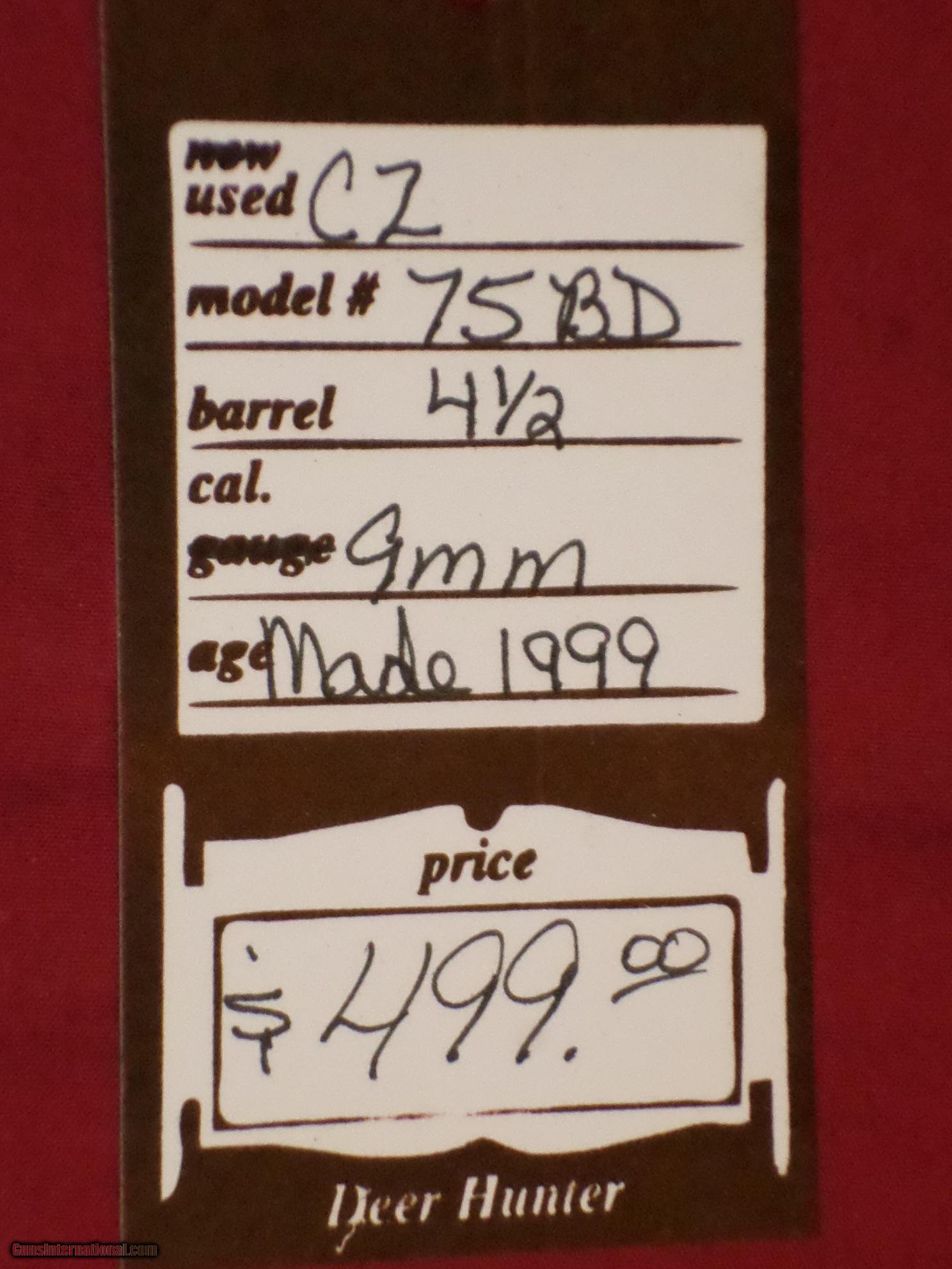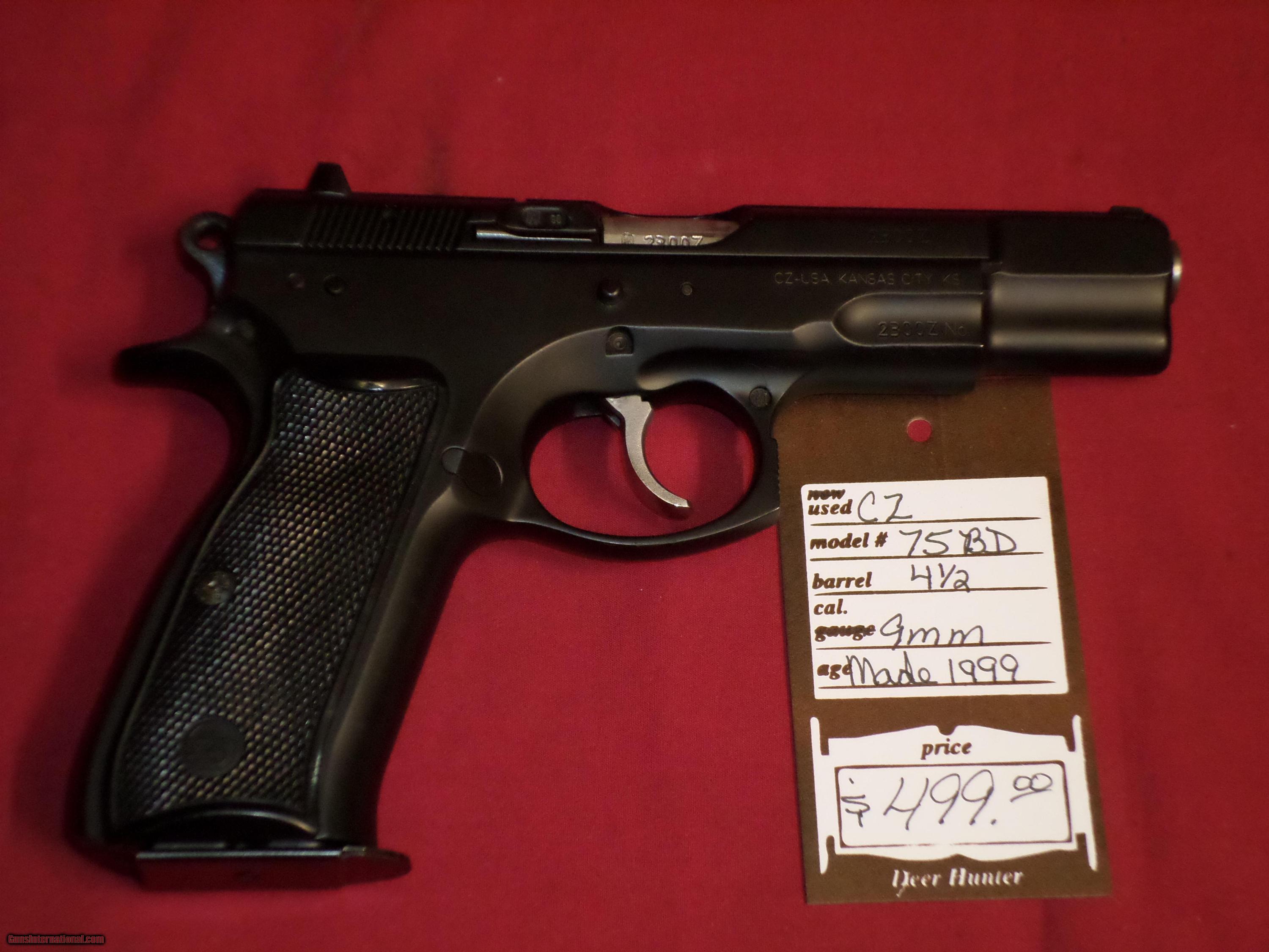 Description: SOLD For sale, CZ 75BD 9mm, excellent condition, no box. Circa 1999 SOLD To see more of our inventory, visit deerhunterguns,com We collect 7% sales tax for Florida sales. We accept MC, Visa and Discover, no AmEx. No Sales to California. Like us on Facebook: Deer Hunter Guns SOLD |