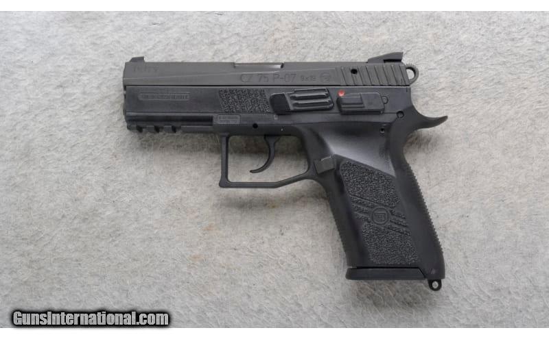 Description: This CZ Model 75 P-07 is a right hand double action semi-auto pistol in 9mm Cal. It has a 3.5 inch barrel with a rear serrated slide. A blade front sight and notch rear sight with white highlights. The grip is a textured black polymer. It has a ringed serrated hammer. It has a lower accessory rail. 9mm Parabellum SOLD Chambers: 16 round magazine. Metal Condition: Good. Shows a little use. Bore Condition: Excellent. Barrels: 3.5 inch barrel with a rear serrated slide. Triggers: DA/SA Weight: 28 oz. Sights: Blade front. Notch rear. White highlights. Item Location: Richfield, WI |