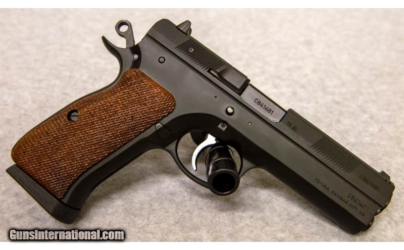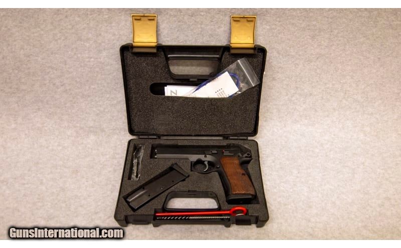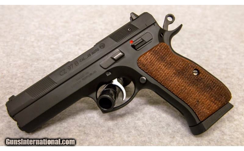 Description: CZ 97B, chambered in .45 Auto. Features include: DA/SA, 4.84 in. barrel, all steel construction, front and rear slide serrations, extended beavertail, manual safety and firing pin block safeties, short recoil system, loaded chamber indicator, black polycoat finish, checkered wood grips, fixed sights, double column 10 shot mag., last shot hold open slide, 40 oz. Mfg. .45 Auto SOLD Chambers: .45 Auto Metal Condition: ANIB Wood Condition: ANIB Bore Condition: ANIB Barrels: 4.84' Sights: 3 Dot Item Location: Fort Mill, SC |