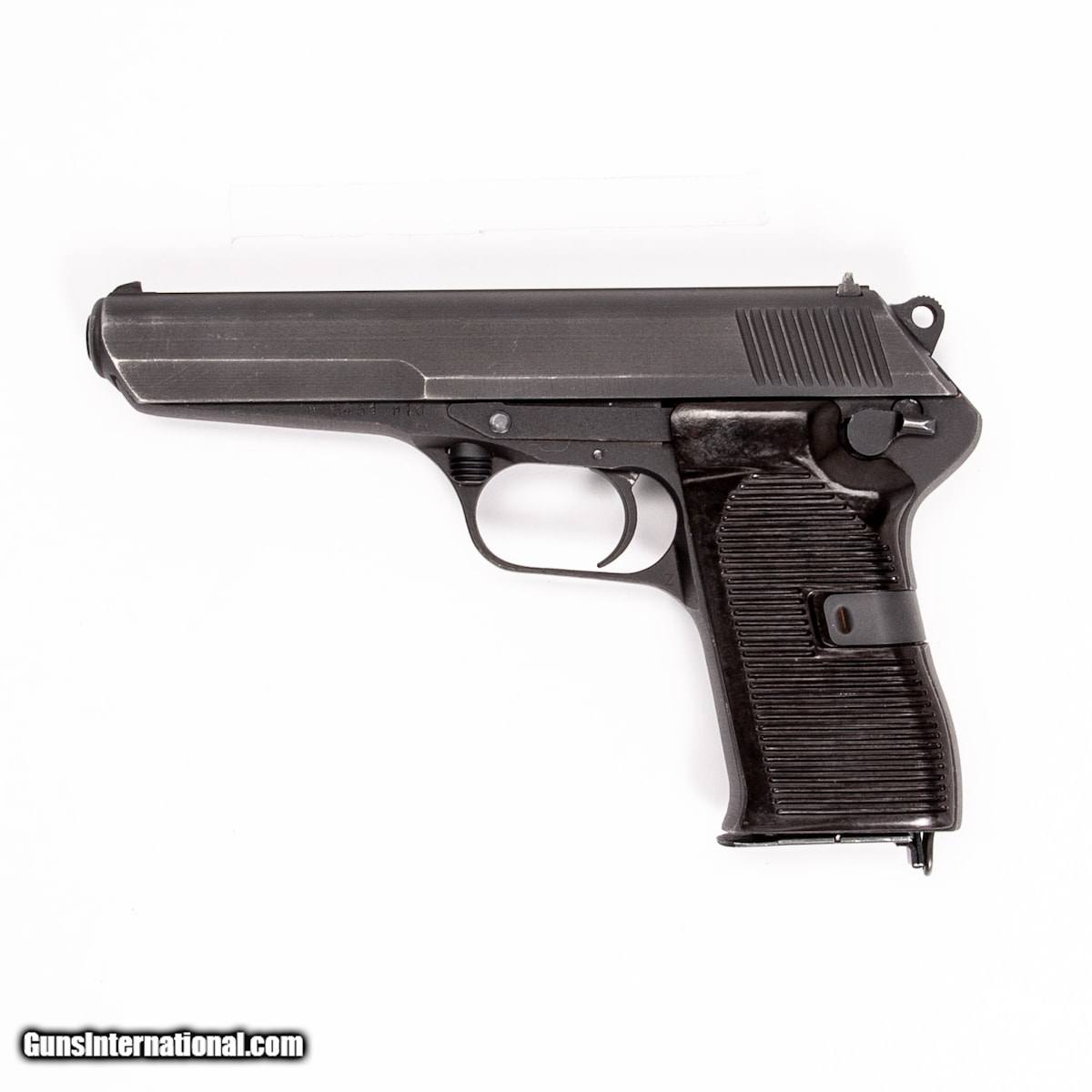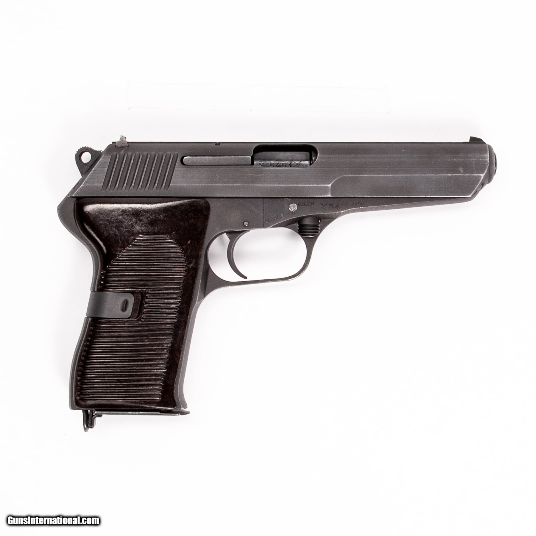 Description: Guns Listing ID: 321917 The CZ 52 or VZ 52 (Vzor means model) is a Czechoslovakian duty sidearm that was used for a large portion of the Cold War. The Czechs did not like Soviet weaponry, so they made their own SKS, AK, and pistol variants that fired the same cartridges but were designed and manufactured by their own country. This model was manufactured in 1954, has a safety de-cocker, and is in good condition, with some minor marks on the slide and frame. This pistol comes with the original brown Bakelite grips and is currently outfitted with a replacement set in excellent condition. Purchase includes three 8-round magazines (which have a gray patina), a cleaning rod, lanyard, and a natural color holster (instead of the typical red). Serial number: N5451 SOLD Manufacturer: CZ Model: CZ 52 Caliber Info: 7.62X25MM TOKAREV Condition: Used - Certified Barrels: 3.5 BARREL Finish: BLACK |