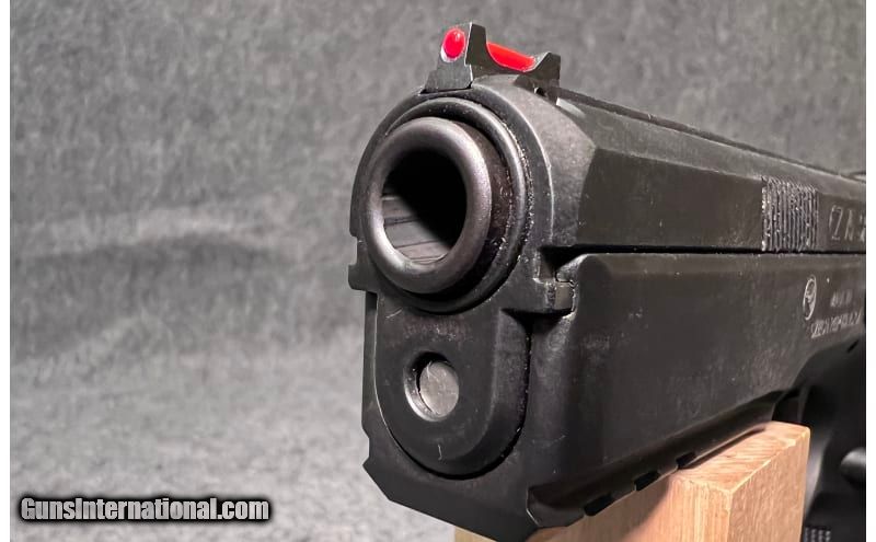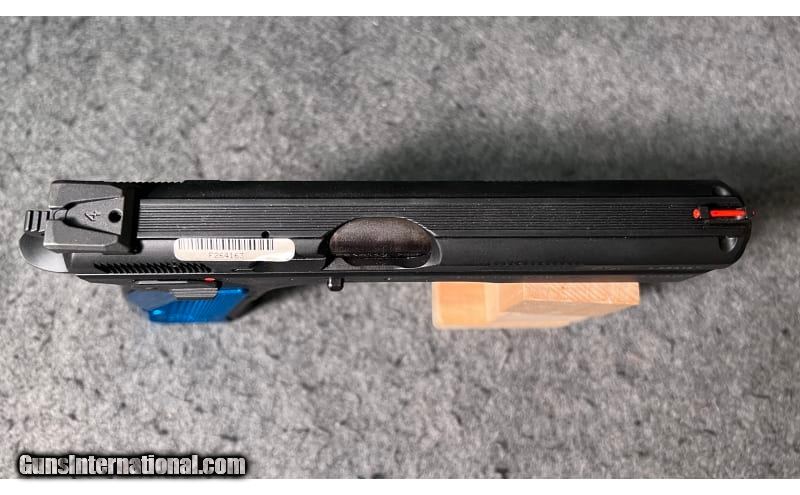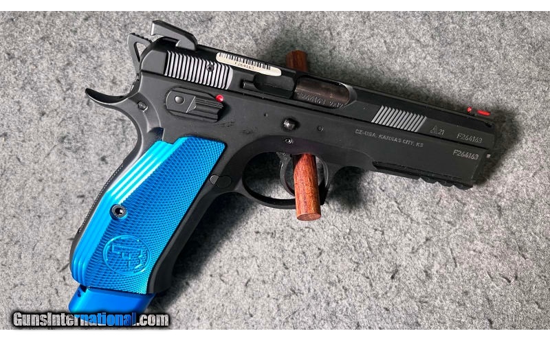 Description: This SA/DA semi-auto Competition pistol is a Blue CZ 75 SP-01 chambered in 9 mm Luger. It utilizes an extended beavertail to protect the shooter's hand as well as allowing for a deeper and more secure grip. The grip geometry, checkering in key areas on the front and back straps, and redistribution of mass provided by the accessory rail noticeably decreases the perceived recoil from previous models and allows for more rapid target acquisition and transition. This new competition model inherits its build quality from its parent model, the SP-01, so the fit and finish of the steel frame and slide are impeccable. The pistol includes a competition hammer giving it an exceptionally crisp, light trigger pull. The pistol features a 4.6-inch cold hammer-forged barrel for enhanced accuracy and performance. Inside, a steel guide rod adds shot-after-shot reliability and performance. On top of the slide, a fiber optic front sight and serrated rear sight provide precise aiming in a wide variety of lighting conditions. Milled grooves on the forward and rear of the slide enhance the shooter's grip while racking. The vibrant Blue custom aluminum grips accentuate the pistol's appearance, making it a real head-turner on the range. It is factory new in the box and comes with factory hard case, Instruction Manual, cleaning tools, warranty card, cable lock, and a total of two 21-round magazines. Both left- and right-hand shooters love the SP-01's ergonomic design. The grips fit equally well in either hand, and the pistol's ambidextrous safety is comfortably positioned at the rear of the frame directly above the grip. An under-barrel rail accepts an array of accessories from lights to lasers, all of which enhance the pistol's utility and give it a one-of-a-kind look. 9mm Luger SOLD Metal Condition: Factory new Wood Condition: Factory new Bore Condition: Factory new Barrels: 4.6 inch barrel Triggers: "Competition hammer and light mainspring creates a crisp, light trigger pull Stock Dimensions: 8.15" overall length Fore End: "Under-barrel rail accepts an array of accessories from lights to lasers, all of which enhance the pistol's utility and give it a one-of-a-kind look Butt Pad: "Fully beveled magazine well, substantially improves speed and ease of reloading Weight: 2 lb 10 oz Sights: "Fiber optic front sight, and serrated rear sight offer rapid aiming in all lighting conditions Item Location: Wichita, KS |