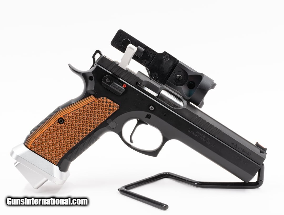 Description: Guns Listing ID: 462463 CZ 75 Tactical Sport Orange C-More RDS Cajun Gun Works Trigger .40 S&W 19+1 Manufacturer: CZ Model: 75 Tactical Sport Orange Condition: Excellent Caliber: .40 S&W Action: Semi-Auto/Single Action Only Barrel Length: 5 Capacity: 19+1 Optic: C-More red dot with adjustable brightness Features: Full size pistol, steel frame & slide, flare magwell, extended mag release, Toni System optic mount & charging handle, ambi thumb safety (not a decocker), flat face trigger, skeletonized hammer, cold hammer forged barrel. Notes: Made in Czech Republic. This pistol has several upgrades, including Cajun Gun Works trigger, DPM Systems recoil spring Inventory: Firearm, (3) 19-rd magazines, all original parts are included (trigger, rear adjustable sight, recoil springs, magazine floor plates, etc.), original orange grips, original hard plastic case, manual, cable lock, mag loader. UPC: 806703912608 • Please be aware that we have not test fired this gun. Unless otherwise stated, expect this firearm to fire and function safely. SOLD Manufacturer: CZ Model: CZ 75 TACTICAL SPORT Caliber Info: .40 S&W Condition: Used - Non-Certified Barrels: 5 BARREL Action: SINGLE SHOT Finish: BLACK Weight: 3 LBS. |