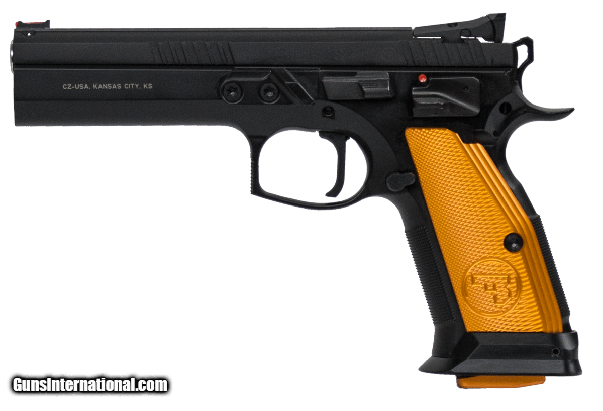 Description: Guns Listing ID: 49676 The Tactical Sport Orange borrows a number of design features from the Czechmate and incorporates a few of its own. This pistol features a slimmer trigger guard, revised grip geometry and finer checkering, and it adds a thumb stop and fully-adjustable target sights. With the same long slide and full-length dust cover as the standard TS, it also shares the single-action-only trigger, giving it an incredibly light pull and short reset. SOLD Manufacturer: CZ Model: CZ 75 TACTICAL SPORT Caliber Info: .40 S&W Condition: new Barrels: 5" barrel Finish: BLACK |