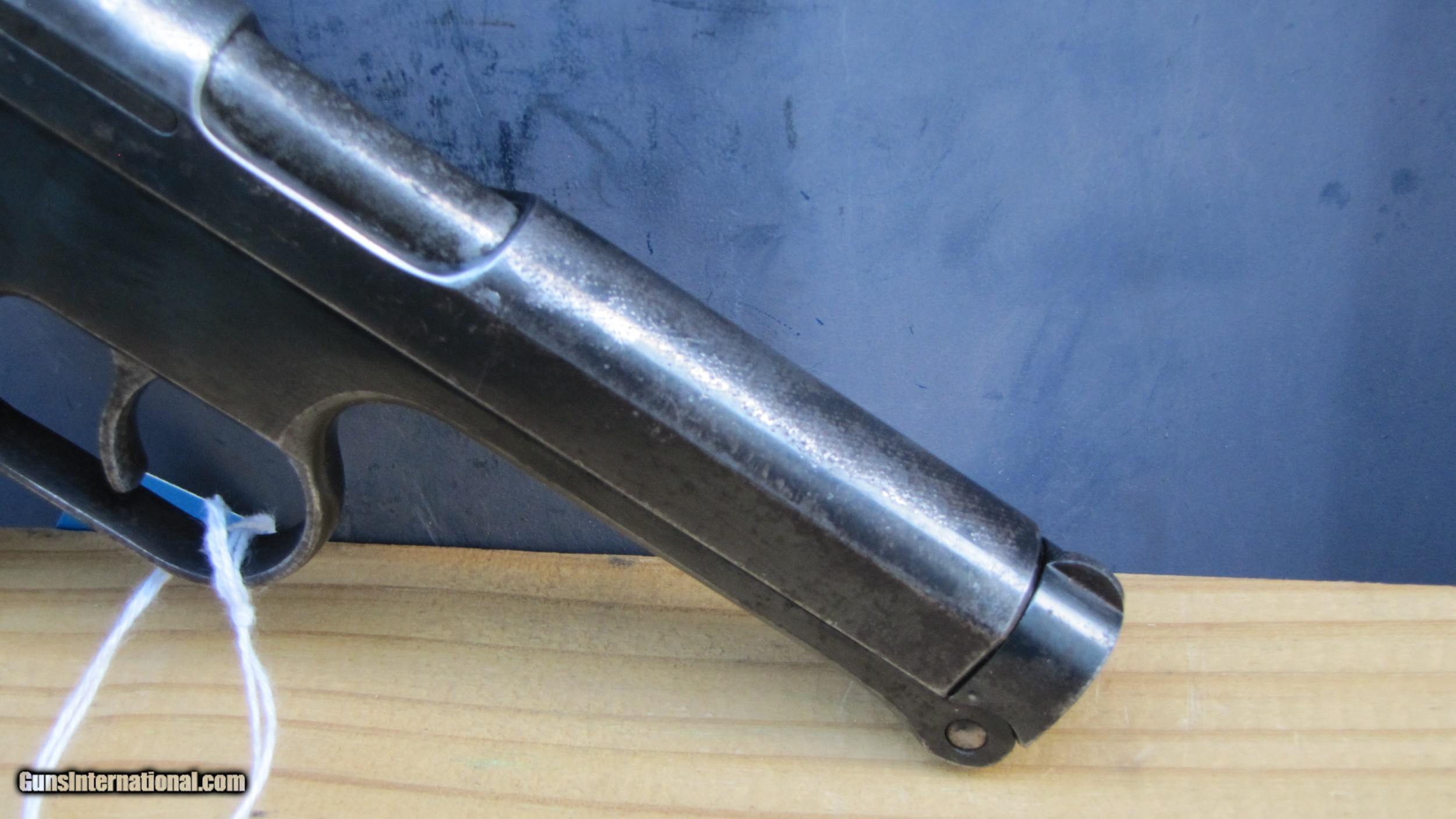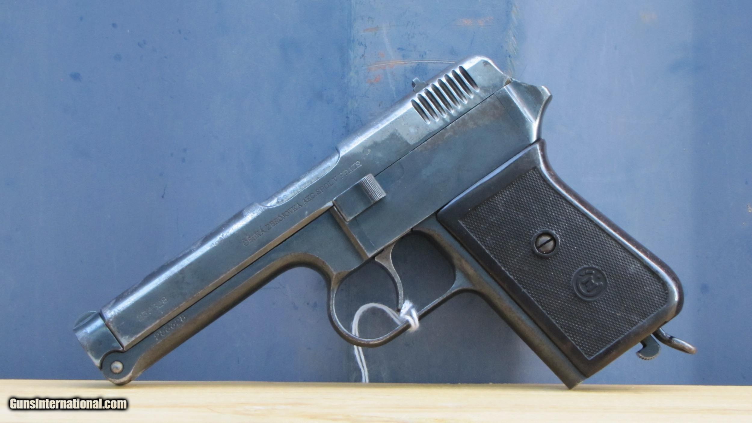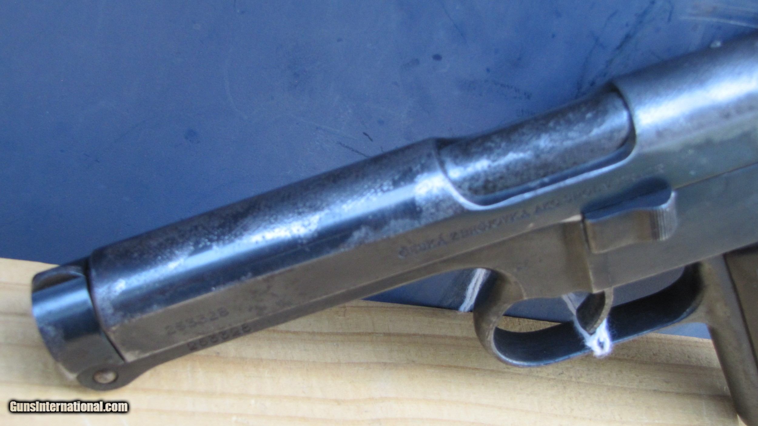 Description: Here is a very interesting pistol. It was made by CZ (Marked CESKA ZBROJOVKA AKC. SPOL V PRAZE on the slide) and is a model 1938 chambered for 380 acp. There is one magazine included but not in the pictures (my error, didn't notice it wasn't in the gun). This pistol was made in 1939 and has a very unique flip up slide for easy disassembly and cleaning. The bore looks very good with strong rifling. The top of the slide had some rust which a previous owner buffed off leaving bare metal with old pitting. Could be reblued easily. FREE SHIPPING! We are required to charge 8.25% for Texas residents. There is a 3.5% fee if paying by credit card. SOLD Handgun Caliber: .380 ACP (9x17mm Browning Short) Manufacturer: CZ Model: 1938 Serial Number: 253328 Condition: Fair Metal Condition: Fair Wood Condition: Good Bore Condition: Very Good Manufacture Date: 1939 |