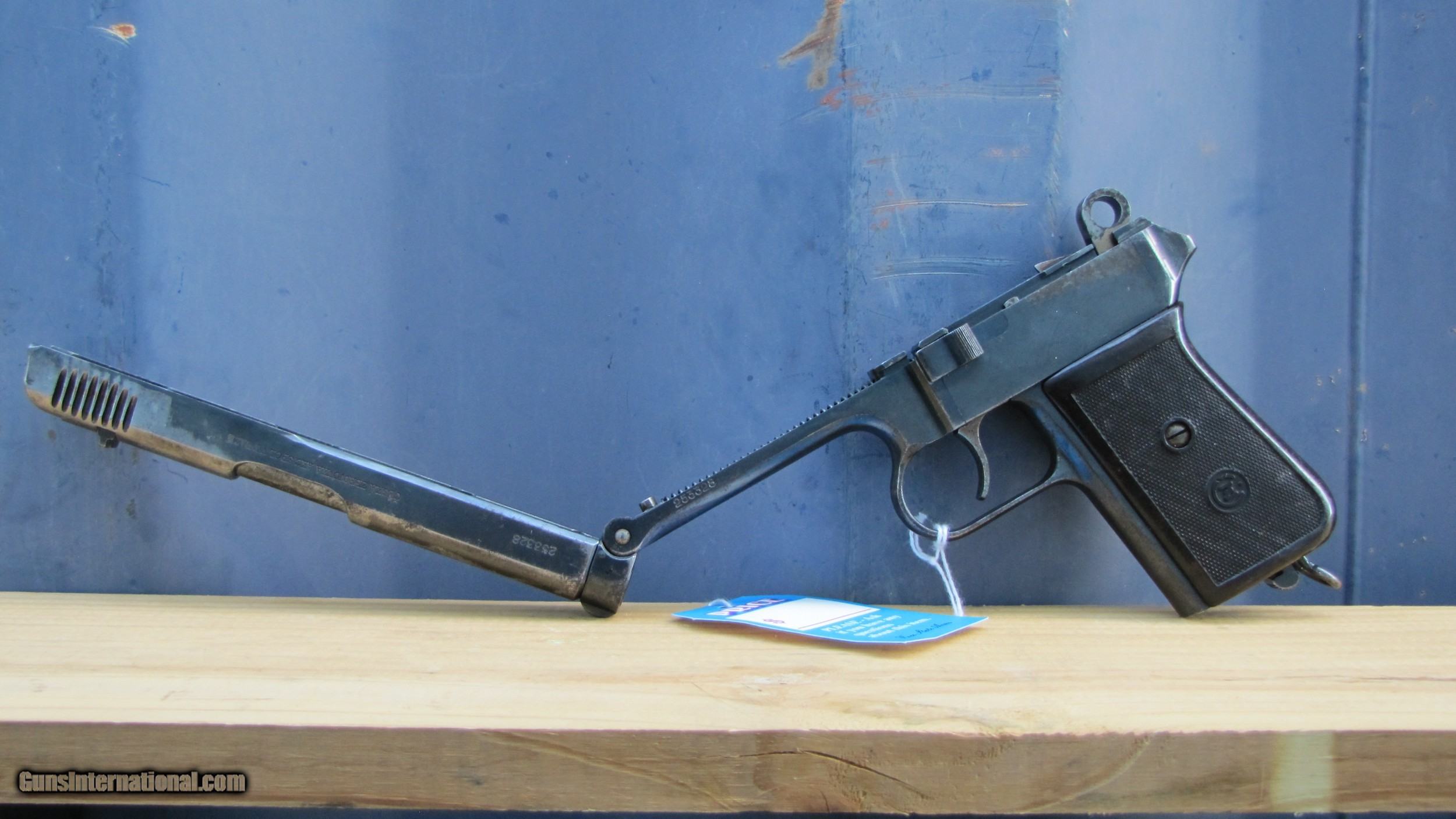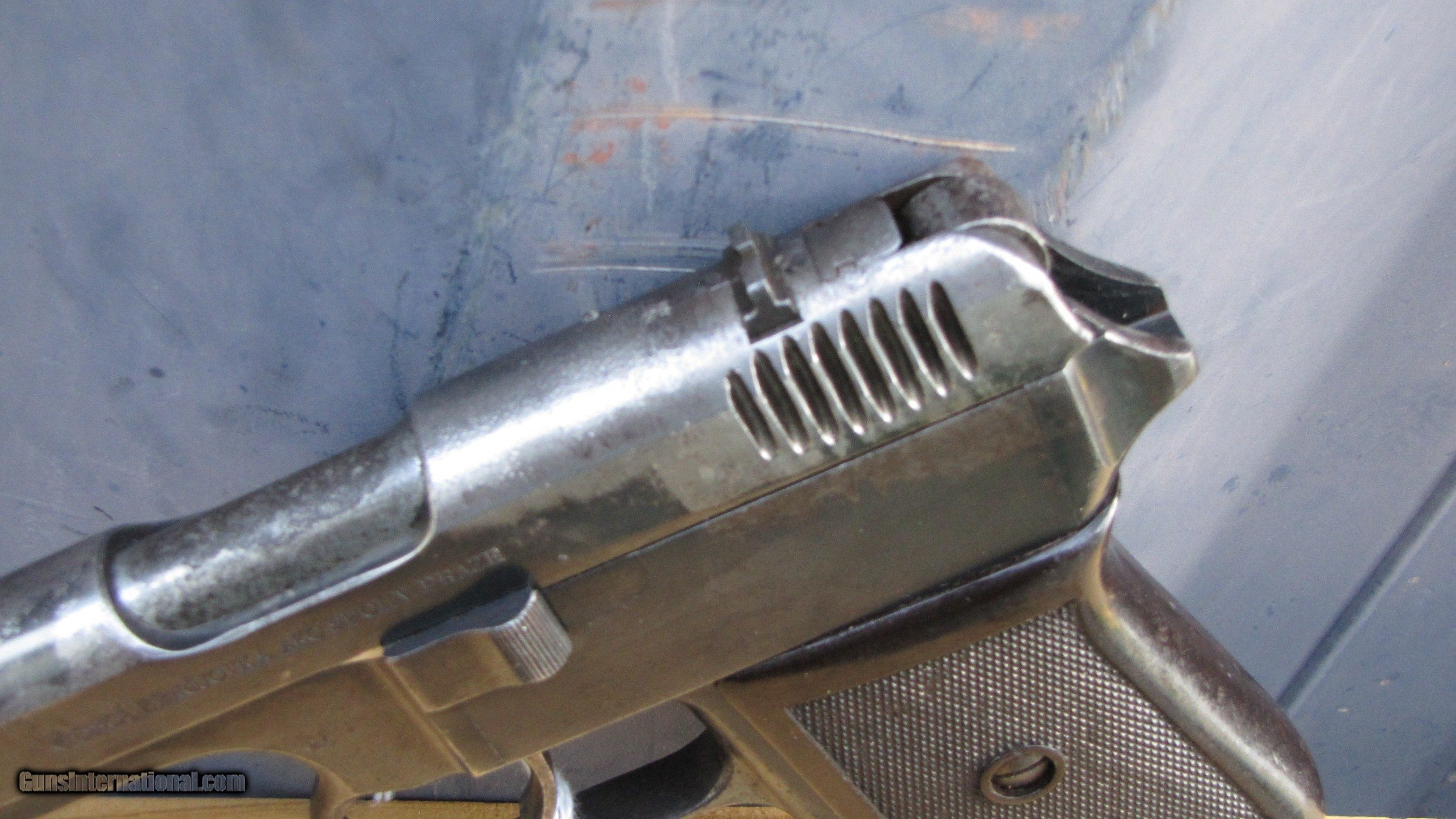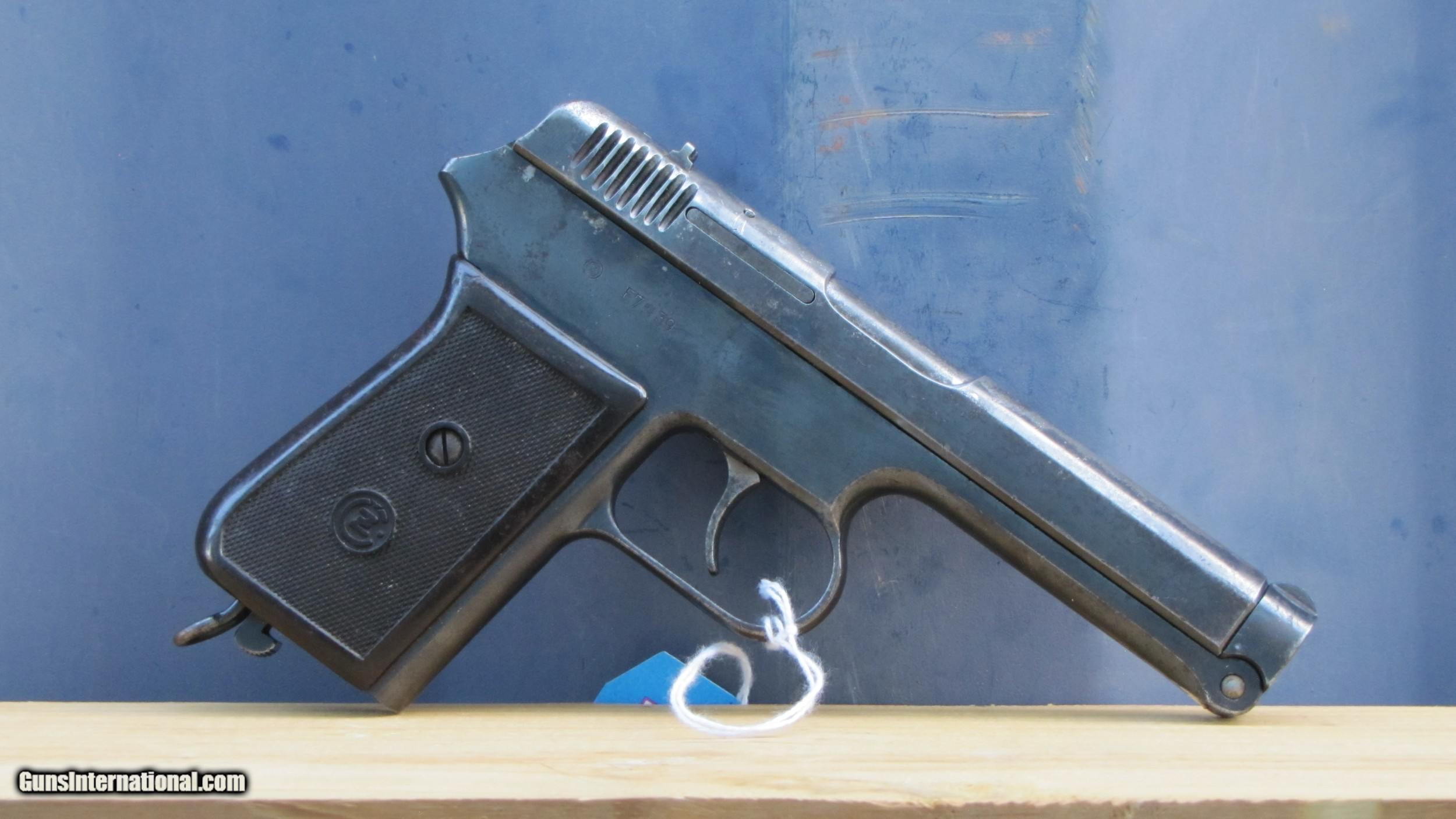Description: Here is a very interesting pistol. It was made by CZ (Marked CESKA ZBROJOVKA AKC. SPOL V PRAZE on the slide) and is a model 1938 chambered for 380 acp. There is one magazine included but not in the pictures (my error, didn't notice it wasn't in the gun). This pistol was made in 1939 and has a very unique flip up slide for easy disassembly and cleaning. The bore looks very good with strong rifling. The top of the slide had some rust which a previous owner buffed off leaving bare metal with old pitting. Could be reblued easily. FREE SHIPPING! We are required to charge 8.25% for Texas residents. There is a 3.5% fee if paying by credit card. SOLD Handgun Caliber: .380 ACP (9x17mm Browning Short) Manufacturer: CZ Model: 1938 Serial Number: 253328 Condition: Fair Metal Condition: Fair Wood Condition: Good Bore Condition: Very Good Manufacture Date: 1939 |
