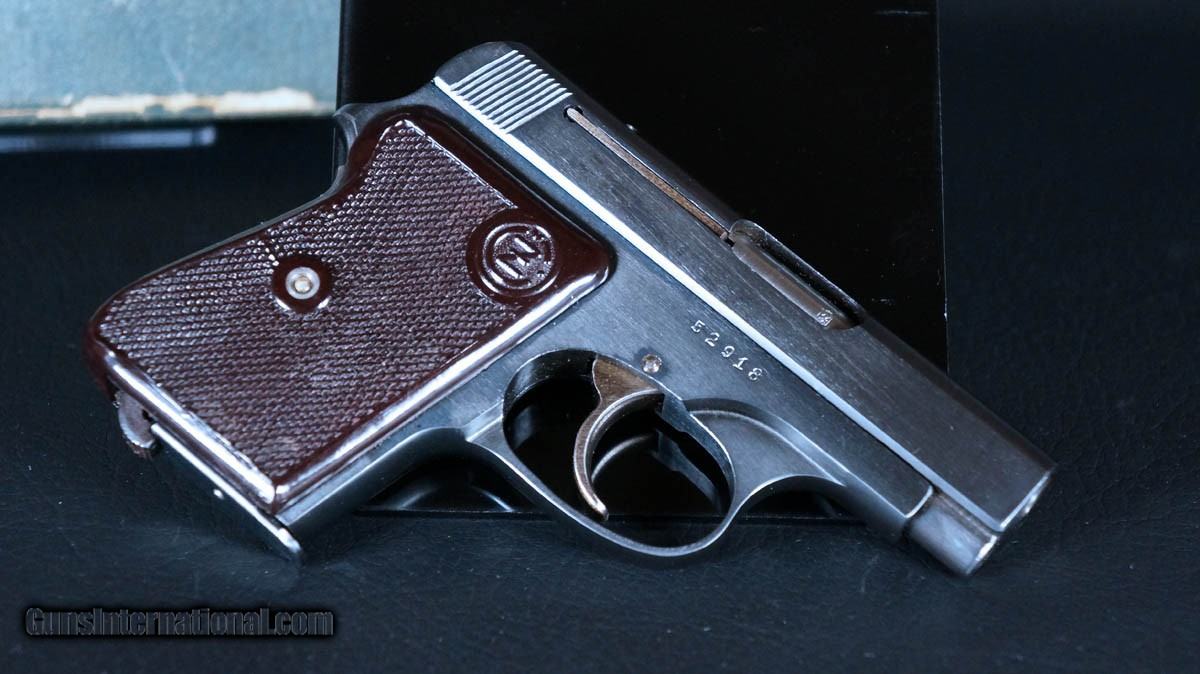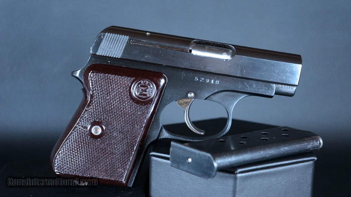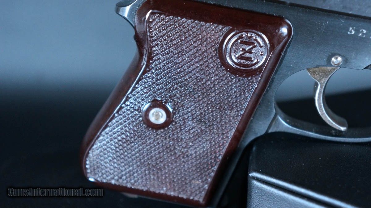 Description: CZ model 45 (1945) .25 ACP - A Cold War Spy Pistol This has been for all intents and purposes locked away in a time capsule someplace since the forties. There's no sign of of this piece having been racked, much less fired. The bluing is 99%, the straw on the trigger and hammer look like they were finished yesterday. The only spot to mention is a darker coloration about the size of a quarter to the left side of the magazine looks like it was beginning to oxidize though theres no discernible difference to the touch of the area. I was unable to capture it well in a photograph. The follower shows a slight line running down the center from having rounds loaded and light high edge silvering from being inserted. There is no silvering or wear marks on the slide, the receiver or the barrel. Includes original factory box and one magazine. Seacamp worked from this specific design in producing their .25 and .32 pocket autos. May consider trades. Shipping FFL to FFL $35.00. Thanks for looking. SOLD Curio/Relic: Yes Manufacturer: CZ Model: 45 Serial Number: 52918 Caliber Info: .25 ACP Bore: Like new Condition: Excellent Metal Condition: Like new |
