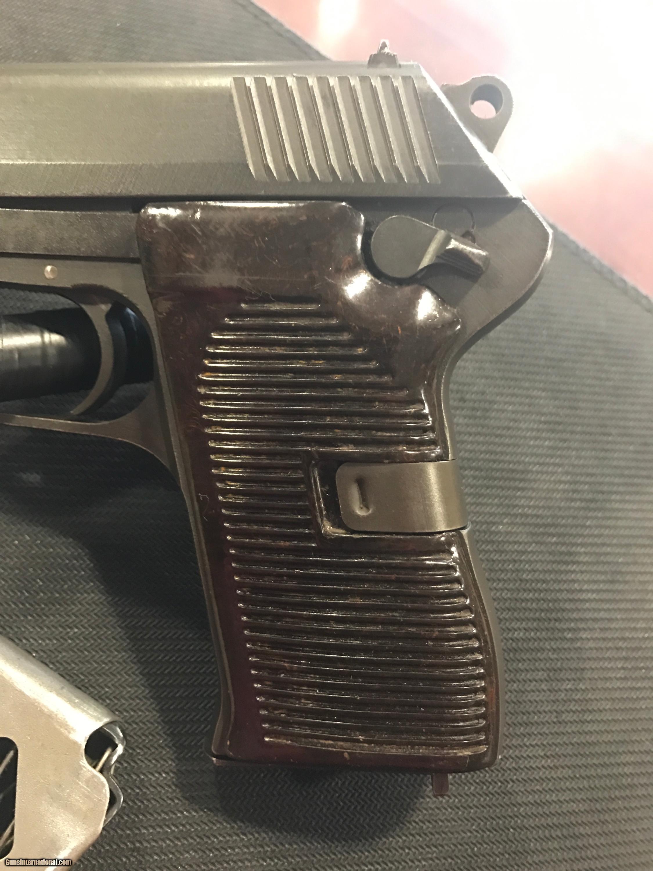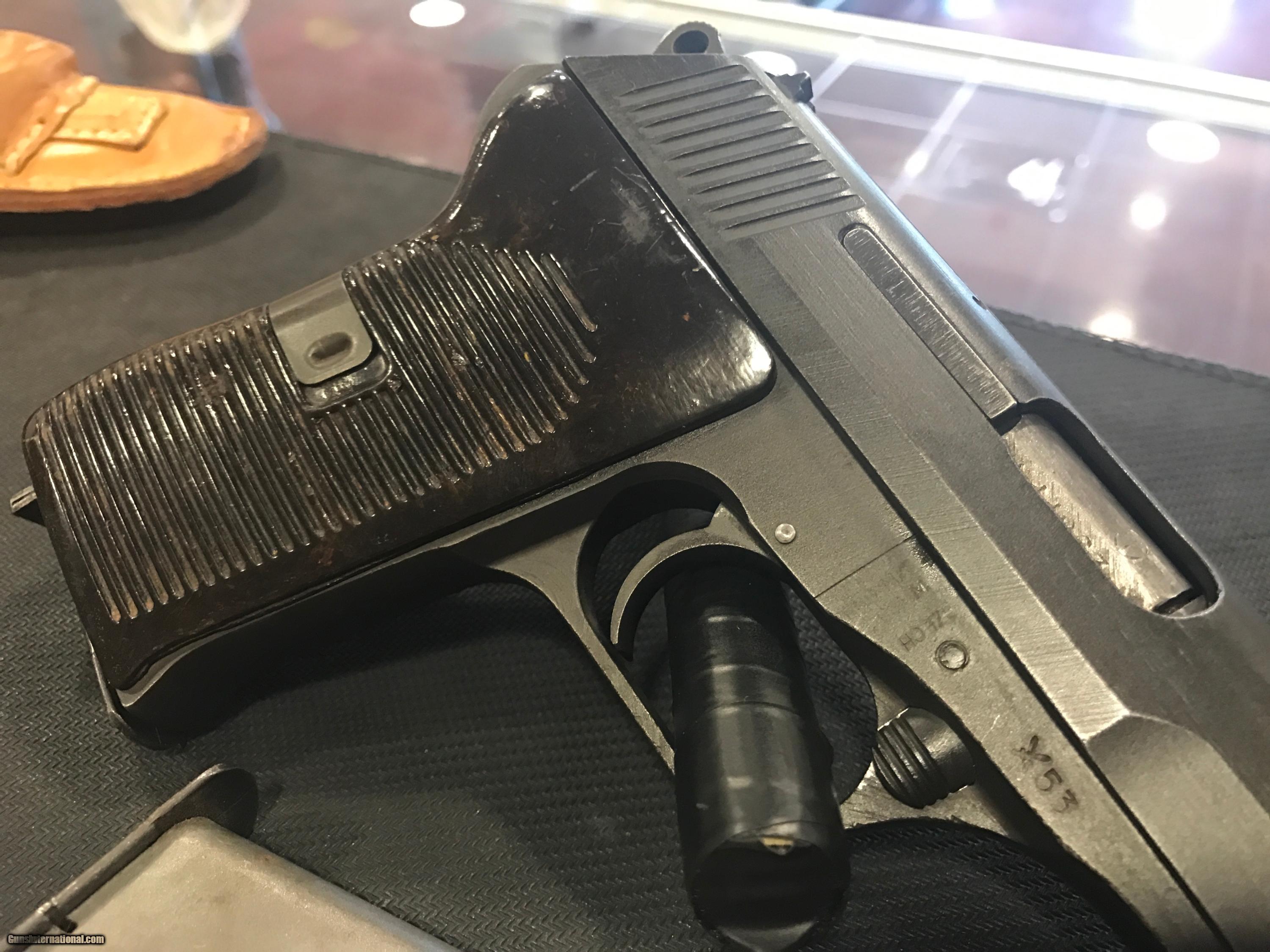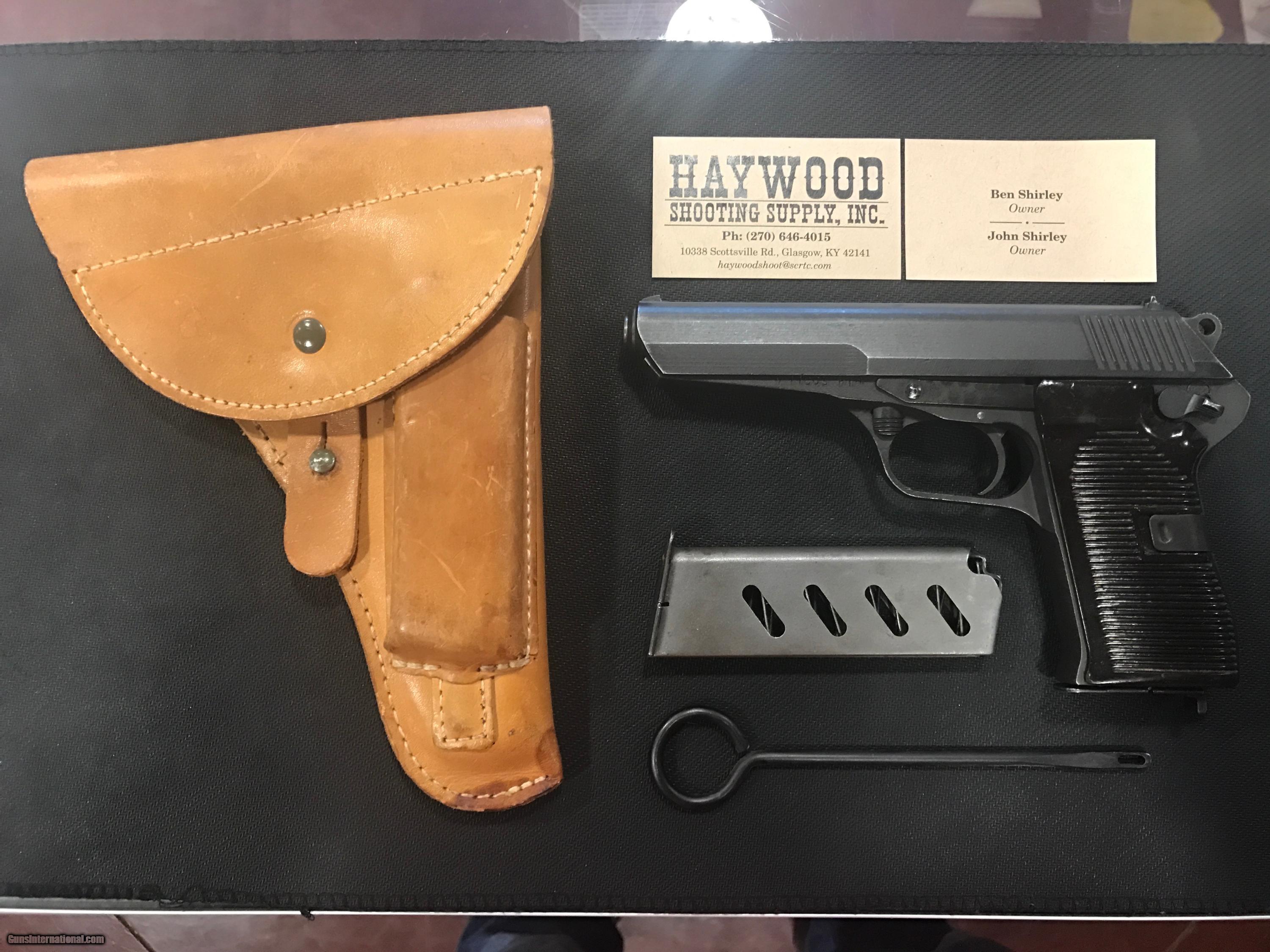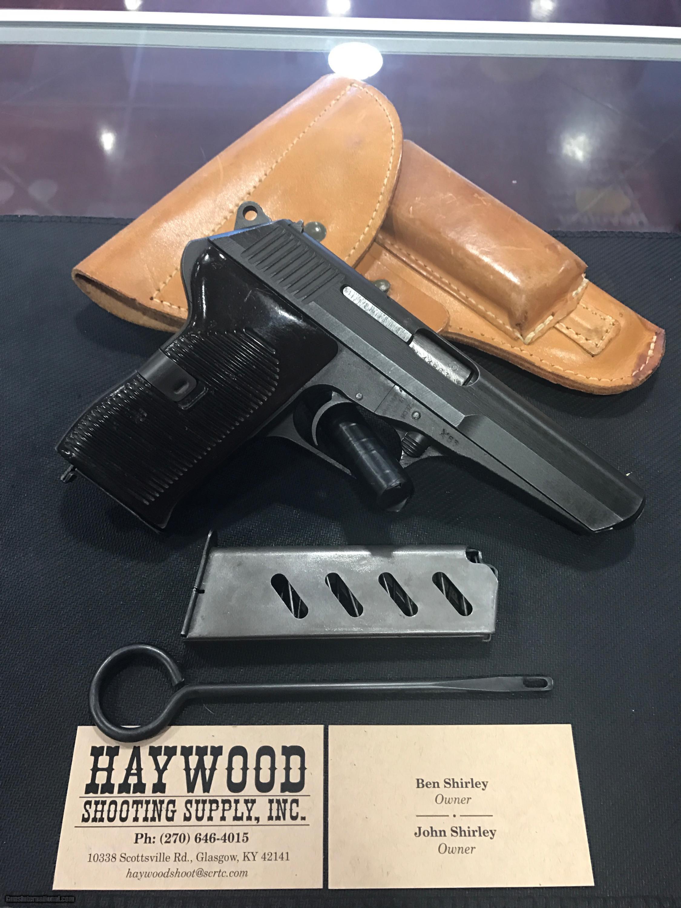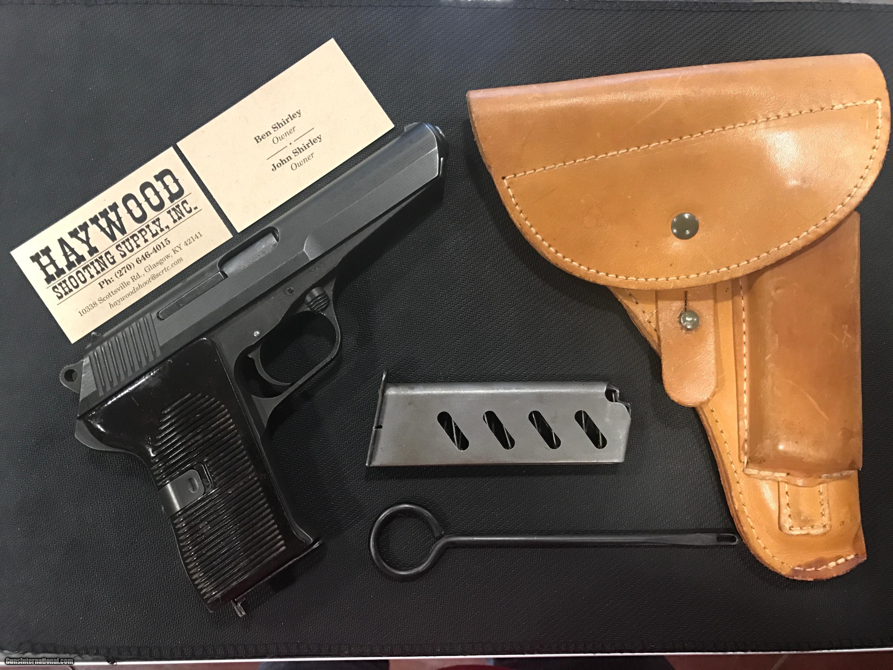 Description: THIS IS A VERY NICE CZ MODEL 52 PISTOL 7.62 X 25 CALIBER. THIS GUN IS IN GREAT CONDITION FOR ITS AGE. THIS GUN COMES WITH A BROWN LEATHER HOLSTER, TWO MAGAZINES AND A CLEANING ROD. THIS GUN IS ALL ORIGINAL AND WAS MANUFACTURED IN 1953 . VERY NICE!! FREE SHIPPING ***SORRY, NO SALE TO CALIFORNIA*** SOLD |