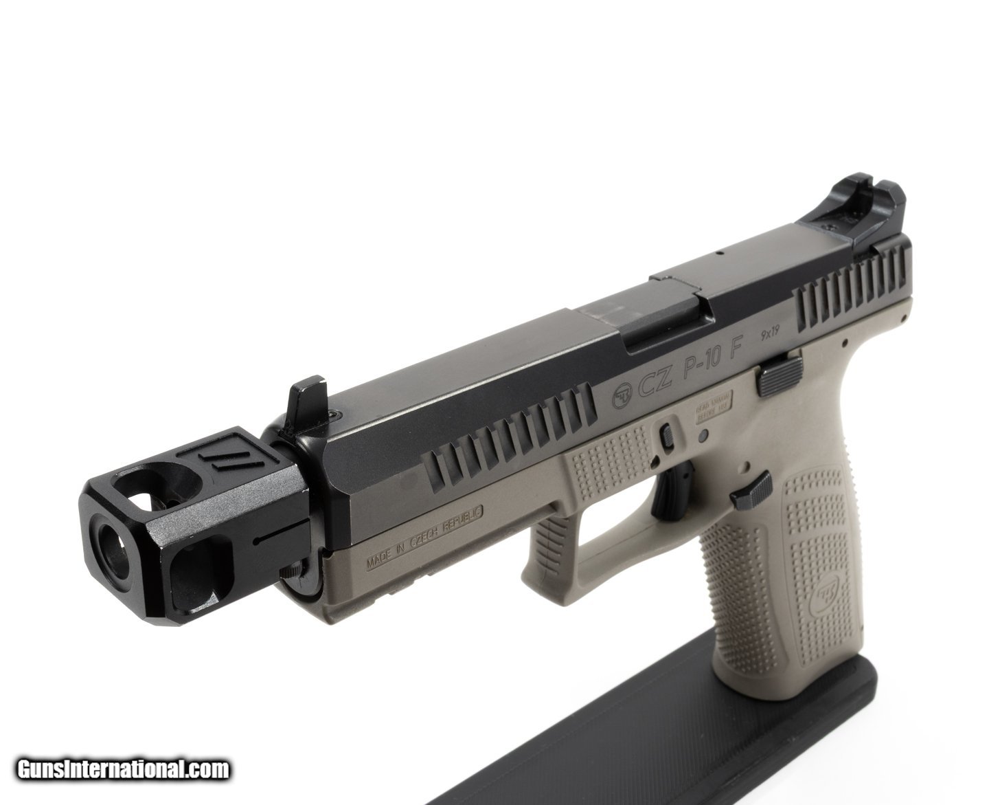 Description: Guns Listing ID: 545212 CZ P-10 F Urban Gray 9mm 10+1 Suppressor Ready w/ Zev V2 Pro Compensator Manufacturer: CZ Model: P-10 F Condition: Very Good Caliber: 9x19mm Action: Semi-Auto / Striker Fired Barrel Length: 5.25\" Overall Length: 9.1\" Capacity: 10+1 Sights: Raised Night Sights Size: Full Finish: Urban Gray frame, black slide Muzzle: Zev V2 Pro Compensator Other Features: Threaded barrel, ambi slide catch, accessory rail. Origin: Czech Republic Inventory: Firearm, comp, (1) 10-rd magazine only, no box. • Please be aware that we have not test fired this gun. Unless otherwise stated, expect this firearm to fire and function safely. SOLD Manufacturer: CZ Model: P-10 F Caliber Info: 9MM LUGER (9x19 PARA) Condition: Used - Non-Certified Barrels: 5.25" BARREL Action: SEMI AUTOMATIC Finish: urban grey |