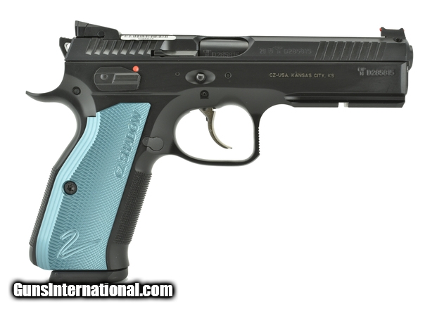 CZ Shadow 2 9mm caliber pistol. New Competition Ready model with blue grips and fiber optic sights.