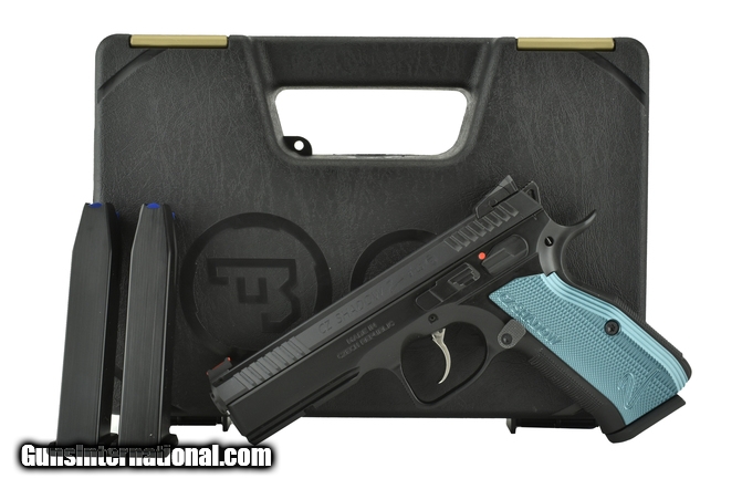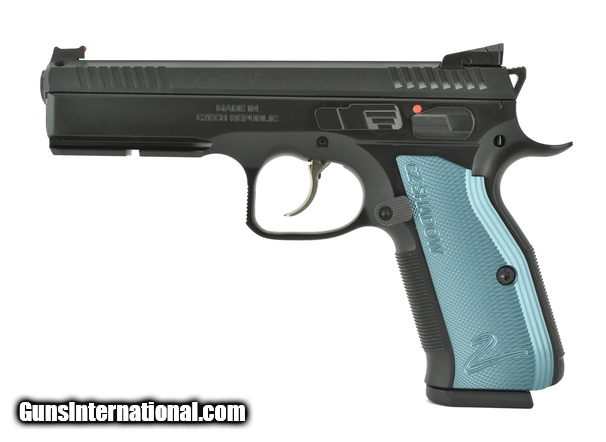 Description: CZ Shadow 2 9mm caliber pistol. New Competition Ready model with blue grips and fiber optic sights.