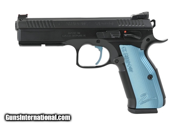 Description: CZ Shadow 2 9mm caliber pistol. Single action model with fiber optic sights, light rail with blue aluminum grips. New.