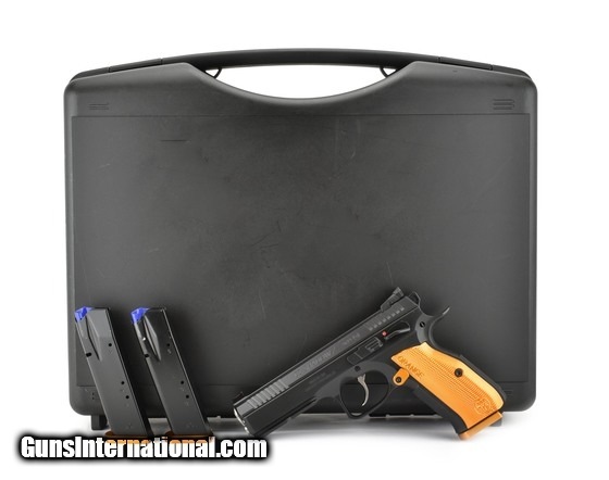 CZ Shadow 2 9mm caliber pistol. Custom Shop target model with orange grips. Excellent condition with box and magazines.