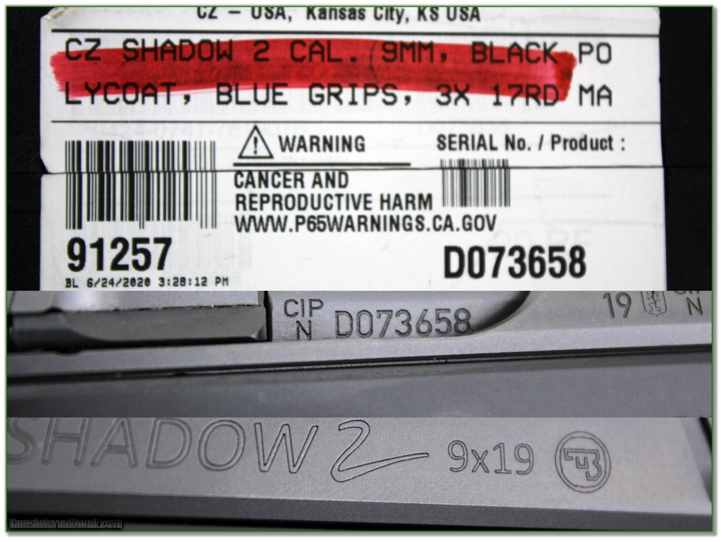 CZ Shadow 2 Black & Blue 9MM NIC 3 mags