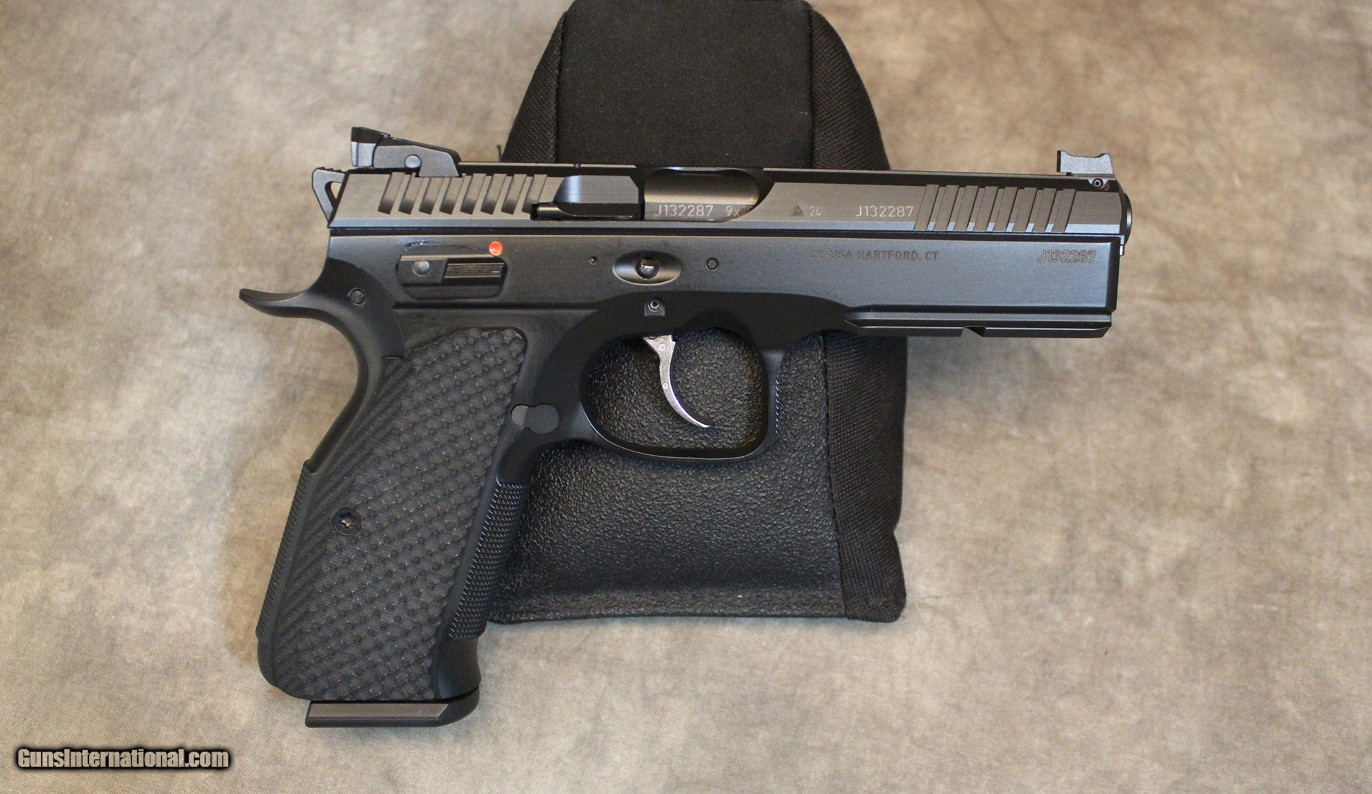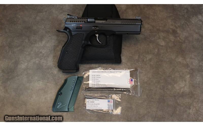 Description: This CZ Shadow 2 is in excellent condition. It shows very little evidence of use. Its grips have been upgraded to black G10 grips (original blue grips included), its ambidextrous safety has also been upgraded to a right side extended and flat left side safety (original included). The recoil springs have also been upgraded. It should make a very nice match gun. 9mm Luger SOLD Chambers: 9mm Luger Metal Condition: Excellent Bore Condition: Excellent Barrels: 4.7 Triggers: SA/DA Weight: 46.5 oz Sights: "Black notch rear adjustable for height, black post front Item Location: Columbia, MO |