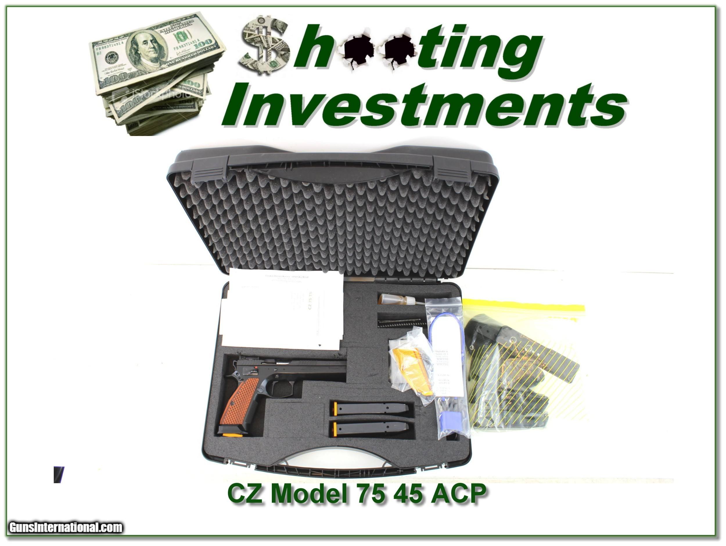 Description: This is a TSO set up perfectly for USPSA Limited Class, but its owner aged out of the sport. This pistol is very accurate, and the trigger is perfect. It was test-fired (10 rounds) before sending to Cajun Gun Works that installed a CZ Custom extended safety, a straight aluminum trigger and melded the magwell with the gun’s frame (a nice modification that improves the gun), installed a fully-adjustable Bomar style sight and competition springs. The pistol is unfired since its return from CGW. It comes with Loc grips, 6 factory magazines and a custom Kydex holster that will accommodate the pistol's factory thumb break if you choose to use it. In its current spring configuration, slide does not lock back. All original parts, original paperwork, custom work invoices and factory springs are included. I am selling this one on consignment and as such lay-a-way can’t be used. It does of course have the standard 3-day inspection. Shipping and insurance is $49. Please email me with any questions or larger pictures. (Consign your quality firearms with Shooting Investments for only 12%! Let me know if you have any you would like to sell!) 20-0157 Payment: Payment is by Money Order, Cashiers Check or Personal Check. I can now also accept Credit Cards (MasterCard, Visa, Discover & American Express) with a 3% convenience fee. Shipping: The shipping charge will be listed in each description. It is $39 for most firearms. Some heavy guns or those insured for over $2000 will be higher. Shipments to Alaska and Hawaii are higher because air shipment is required. Most firearms are shipped on Tuesday and Thursday and usually in 5 days of receipt of payment. We package all shipments carefully and insure them. Optics are shipped Priority Mail and most other non-firearm shipments are shipped First Class. Returns: Our return policy is simple. If for any reason you are not pleased with your purchase, you may return your item for a full refund of purchase price. Ammunition cannot be returned. It is important to us that you are happy. Guns cannot be fired or dissembled before returning them and they must be returned in the same condition as received. Notification of a return must occur with-in 3 days of receipt at your dealer. Shipping, convenience and dealer fees are not refundable and are the responsibility of the buyer. Lay-a-way: If needed, we offer a 60 day lay-a-way option on most firearms. It is 1/3 now, 1/3 in 30 days and 1/3 in 60 days. Lay-a-way firearm sales are final and if not completed the first payment cannot be returned. Consigning your firearms with Shooting Investments: We will help you get top dollar for your firearms. While most local guns shops charge 20% or more, our fee is only 12% with a minimum of $75. At your local gun shop it might take months to sell. Selling on-line provides instant access to thousands of interested buyers. You won’t find any other on-line dealer willing to sell your firearms for only 12% or listing every gun on 3 separate s. Selling through an House typically costs the seller 15% and the buyer an addition 15% (so 30%) and you have to wait several months to sell and longer to receive funds. If properly priced, we will sell your firearms in a few weeks. Send us an email or give us a call and we’ll explain how easy it is for you to get top dollar. Trading: Trading for use is really just buying your gun to re-sell. If you have a gun you want to trade, please email a picture and we will let you know what we can give or it. You will always get more if we sell it for you on consignment. Help for California Buyers: We are happy to ship to California. It is the buyer’s responsibility to make sure any item you buy is legal in your state. We are also happy to help with your purchase of a firearm from someone other than us. If you see a gun you would like to buy but the seller can’t or won’t ship to California they can ship to use and we’ll then ship it to your California dealer. The cost for this service is only $30 + shipping. Let us know if we can help! SOLD |