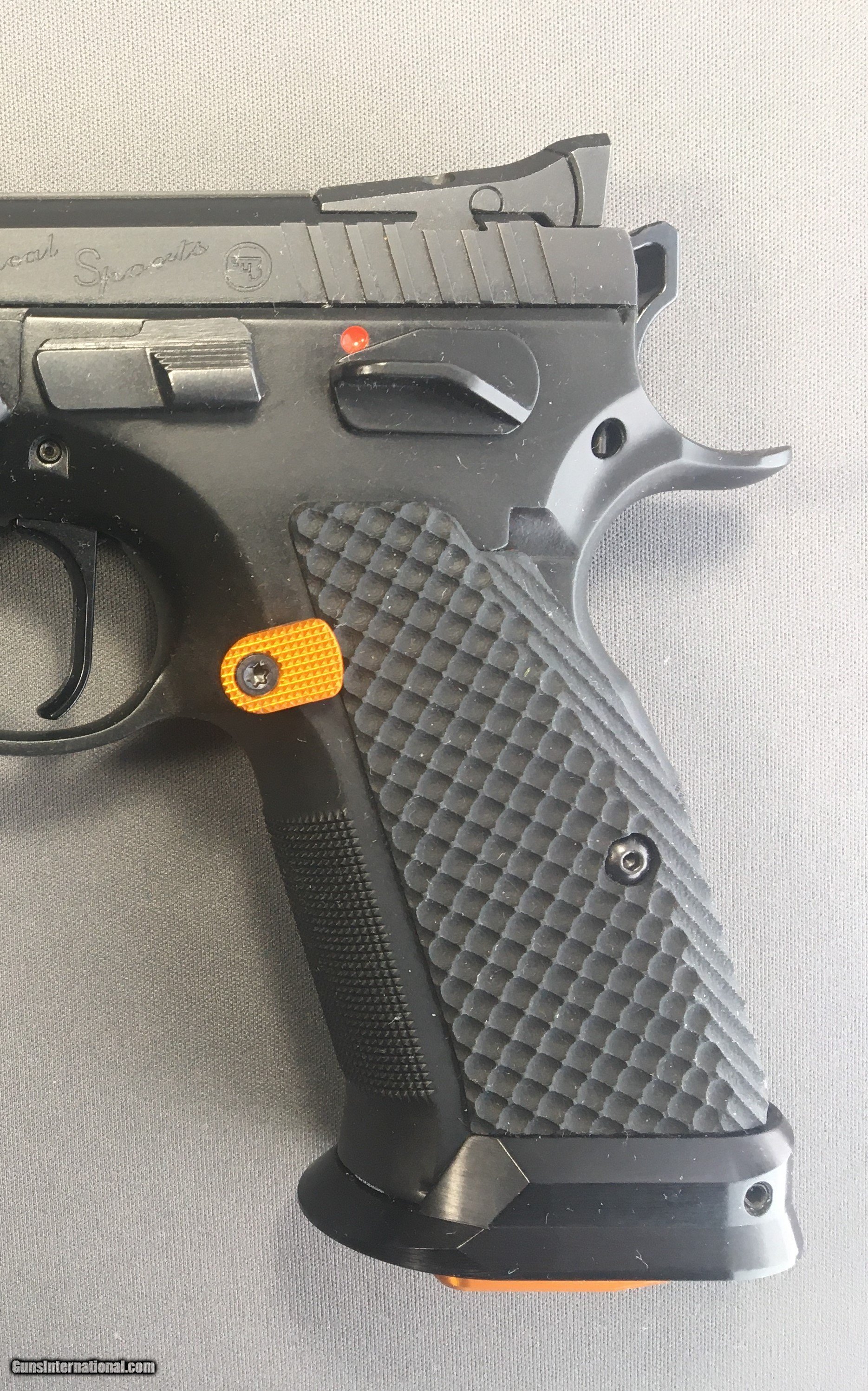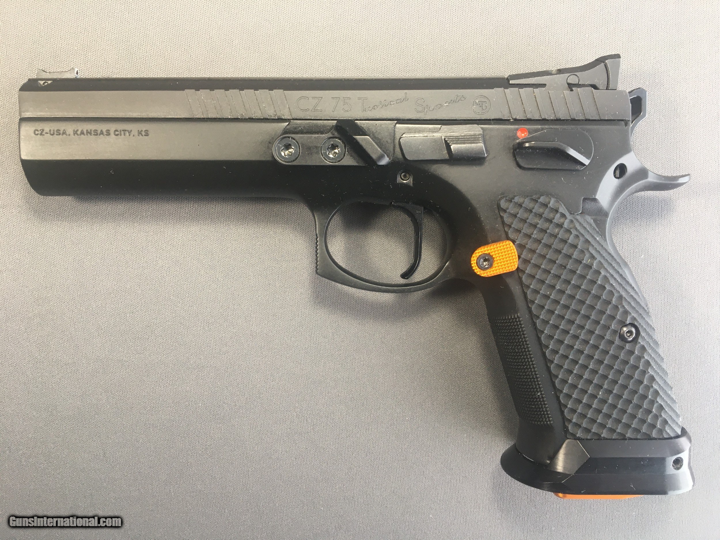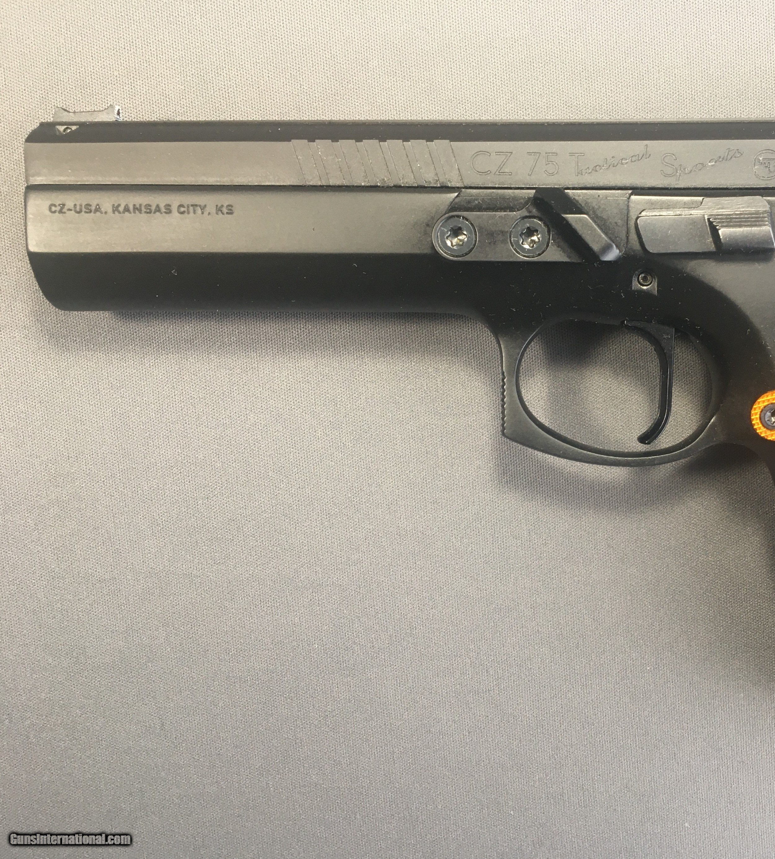 CZ 75 TSO SAO 9mm semi-automatic pistol. The original factory orange aluminum grips are included along with a set of installed Lok black Bogie grips and orange liner. The pistol has a steel frame, full length dust cover, black Polycoat finish, cold hammer forged 5.23 inch barrel, ambidextrous safety, thumb rest, extended magazine release and adjustable rear target sight and red fiber optic front sight- I painted white around the front sight fiber optic stick to improve visibility. Excellent factory SA trigger is less than 2 pound pull. Overall length 8.9 inches and weight is 47.5 ounces. It comes with 3- 20 round factory magazines- some slight bluing wear on the magazines from loading, the original CZ foam lined case and all the extra parts that are packaged in plastic bags and have not been opened. The foam lined case has some slight edge wear on the foam at the top of the slide near the front sight and can be seen in the photos. The pistol has never been holstered, has a mirror bore and is in as new condition. I test fired 75 rounds for function. Shipping & insurance $45.00 Price $1495.00