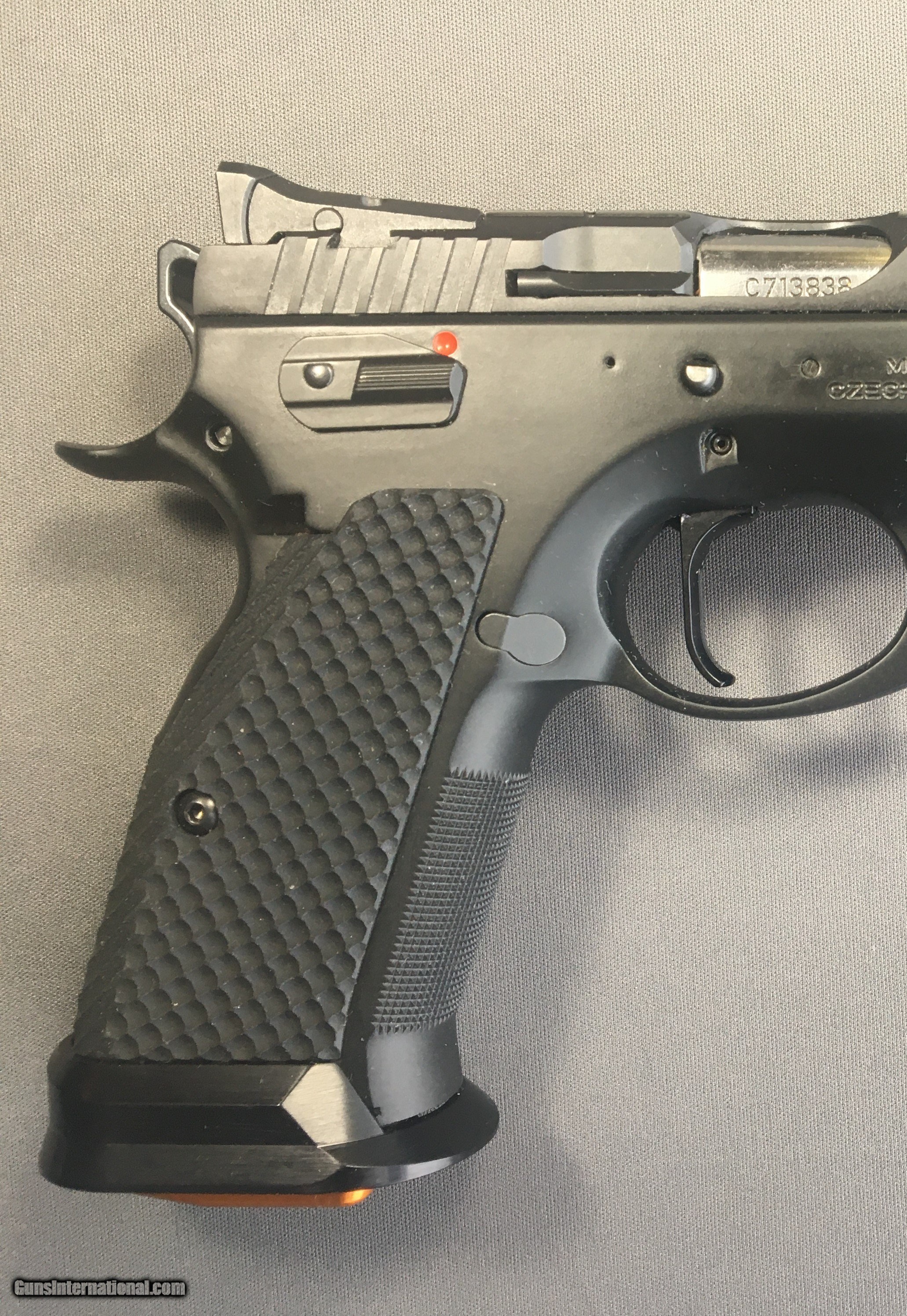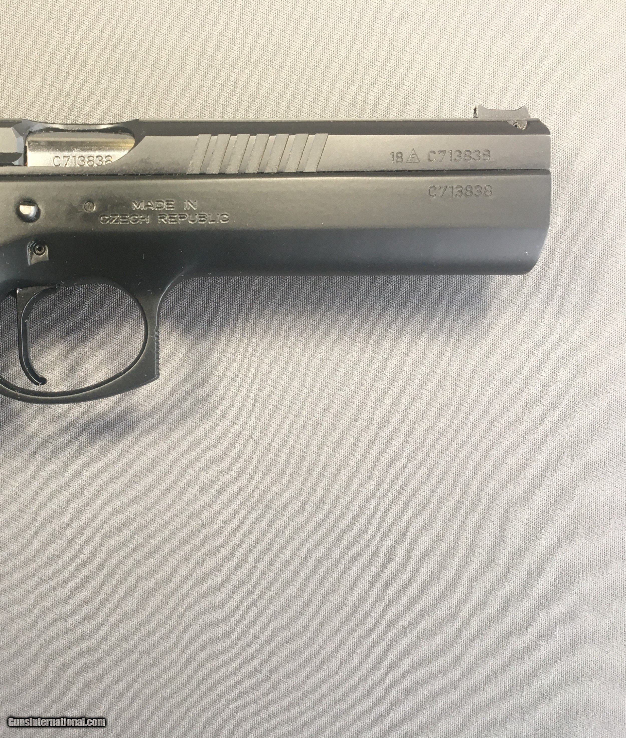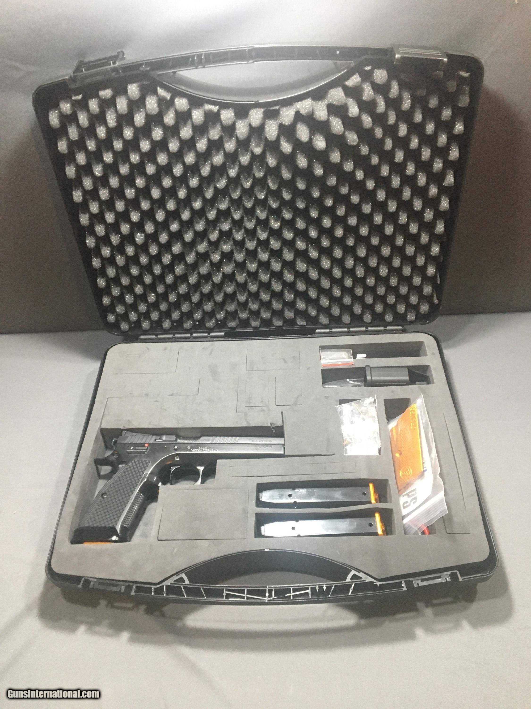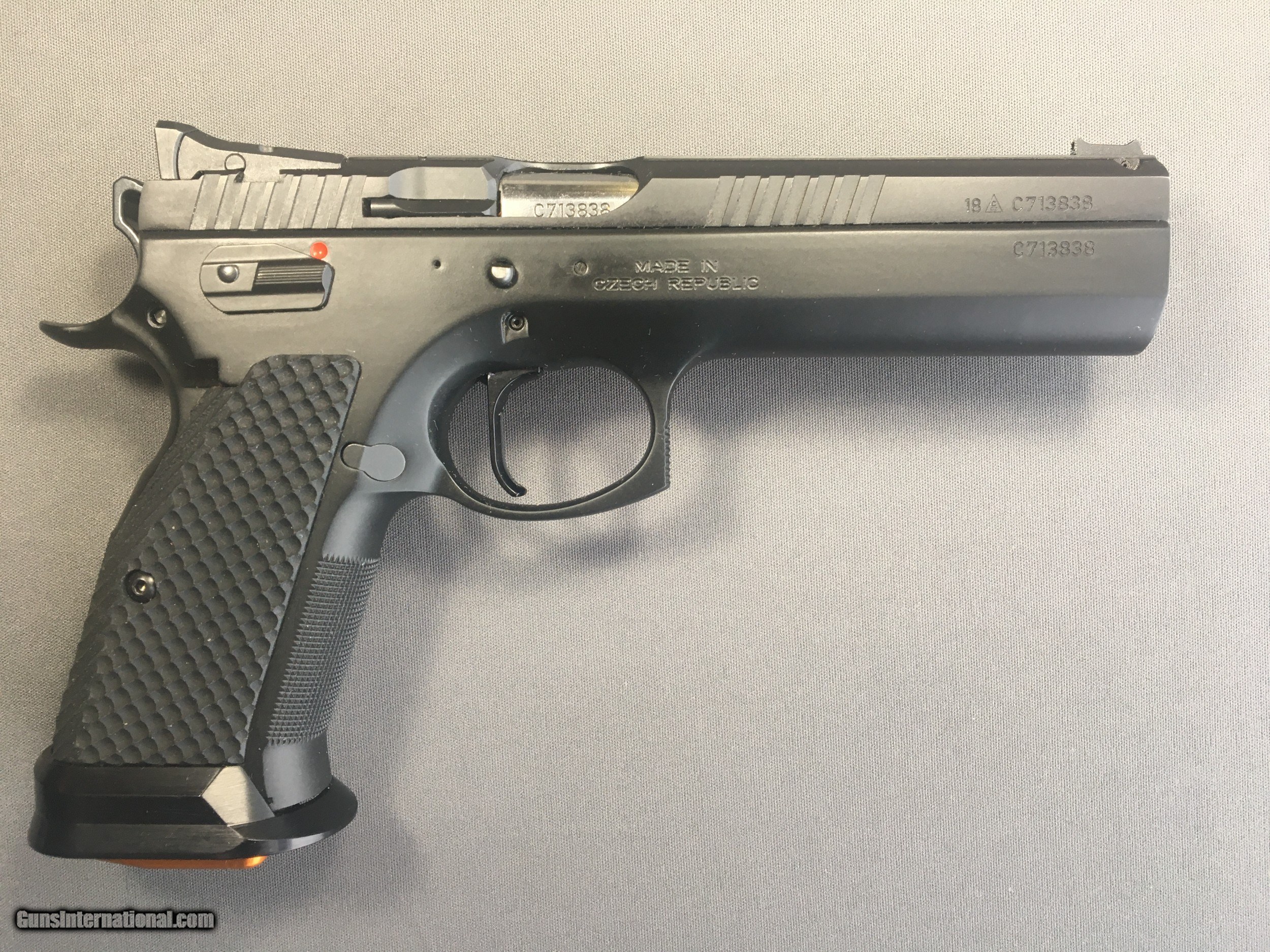CZ 75 TSO SAO 9mm semi-automatic pistol. The original factory orange aluminum grips are included along with a set of installed Lok black Bogie grips and orange liner. The pistol has a steel frame, full length dust cover, black Polycoat finish, cold hammer forged 5.23 inch barrel, ambidextrous safety, thumb rest, extended magazine release and adjustable rear target sight and red fiber optic front sight- I painted white around the front sight fiber optic stick to improve visibility. Excellent factory SA trigger is less than 2 pound pull. Overall length 8.9 inches and weight is 47.5 ounces. It comes with 3- 20 round factory magazines- some slight bluing wear on the magazines from loading, the original CZ foam lined case and all the extra parts that are packaged in plastic bags and have not been opened. The foam lined case has some slight edge wear on the foam at the top of the slide near the front sight and can be seen in the photos. The pistol has never been holstered, has a mirror bore and is in as new condition. I test fired 75 rounds for function. Shipping & insurance $45.00 Price $1495.00