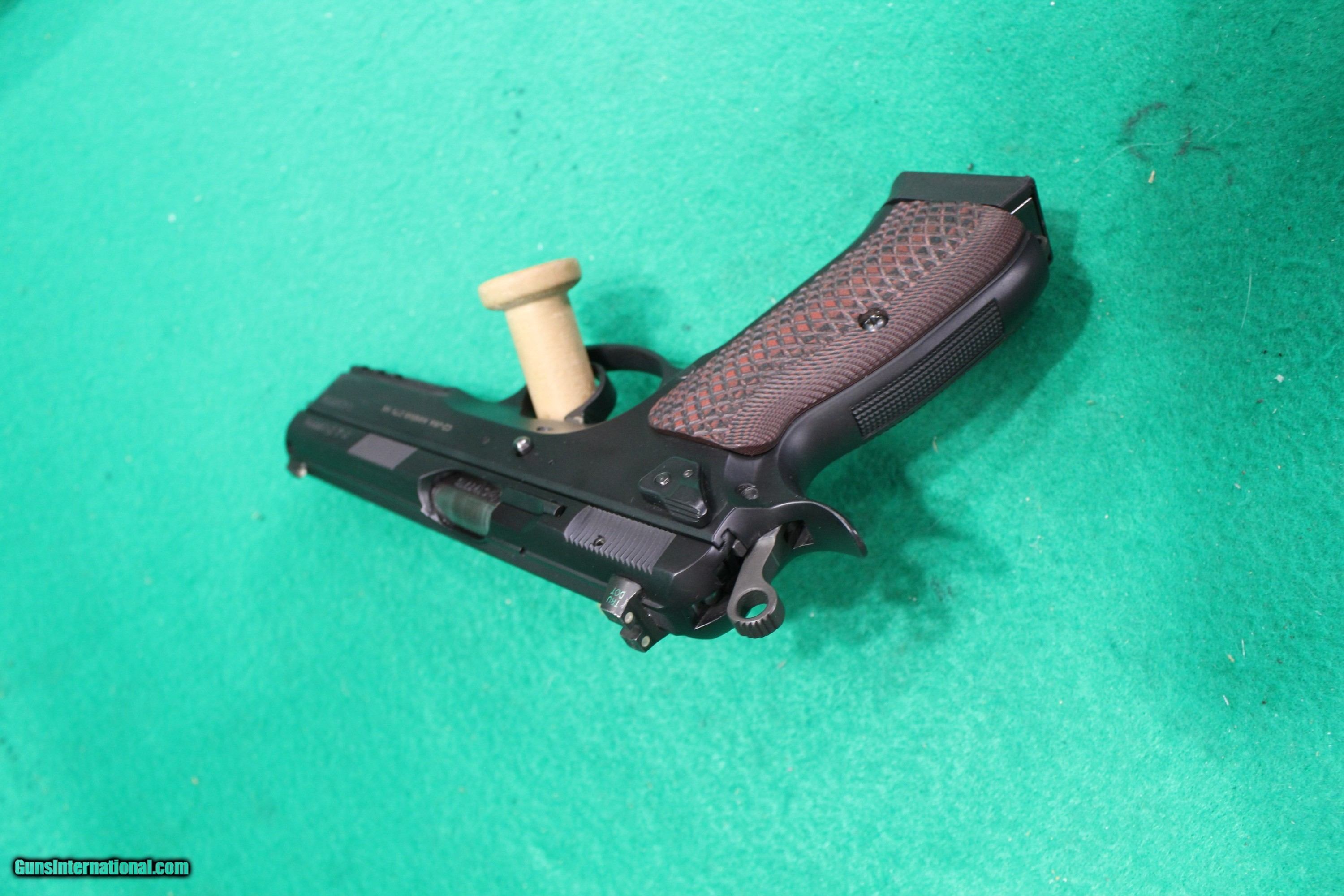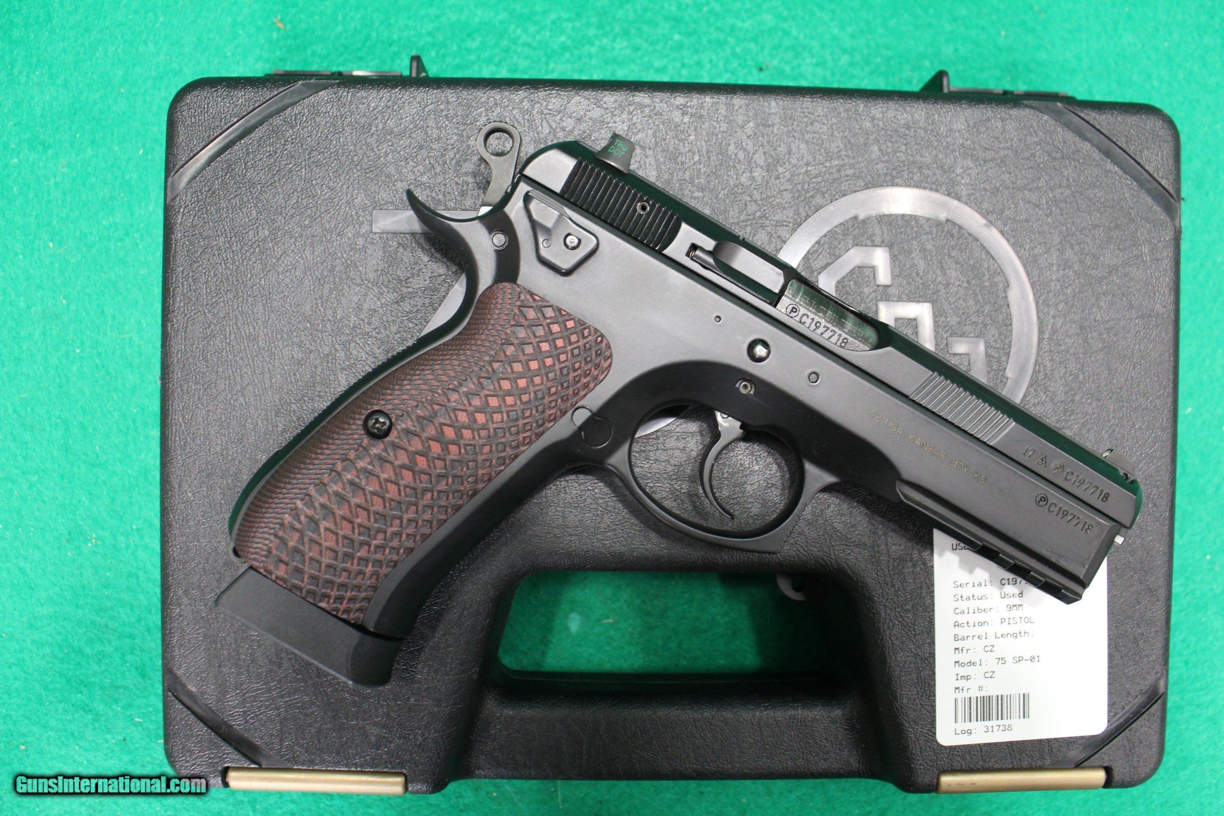 Description: The CZ 75 SP-01 is the first full size handgun (4.6 bbl) from CZ to feature the improved manufacturing technology and ergonomics of the NATO-approved CZ 75 Compact P-01 model. Based on the CZ 75 DA/SA platform the SP-01 features an integral 1913 accessory rail on the dust cover rubber grip panels and CZ's corrosion resistant black polycoat finish. It utilizes an extended beavertail to protect the shooter's strong hand as well as allowing for a deeper and more secure grip. The grip geometry checkering in key areas on the front and back straps and redistribution of mass provided by the accessory rail noticeably decreases the perceived recoil from previous models and allows for more rapid target acquisition and transition. Selling as used in like new condition. SPECIFICATIONS