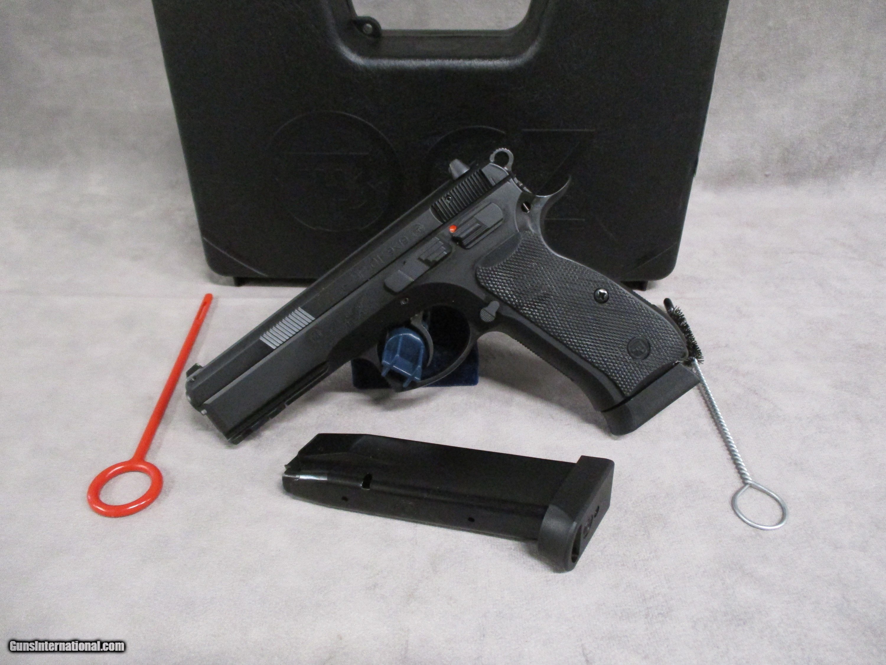 Description: The CZ 75 is a world-famous pistol that has seen service with many countries around the world and has seen extensive use with both law enforcement and military. In the U.S. it has even been used by Delta Force. The CZ 75 caused a stir when it was introduced as it was one of the first “Wonder Nine” pistols, i.e., pistols that featured dual-mode operation. The pistol could be carried in the conventional Double-Action/Single-Action mode of operation or it could be carried in the “cocked-and-locked” format like the 1911. It also featured superb grip ergonomics which are considered excellent even by today’s standards. The CZ 75 took a great deal of inspiration from the Browning High Power introduced in 1935. As such, it bears more than a passing resemblance to that pistol. However, the 75 is by no means a copy of the High Power and is a great design in its own right. One if the 75’s standout features is its excellent ergonomics. The pistol simply feels “right” in the hand, as if it does not belong anywhere else. This is part of the reason for the pistol’s widespread popularity. Indeed, its popularity has resulted in it being one of the most copied handguns in the world save for the 1911. The 75 shown here is the famous SP-01 model. It has a 4.6” hammer-forged barrel, 3-dot sights, and a manual safety lever. The most notable difference between the standard CZ 75 and SP-01 is the latter’s frame which features a railed dust cover for the mounting of a laser or flashlight. The redistribution of mass provided by the rail makes the SP-01 a bit more nose-heavy, which reduces the felt recoil and allows for faster target acquisition. The SP-01 frame also utilizes an extended beavertail to protect the shooter’s hands. This feature allows for a deeper and more secure grip as well. This new-in-box pistol comes with its box, manual, and two 19-round magazines. Cajun Gun Works produces a trigger kit known as the SRS-2, where “SRS” stands for Short Reset System, that significantly improves the feel of the SP-01’s trigger. The item’s SKU is literally “SRS-2”. Cajun Gun Works also produces an IDPA Production Legal trigger set for both the manual safety (SKU: 75115) and de-cocker (SKU: 75215) versions of the SP-01. Both sets include the necessary internal parts, a hammer, and a combat trigger. SOLD Handgun Caliber: 9x19mm Parabellum (9mm Luger, 9x19mm NATO) Manufacturer: CZ-USA Model: SP-01 Serial Number: H144365 Bore: Rifled, 6 grooves, 1:10 inches (1 in 254 mm) RH twist Ejectors: Auto-ejection Condition: New in Box Barrels: Cold hammer-forged steel Barrel Type: Tilting Action: Browning type short-recoil, locked breech, tilting barrel Triggers: Standard Curved Stock: Steel frame with checkered rubber grips Fore End: Steel, picatinny rail Finish: Black Polycoat Weight: 40.7 oz. Sights: Three dot sights, sight radius 6.1 inches (155 mm) Manufacture Date: 2023 Case: CZ Box |