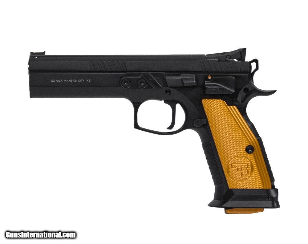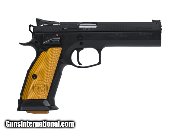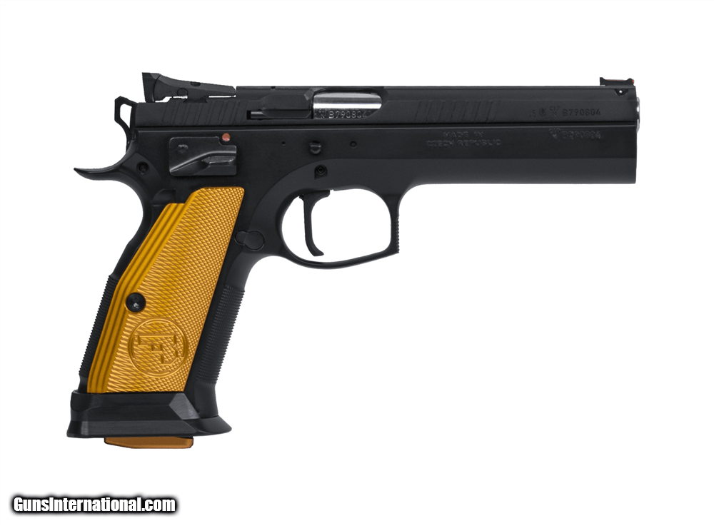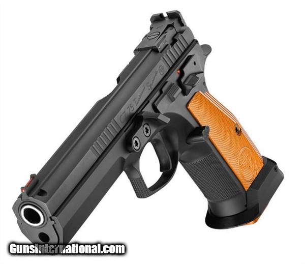 Description: Manufacturer: CZ-USA Model: CZ 75 Tactical Sport Orange SKU: 91261 Caliber: 9mm Luger Capacity: (3) 20 Round Double Stack Magazines Barrel: 5.23" Cold Hammer Forged Frame: Steel, Black Polycoat Grips: Orange Checkered Thin Aluminum Trigger Mech: Single Action Only Sights: Adjustable Target Weight: 47.5 oz Overall Length: 8.86" Safety: Ambidextrous Manual Safety, Safety Stop on Hammer Turning the Tactical Sport up a notch, the Orange borrows a number of design features from the Czechmate and incorporates a few of its own. With the slimmer trigger guard, revised grip geometry and finer checkering from the Czechmate frame, it adds a thumb stop and fully-adjustable target sights. With the same long slide and full-length dust cover as the standard TS, it also shares the single-action-only trigger, giving it an incredibly light pull and short reset, making it a joy to shoot at the range and deadly in competition. SOLD |