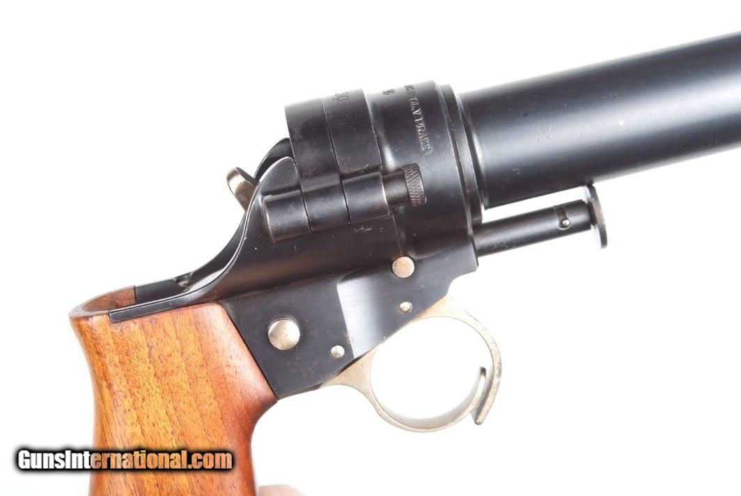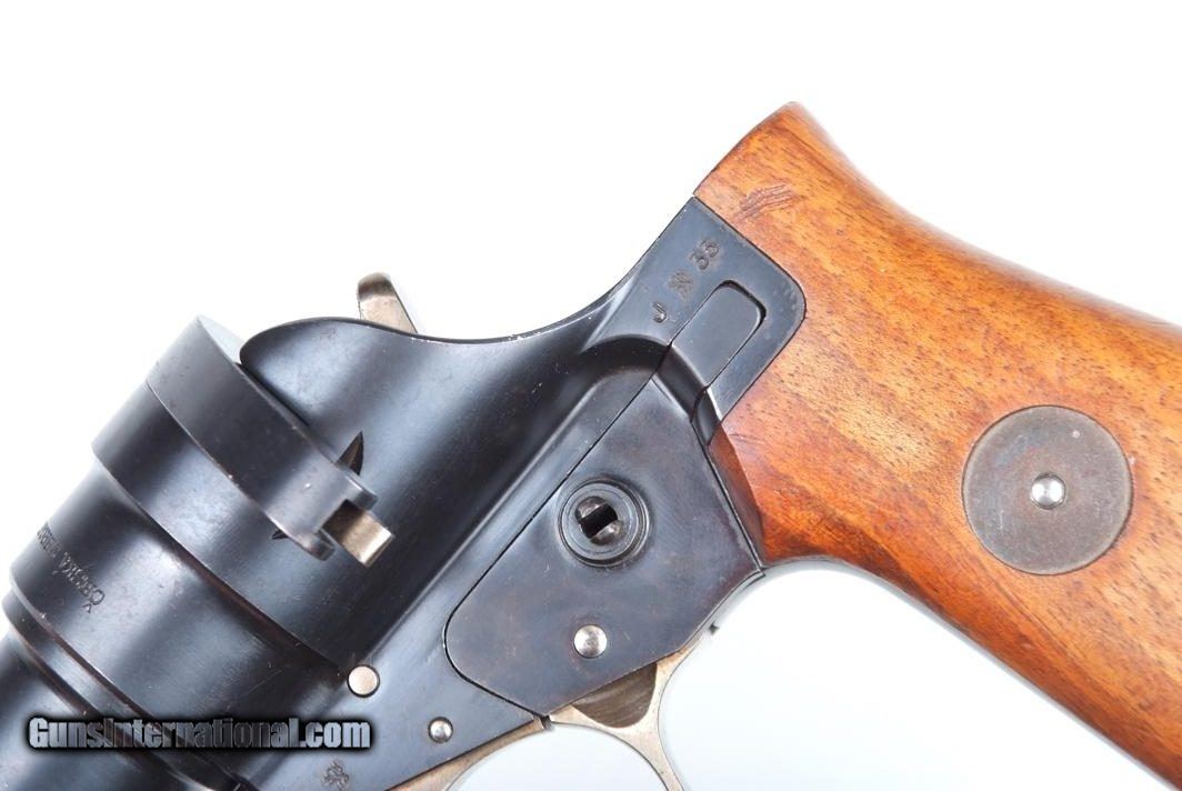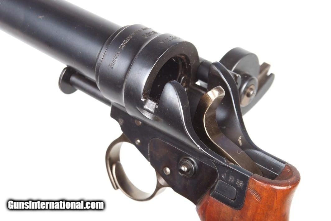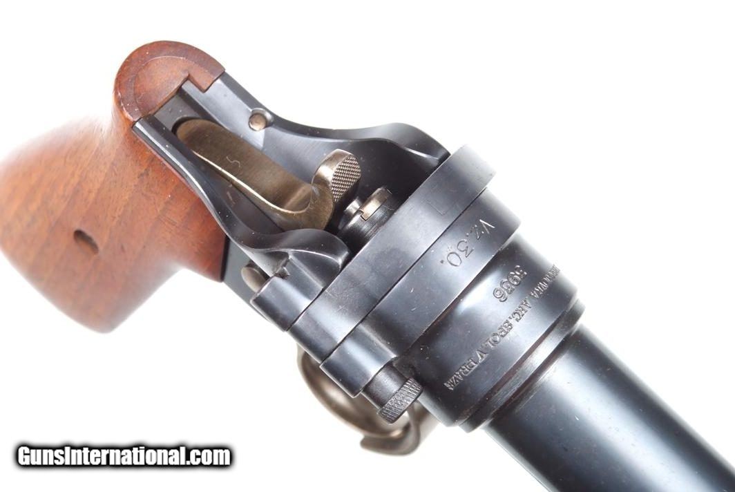 Description: Description: Standard configuration CZ Vz.30 flare pistol with rust blued and strawed metal parts. Manufacturer marked and serial numbered over top of chamber. This example, first year production, dated "33" . Unique breech block that swings to the right side for loading. Empty/unused cartidges extract using the spring loaded plunger under the barrel. Smooth European walnut grips. No regimental markings on disc. Rotatable lanyard ring. Synopsis: CZ, Vz.30, Military flare pistol, produced between 1933-1939, in extraordinary original condition. Condition: 99% bright original rust blue with just the tiniest handling marks. Comparable condition straw though a few stains on front of trigger guard. Mirror bright bore. Perfect manual mechanics. It would be nearly impossible to upgrade this pistol, especially as a first year production gun. SOLD Manufacturer: CZ Serial Number: 3936 Caliber Info: 26.5 |