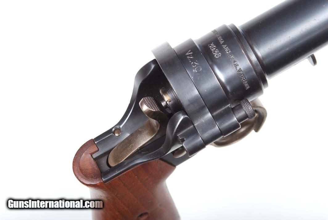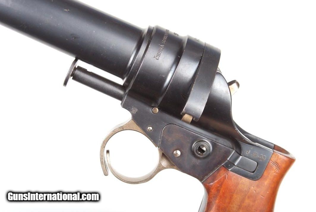 Standard configuration CZ Vz.30 flare pistol with rust blued and strawed metal parts. Manufacturer marked and serial numbered over top of chamber. This example, first year production, dated "33" . Unique breech block that swings to the right side for loading. Empty/unused cartidges extract using the spring loaded plunger under the barrel. Smooth European walnut grips. No regimental markings on disc. Rotatable lanyard ring.
