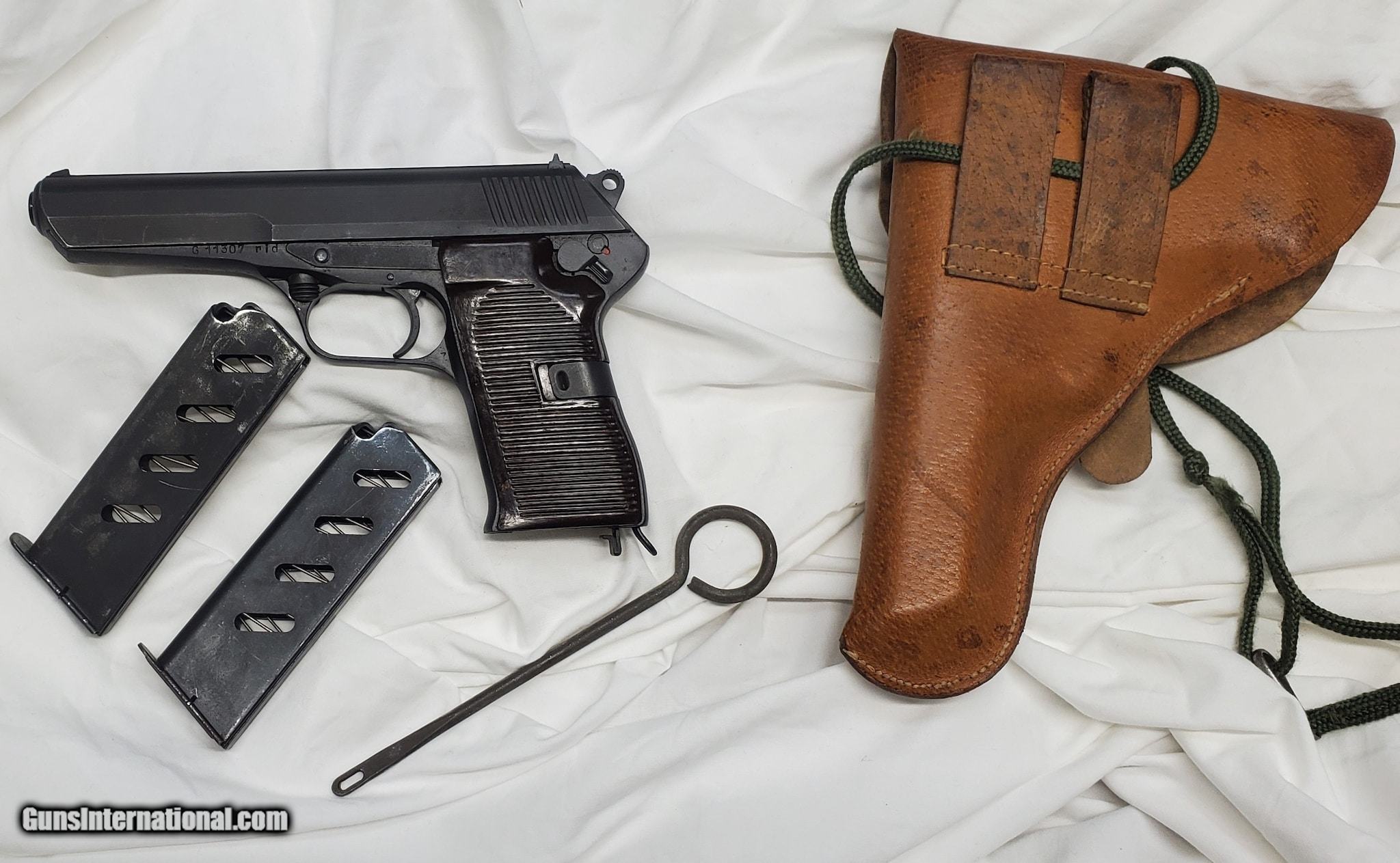 Description: Guns Listing ID: 403679 Make: Ceska Zbrojovka (CZ) Model: 52 Serial Number: g11307 Year of Manufacture: 1953 Caliber: 7.62mmx25 Tokarev Action Type: Single Action, Roller-Locked, Semi-Auto with Removable Magazine Markings: The left side of the frame is marked “G 11307 rid” and the rib on the top of the slide is also marked “G 11307”. The right side of the frame has a Crossed Swords, and “53” date code. The barrel “G 11307”. Barrel Length: 4 3/4” Sights / Optics: The front sight is a blade integral to the top of the rib in the slide. The rear sight is a flat topped \"U\"-notch dovetailed into the top rear of the slide. Stock Configuration & Condition: The grips are serrated reddish brown plastic that are held in place with a steel clip around the back of the grips. The grips show light handling wear with scattered minor marks. There is dried cosmoline in the serrations, they are well defined. There are no chips or cracks. Overall, the grips are in about Very Good condition. Type of Finish: Parkerized Finish Originality: Original Bore Condition: The bore is mostly bright, the rifling is sharp. There is some light erosion in the bore. Overall Condition: The handgun retains about 93% of its metal finish. The finish is slightly thinning at most edges. There are some scattered light nicks and dings. The pinheads range from unmarred to lightly tool marked but not peened. Most markings are clear aside from the previously mentioned faded marking that is difficult to make out. Overall, this pistol is in about Very Fine condition. Box, Paperwork & Accessories: This pistol comes in a CZ-52 leather flap holster with storage for the included extra magazine (total of two) and cleaning rod. The holster has a faded stamp on the inside of the flap. The holster shows scattered light wear, discoloration from oil on the flap, and intact stitching, in about Very Good condition. The magazines have operational wear with intact feed lips and strong springs, in about Very Good condition. SOLD Manufacturer: CZ Model: VZ 52 Caliber Info: 7.62X25MM TOKAREV Condition: Used - Non-Certified Barrels: 4.7 BARREL Finish: BLACK |