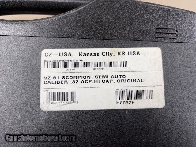 Description: An original and scarce model VZ-61 in .32acp as imported by CZ, complete with original box with label, soft cases, spare magazines, etc. - everything as shown in the photos. Handgun Caliber: .32 ACP (7.65x17mm Browning SR) Price: $999.00 Contact Seller |