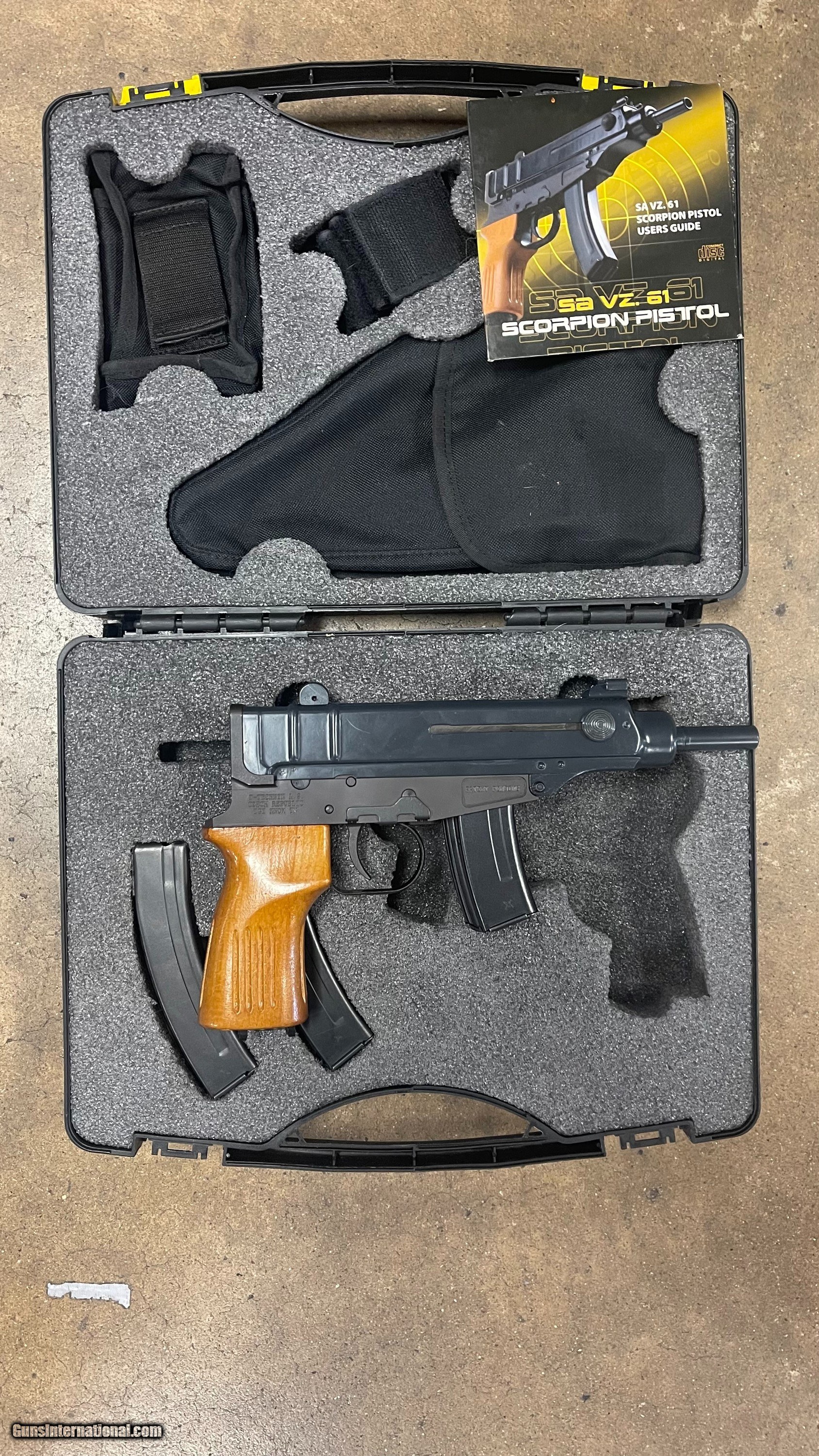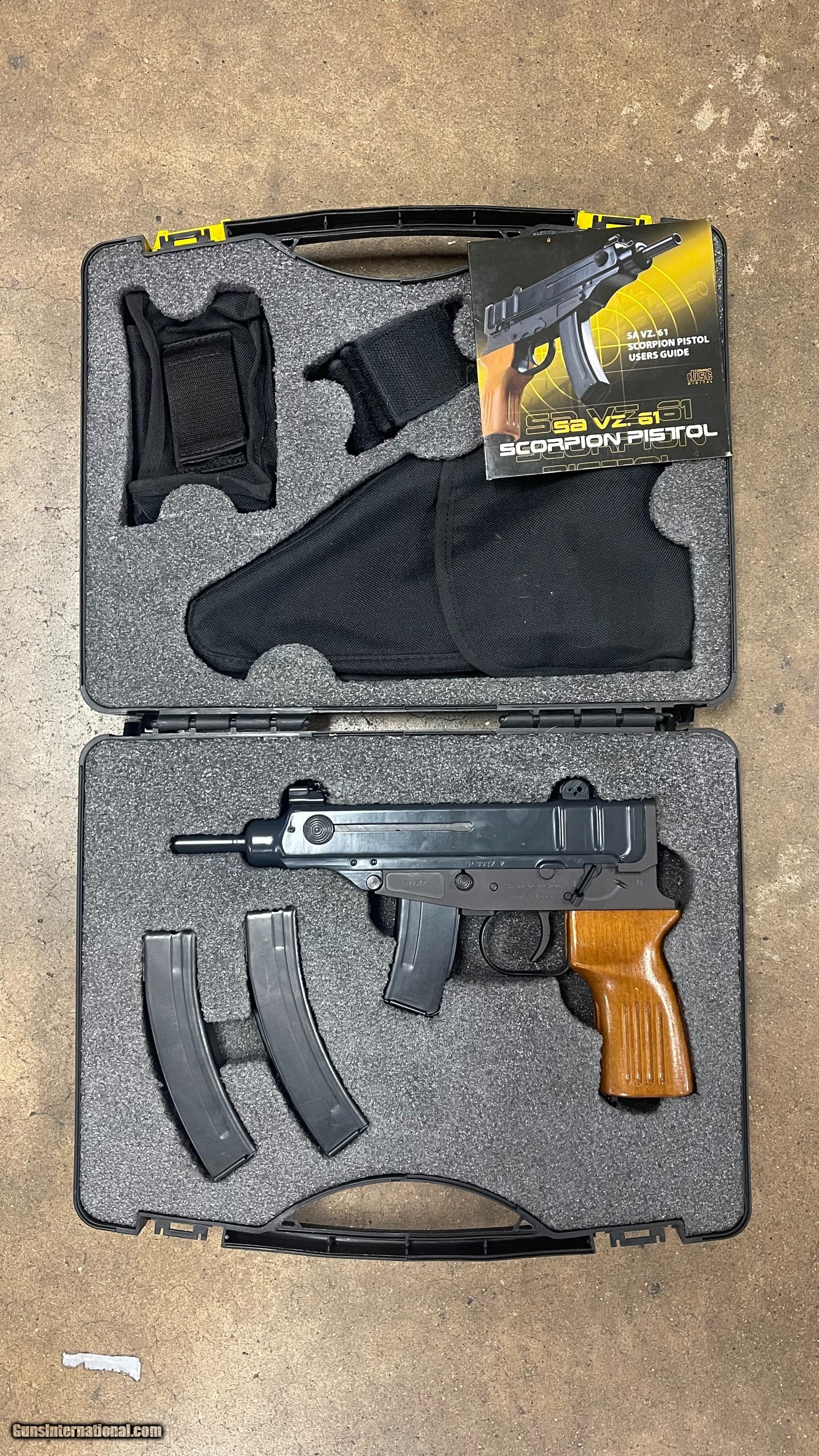 Description: Offered for sale is a Sa vz.61 Scorpion in EXCELLENT condition! It is chambered in 32 ACP and sports a 4.5" barrel. This Sa vz.61 Scorpion ships in the original case and comes with a soft case, one 10-round magazine, two 20-round magazines, a drop leg holster, and a sling. SOLD |