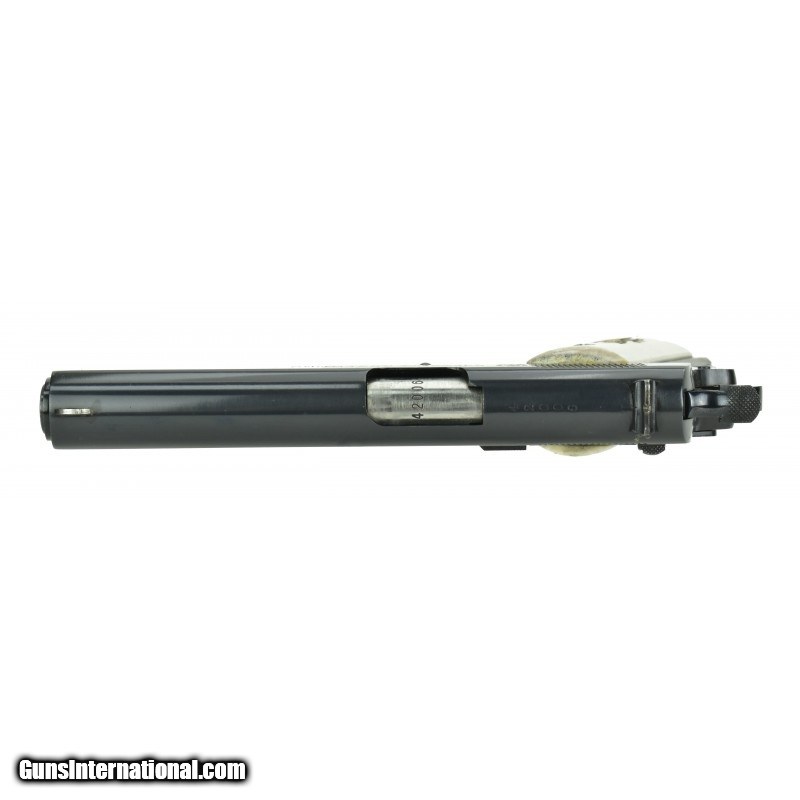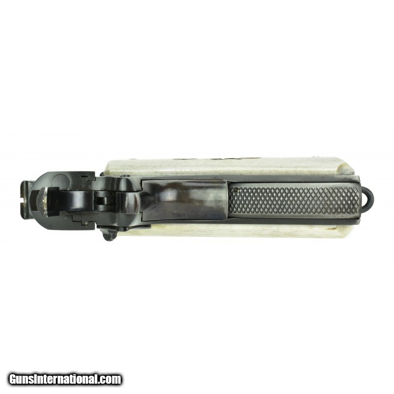 DGFM 1927 .45 ACP caliber pistol. Very fine, non-refurbished Argentine military pistol. Slide is inscribed with Max R. Turner. Approximately 97% original finish. Pistol has beautiful stag grips. Excellent overall condition.
