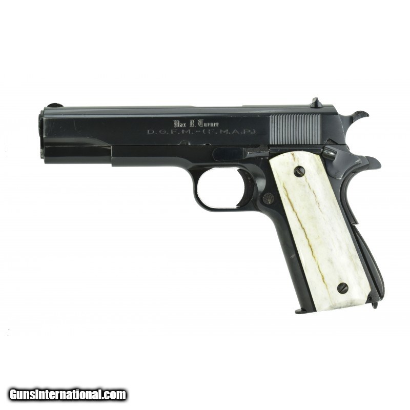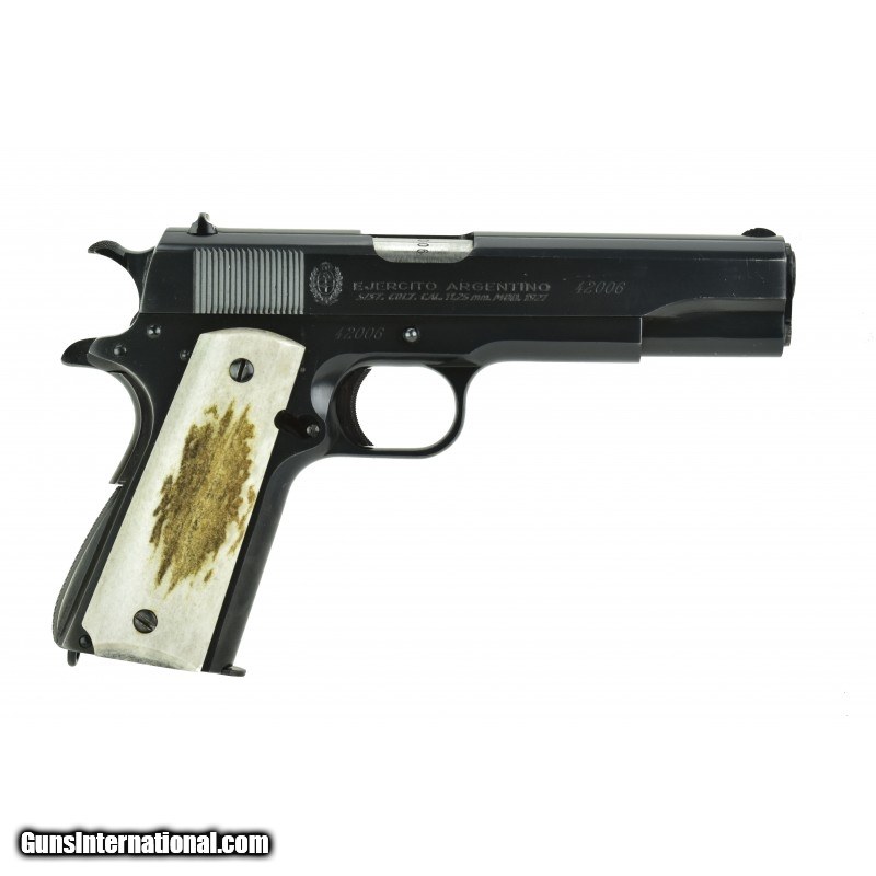 Description: " DGFM 1927 .45 ACP caliber pistol. Very fine, non-refurbished Argentine military pistol. Slide is inscribed with Max R. Turner. Approximately 97% original finish. Pistol has beautiful stag grips. Excellent overall condition. SOLD |