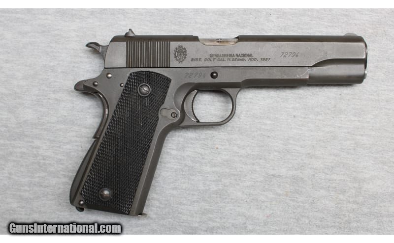 Description: Argentine DGFM-FMAP Sistema Colt 1927 semi-automatic pistol in .45 acp. Serial number-72794. This pistol was built under Colt Manufacturing License in Argentina, the Sistema Colts were not Colt clones but identical to 1911A1 pistols produced by Colt. Top quality steel was used in the construction, and they are known to be as tough and reliable as those made in the USA. This pistol was made at the FMAP factory and is marked with the Argentine crest and "Ejercito Argentino", indicating it was issued to the Army. Note: 11.25mm is synonymous with .45acp. Comes with one magazine. .45 ACP SOLD Metal Condition: Very good Bore Condition: Bright Barrels: 5 Inches Triggers: Factory Sights: Fixed Item Location: La Vista, NE |