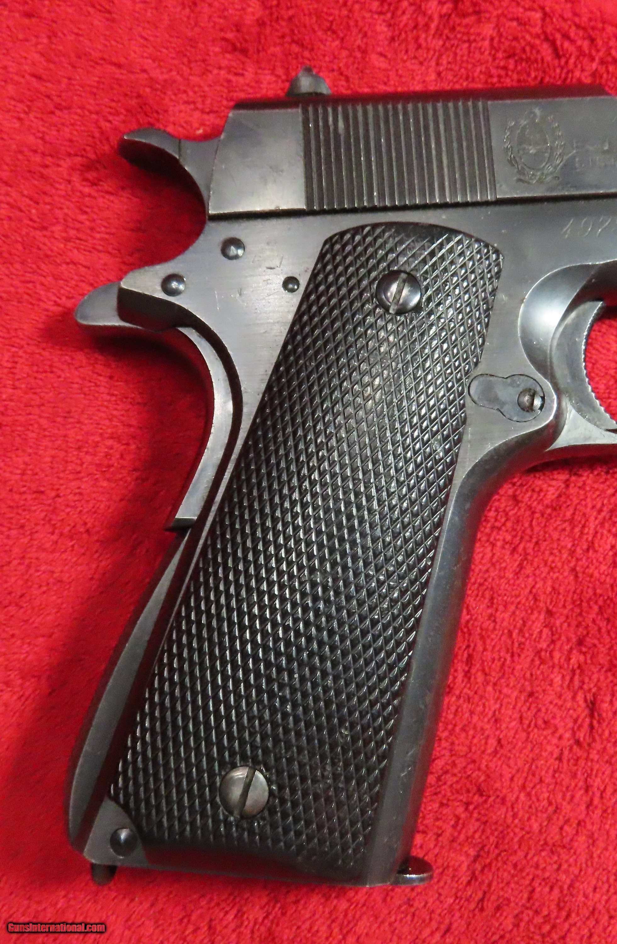 Description: Excellent Condition .45 ACP DGFM Argentine with 5" barrel. Made in 1949. $30.00 Shipping C&R required for shipping; All items shipped Priority Mail Please contact Gloria at 540-613-2077 (after 12 noon eastern time) or email commonwealthcollectiblesyahoo 4% Credit Card Fee Thanks for looking! SOLD Curio/Relic: Yes Model: 1911 Serial Number: 49754 Barrel Length: 5 Condition: Excellent Bore Condition: Excellent Finish: Blue |