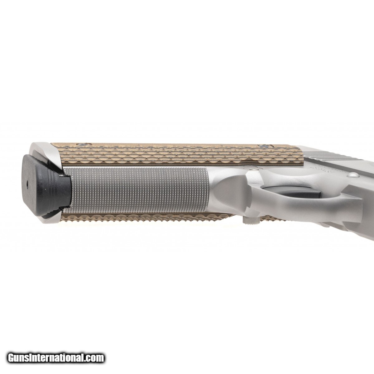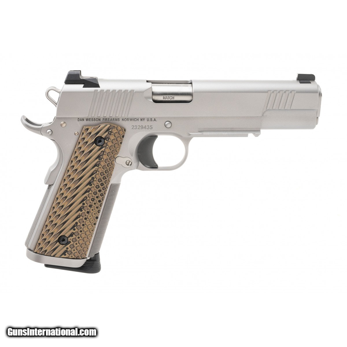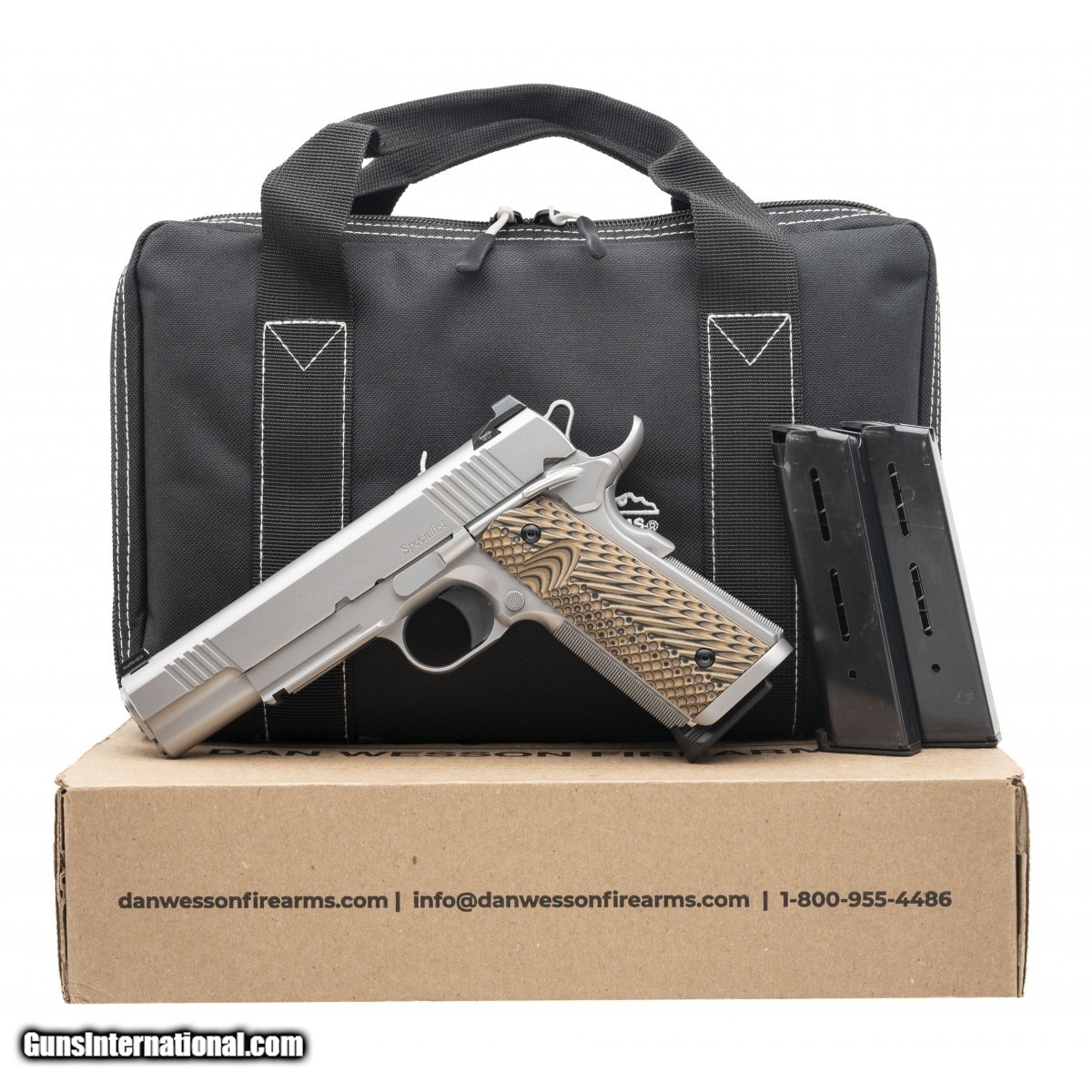 Description: "SN: 2329435. Modern production. .45 ACP with a 5"" barrel. Bore is in excellent condition. Dan Wesson full size 1911 stainless steel frame pistol. Metal is in excellent condition. G10 Grips are in excellent condition. Overall condition is excellent. Comes with range bag and two extra magazines. SOLD |